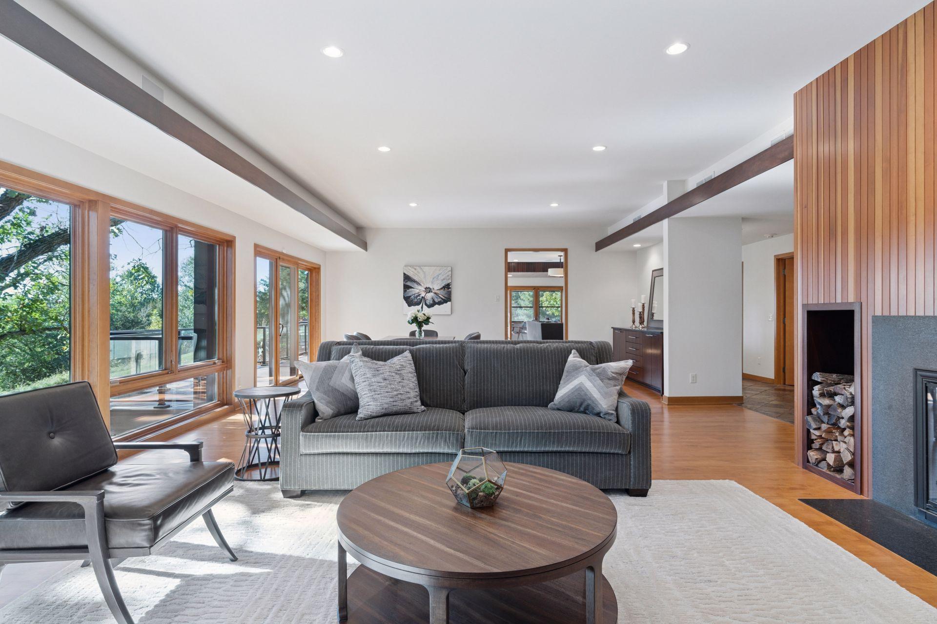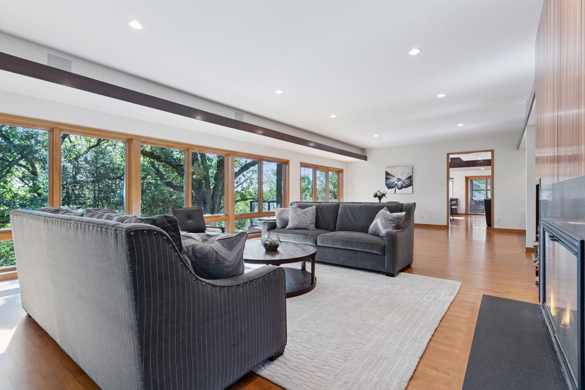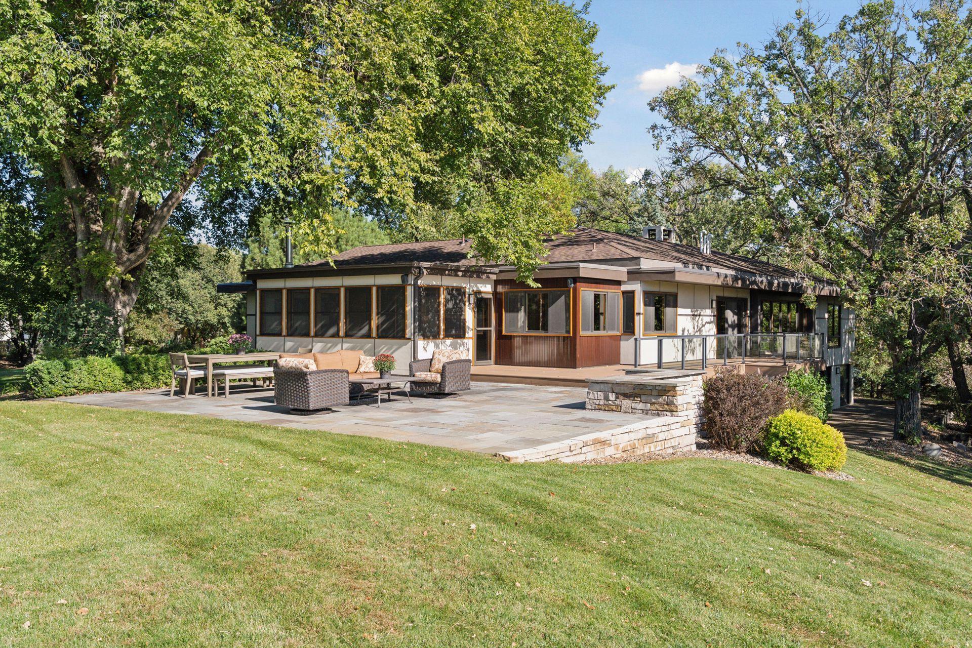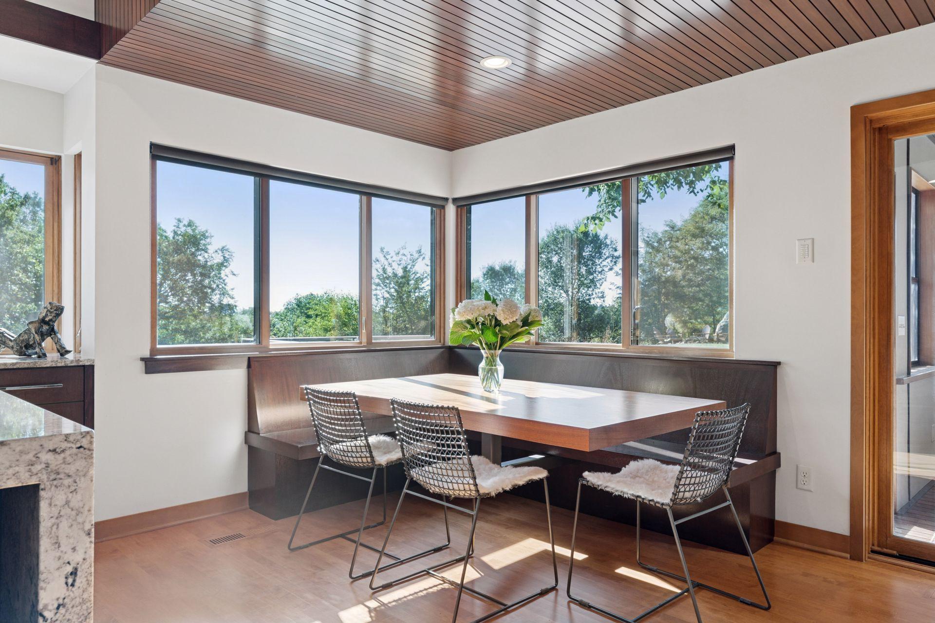 Set upon a breathtaking, south facing, 1.14 acres overlooking the Purgatory Creek Conservation Area this stunning prairie influenced 1-level walkout home is a testament to timeless architecture and flawless craftsmanship. Upon entering you are greeted with a crisp, mid-century modern design with vaulted ceilings, hardwood floors and newer floor-to-ceiling windows that capture its picturesque natural panorama. A recently remodeled living/formal dining room centers around a stunning, wood-burning fireplace with custom wood surround, complemented by a built-in buffet, wood accents, soffit detailing and lighting. The top-of-the line kitchen is a showpiece featuring Miele appliances, a granite waterfall center island with seating, granite backsplash, custom cabinetry, built-in informal dining room nook and an adjoining hearth room with built-in media center. The tranquil three-season porch is anchored by a hearthstone fireplace and seamlessly flows to the patio and level yard. The main level Owner’s suite is a spacious sanctuary that boasts a vaulted ceiling, soffit lighting, floor-to-ceiling windows, walk-in closet and full bathroom. The main level also hosts a hard-to-find additional bedroom or possible office with private full bathroom ideal for guests. The walkout lower level is perfect for entertaining offering a recently remodeled family room with wood burning fireplace, billiards/game area, three spacious bedrooms with a full bathroom and large storage room. The renovated exterior showcases James Hardie siding, wood and metal accent detailing, numerous new Marvin windows, new maintenance free deck and low voltage lighting that truly creates a one-of-a kind ambiance while preserving its prairie-inspired architectural aesthetic. With its extensive list of improvements and rare combination of pedigree, modern updates, and private, natural setting, this property is truly one of a kind and an absolute must-see.