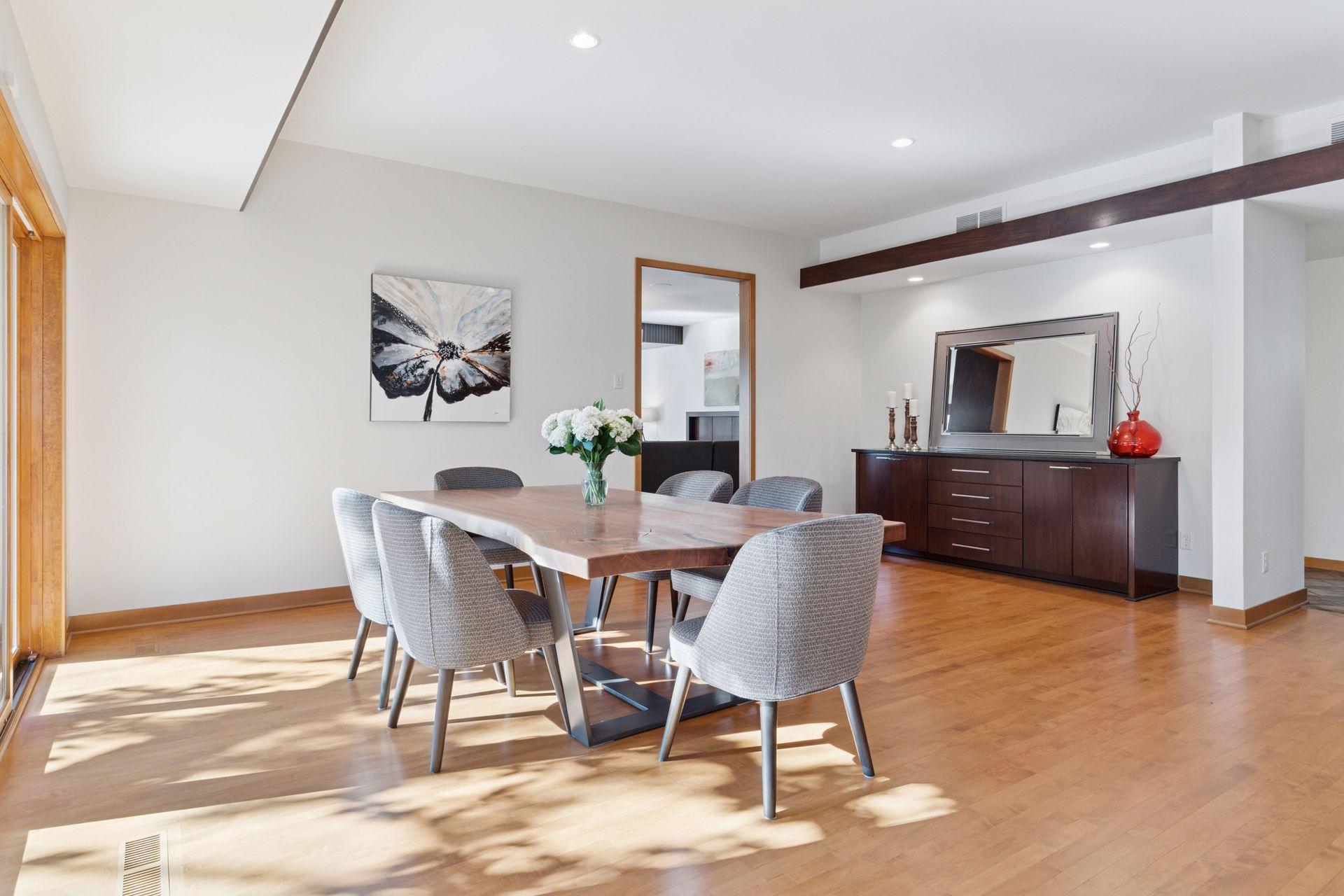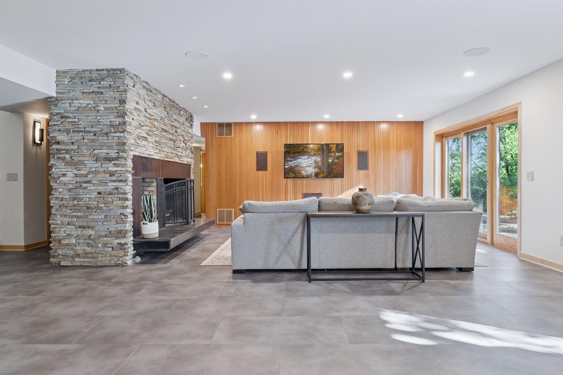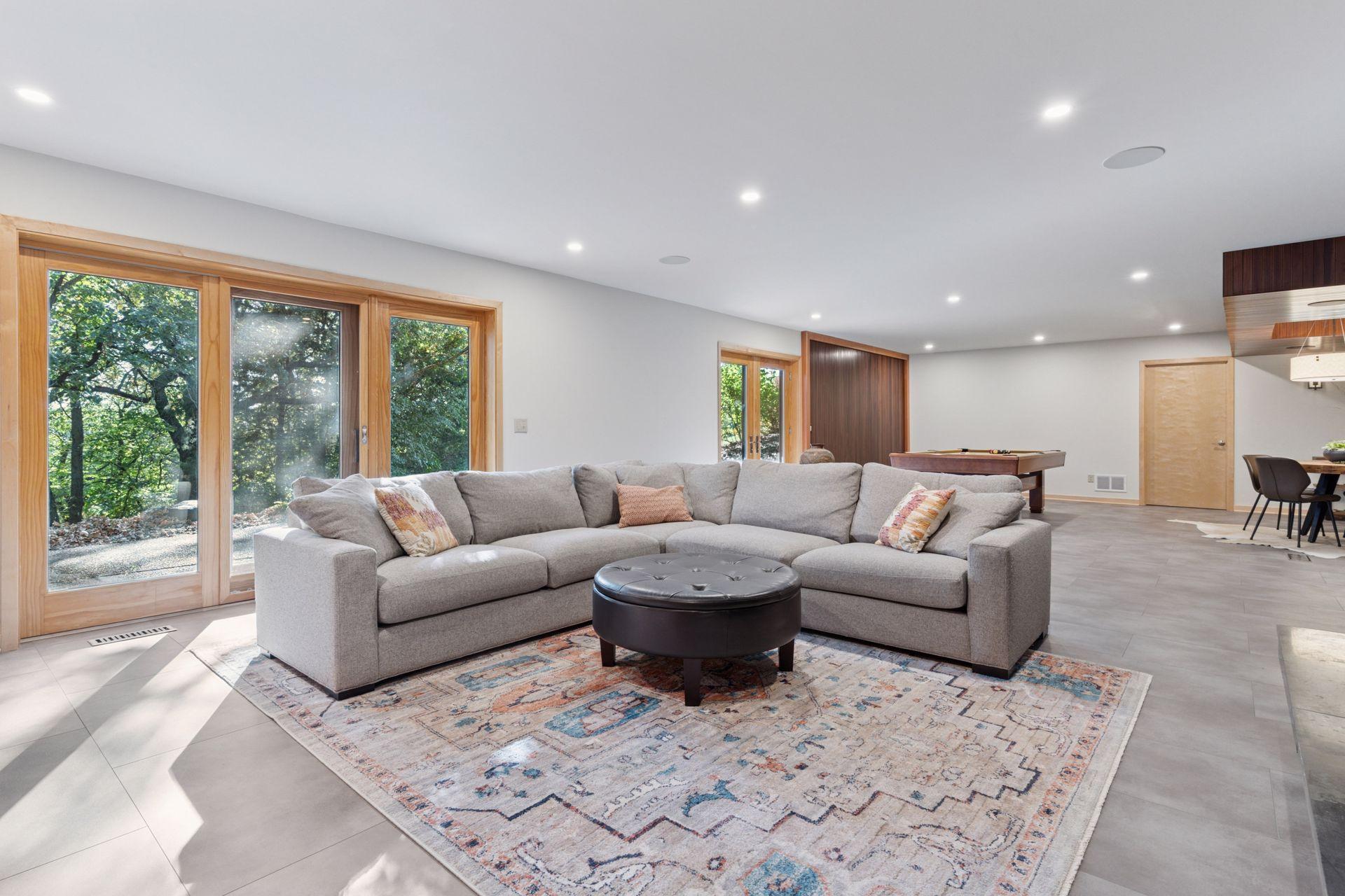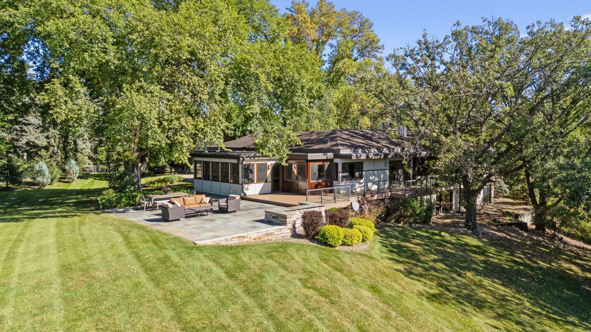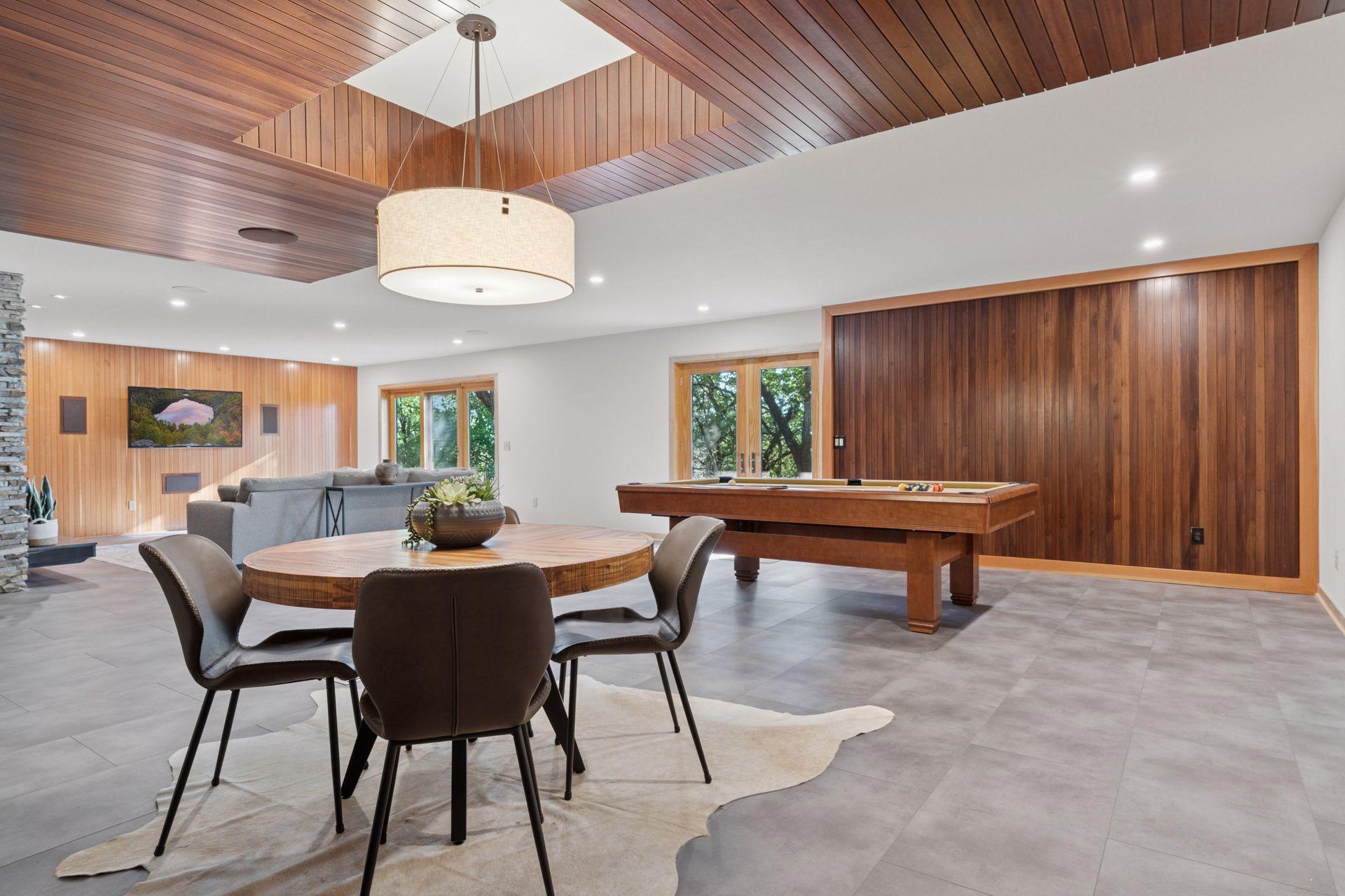 Set upon a breathtaking, south facing, 1.14 acres overlooking the Purgatory Creek Conservation Area this stunning prairie influenced 1-level walkout home is a testament to timeless architecture and flawless craftsmanship. Upon entering you are greeted with a crisp, mid-century modern design with vaulted ceilings, hardwood floors and newer floor-to-ceiling windows that capture its picturesque natural panorama. A recently remodeled living/formal dining room centers around a stunning, wood-burning fireplace with custom wood surround, complemented by a built-in buffet, wood accents, soffit detailing and lighting. The top-of-the line kitchen is a showpiece featuring Miele appliances, a granite waterfall center island with seating, granite backsplash, custom cabinetry, built-in informal dining room nook and an adjoining hearth room with built-in media center. The tranquil three-season porch is anchored by a hearthstone fireplace and seamlessly flows to the patio and level yard. The main level Owner’s suite is a spacious sanctuary that boasts a vaulted ceiling, soffit lighting, floor-to-ceiling windows, walk-in closet and full bathroom. The main level also hosts a hard-to-find additional bedroom or possible office with private full bathroom ideal for guests. The walkout lower level is perfect for entertaining offering a recently remodeled family room with wood burning fireplace, billiards/game area, three spacious bedrooms with a full bathroom and large storage room. The renovated exterior showcases James Hardie siding, wood and metal accent detailing, numerous new Marvin windows, new maintenance free deck and low voltage lighting that truly creates a one-of-a kind ambiance while preserving its prairie-inspired architectural aesthetic. With its extensive list of improvements and rare combination of pedigree, modern updates, and private, natural setting, this property is truly one of a kind and an absolute must-see.