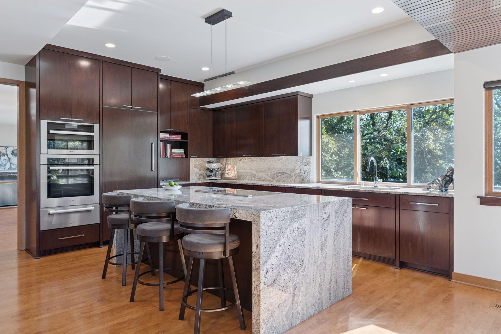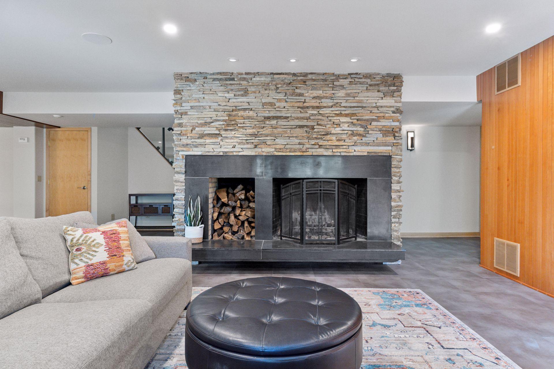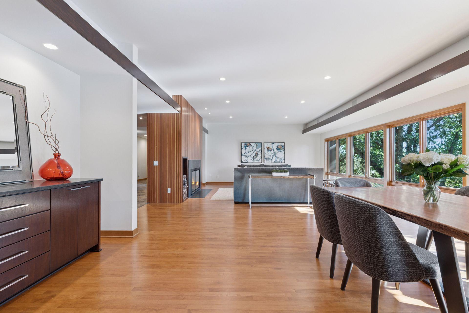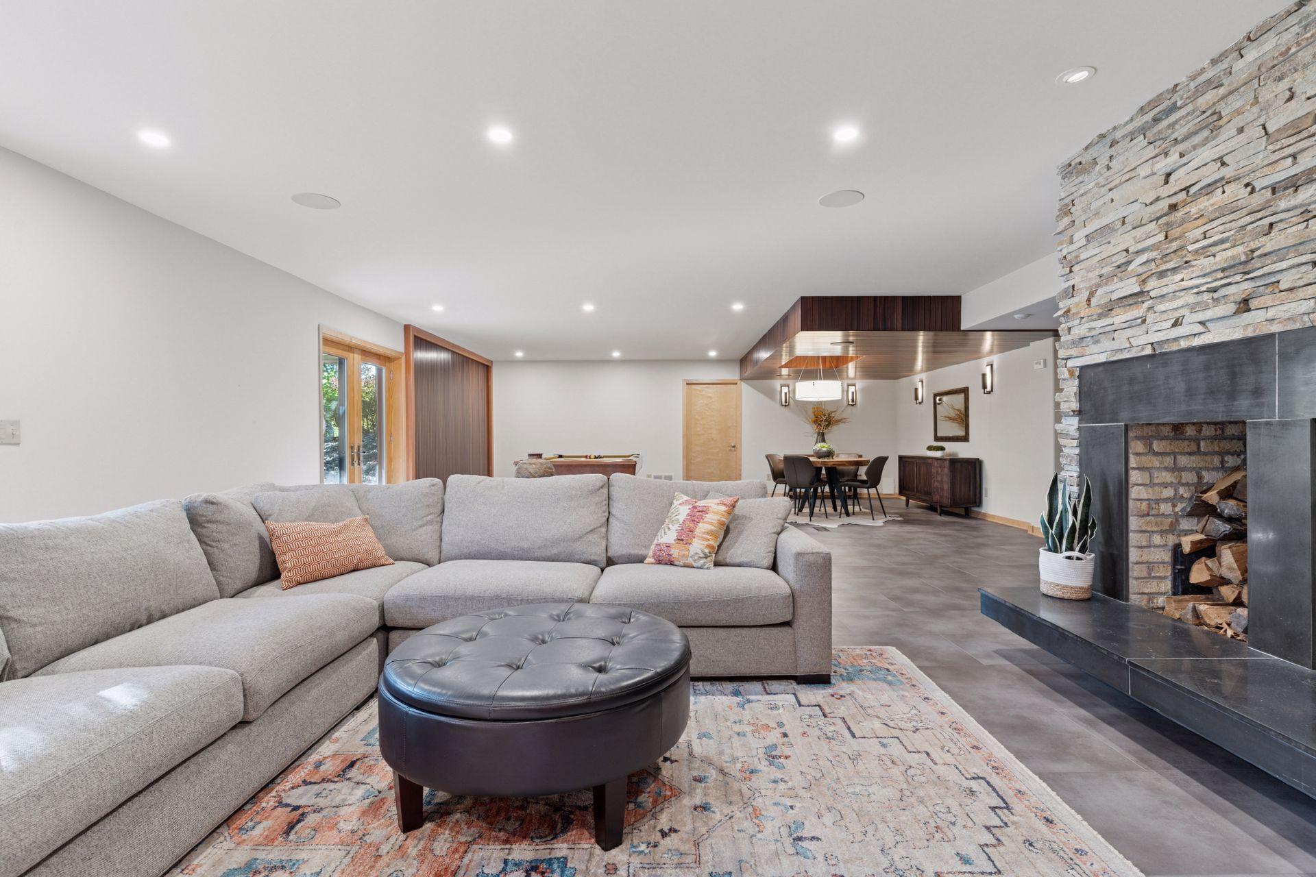 Set upon a breathtaking, south facing, 1.14 acres overlooking the Purgatory Creek Conservation Area this stunning prairie influenced 1-level walkout home is a testament to timeless architecture and flawless craftsmanship. Upon entering you are greeted with a crisp, mid-century modern design with vaulted ceilings, hardwood floors and newer floor-to-ceiling windows that capture its picturesque natural panorama. A recently remodeled living/formal dining room centers around a stunning, wood-burning fireplace with custom wood surround, complemented by a built-in buffet, wood accents, soffit detailing and lighting. The top-of-the line kitchen is a showpiece featuring Miele appliances, a granite waterfall center island with seating, granite backsplash, custom cabinetry, built-in informal dining room nook and an adjoining hearth room with built-in media center. The tranquil three-season porch is anchored by a hearthstone fireplace and seamlessly flows to the patio and level yard. The main level Owner’s suite is a spacious sanctuary that boasts a vaulted ceiling, soffit lighting, floor-to-ceiling windows, walk-in closet and full bathroom. The main level also hosts a hard-to-find additional bedroom or possible office with private full bathroom ideal for guests. The walkout lower level is perfect for entertaining offering a recently remodeled family room with wood burning fireplace, billiards/game area, three spacious bedrooms with a full bathroom and large storage room. The renovated exterior showcases James Hardie siding, wood and metal accent detailing, numerous new Marvin windows, new maintenance free deck and low voltage lighting that truly creates a one-of-a kind ambiance while preserving its prairie-inspired architectural aesthetic. With its extensive list of improvements and rare combination of pedigree, modern updates, and private, natural setting, this property is truly one of a kind and an absolute must-see.