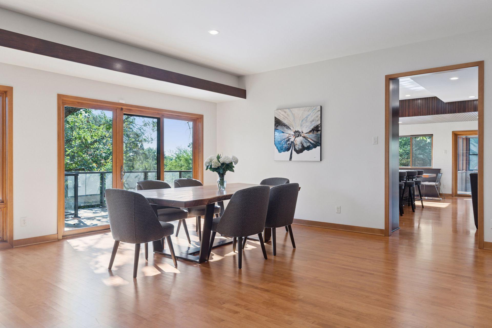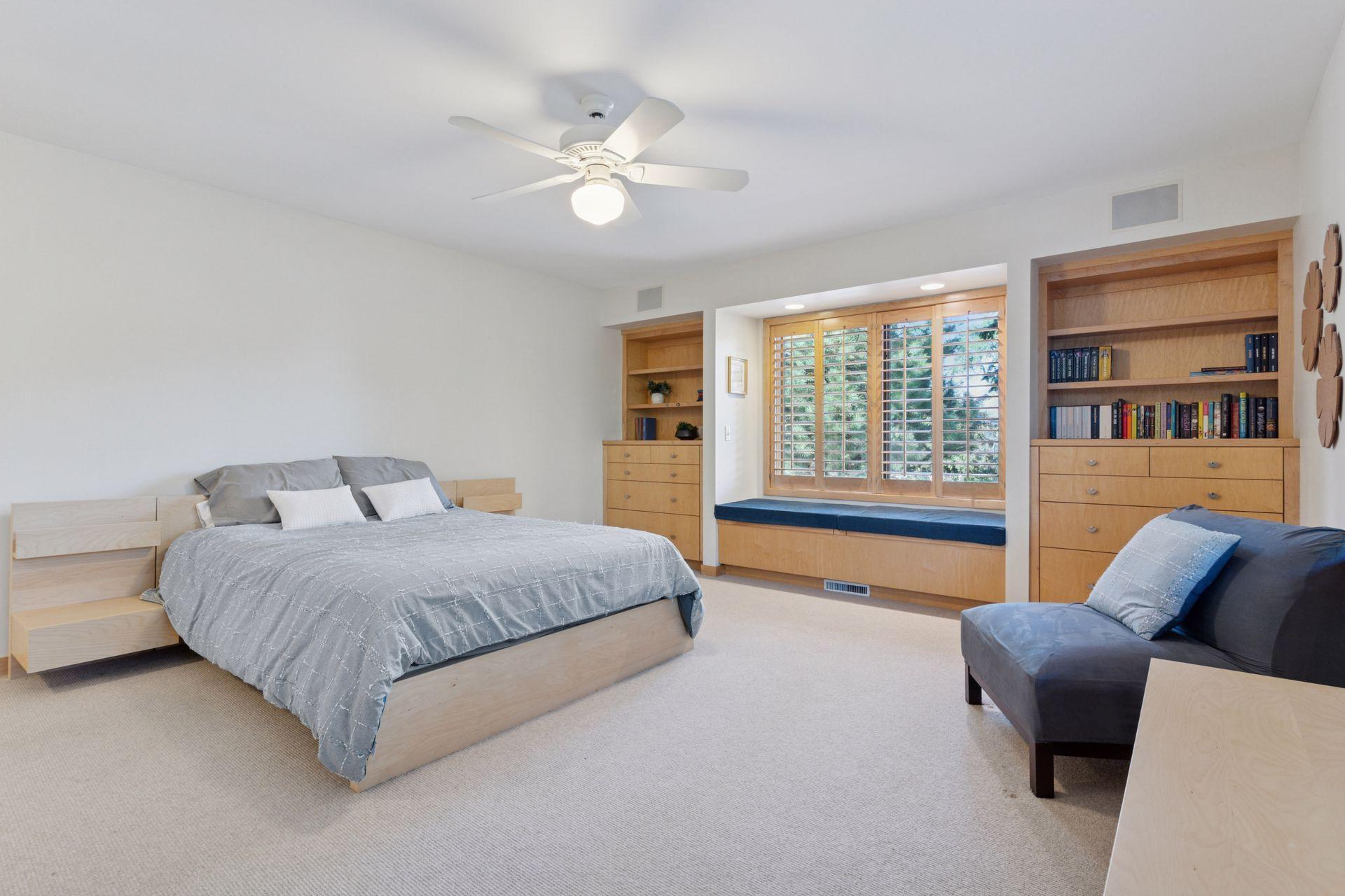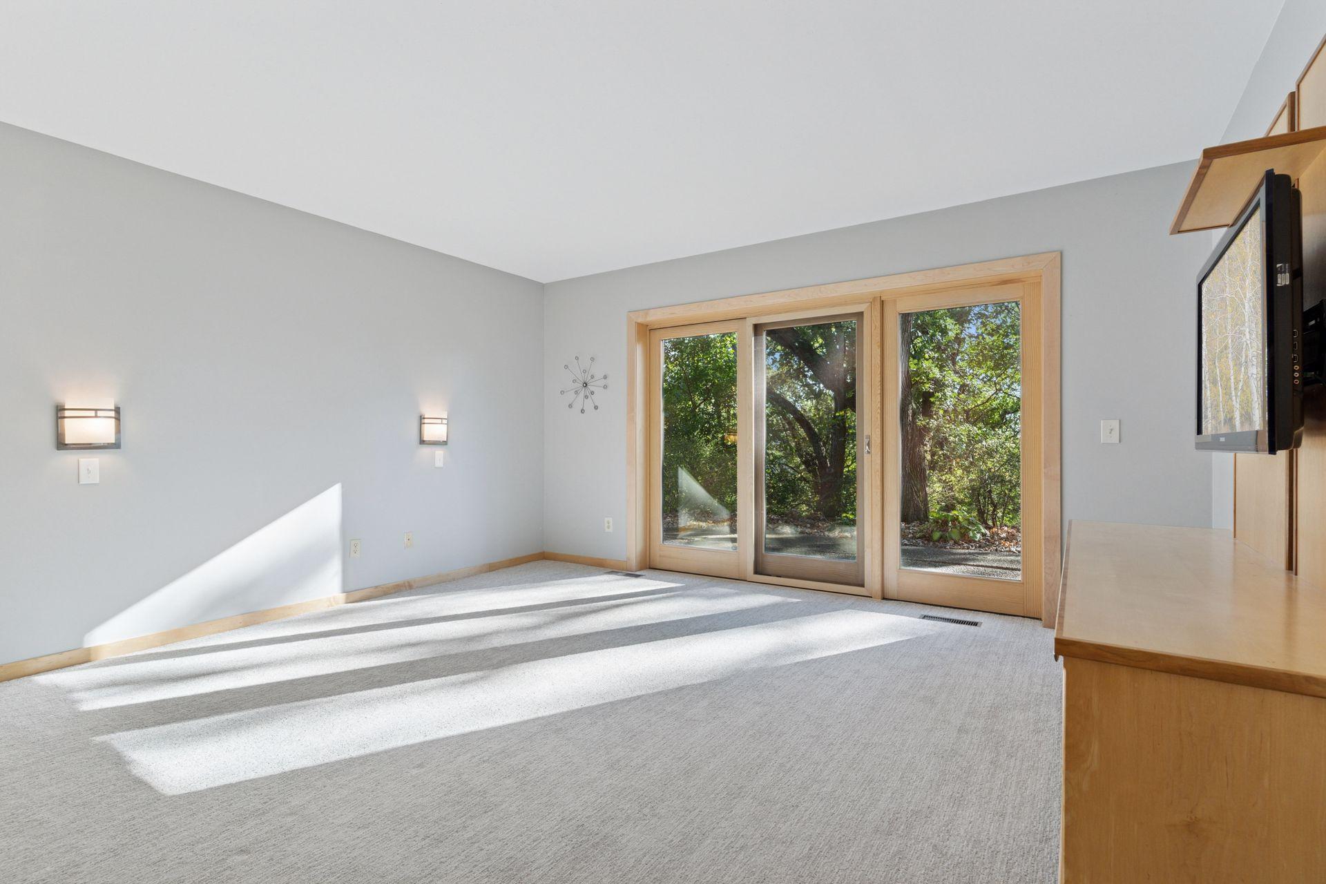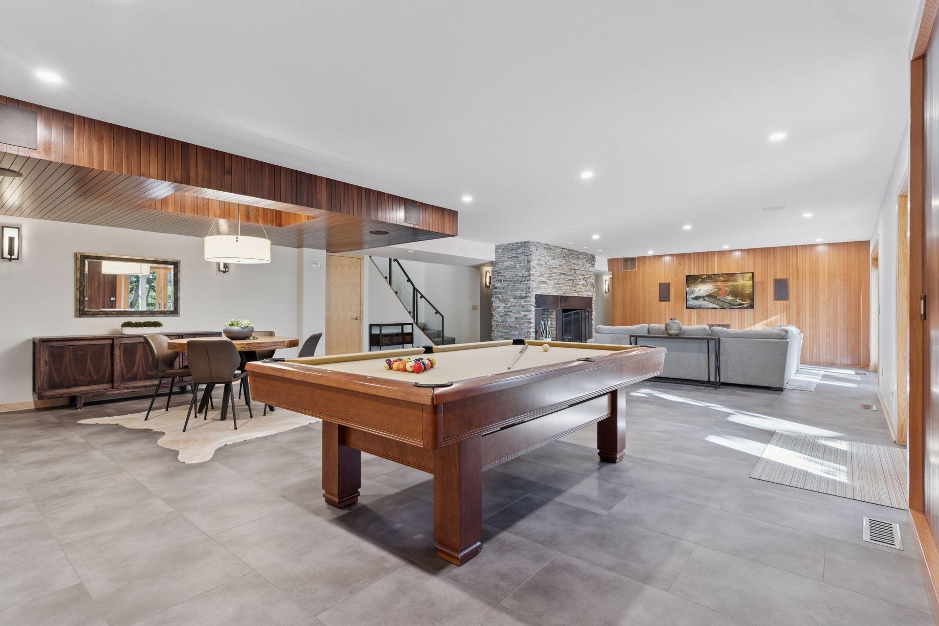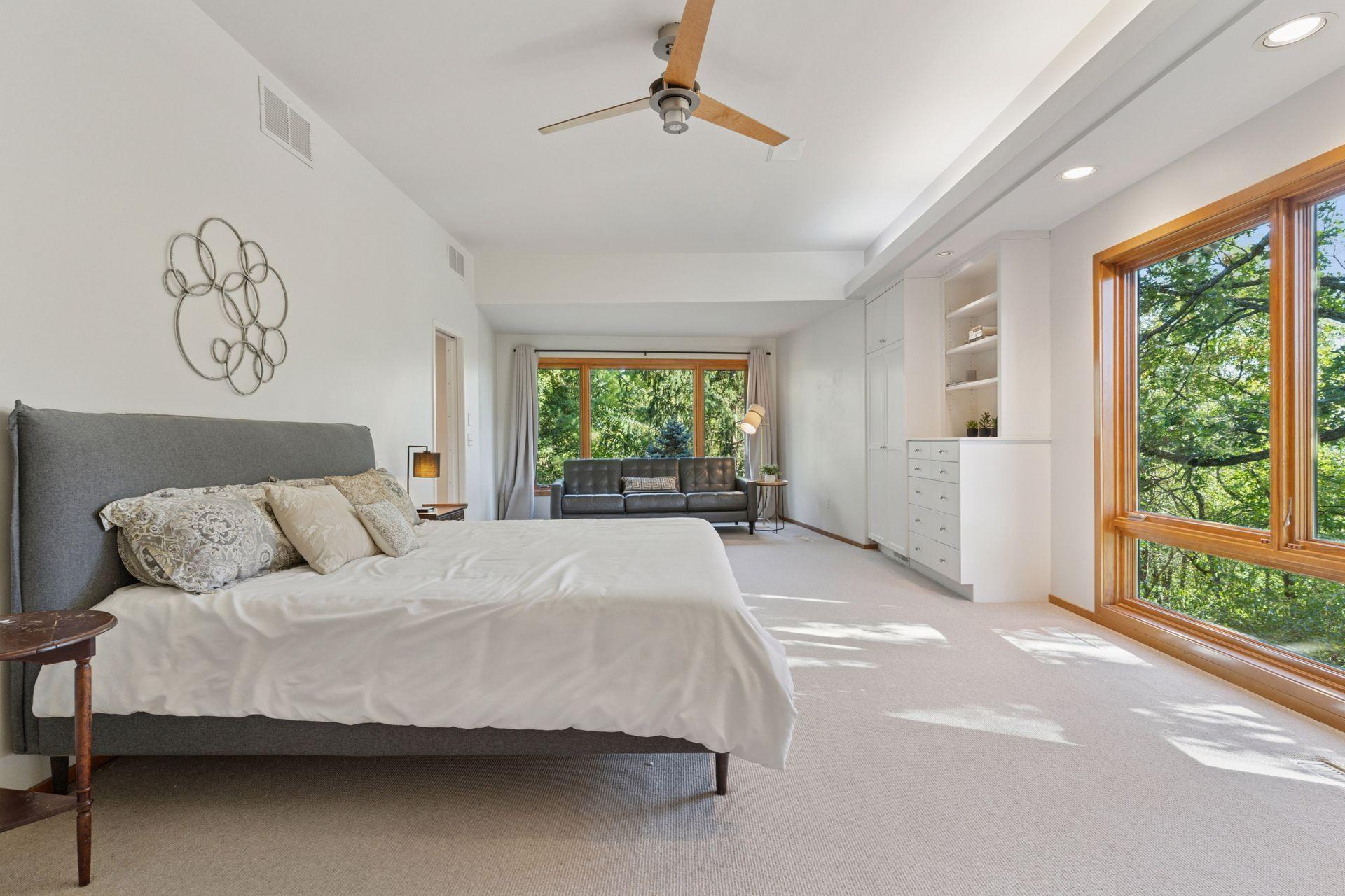 Set upon a breathtaking, south facing, 1.14 acres overlooking the Purgatory Creek Conservation Area this stunning prairie influenced 1-level walkout home is a testament to timeless architecture and flawless craftsmanship. Upon entering you are greeted with a crisp, mid-century modern design with vaulted ceilings, hardwood floors and newer floor-to-ceiling windows that capture its picturesque natural panorama. A recently remodeled living/formal dining room centers around a stunning, wood-burning fireplace with custom wood surround, complemented by a built-in buffet, wood accents, soffit detailing and lighting. The top-of-the line kitchen is a showpiece featuring Miele appliances, a granite waterfall center island with seating, granite backsplash, custom cabinetry, built-in informal dining room nook and an adjoining hearth room with built-in media center. The tranquil three-season porch is anchored by a hearthstone fireplace and seamlessly flows to the patio and level yard. The main level Owner’s suite is a spacious sanctuary that boasts a vaulted ceiling, soffit lighting, floor-to-ceiling windows, walk-in closet and full bathroom. The main level also hosts a hard-to-find additional bedroom or possible office with private full bathroom ideal for guests. The walkout lower level is perfect for entertaining offering a recently remodeled family room with wood burning fireplace, billiards/game area, three spacious bedrooms with a full bathroom and large storage room. The renovated exterior showcases James Hardie siding, wood and metal accent detailing, numerous new Marvin windows, new maintenance free deck and low voltage lighting that truly creates a one-of-a kind ambiance while preserving its prairie-inspired architectural aesthetic. With its extensive list of improvements and rare combination of pedigree, modern updates, and private, natural setting, this property is truly one of a kind and an absolute must-see.