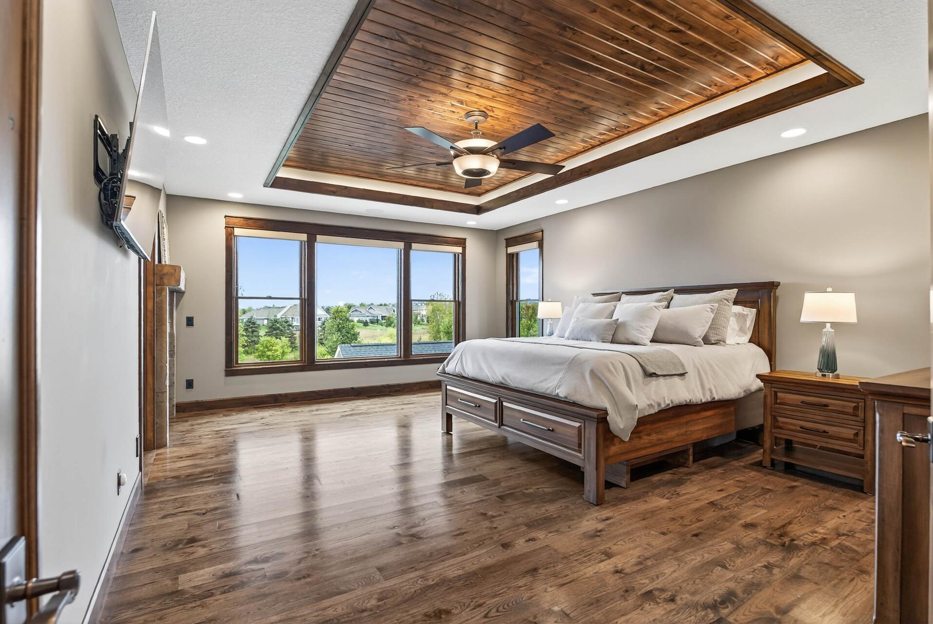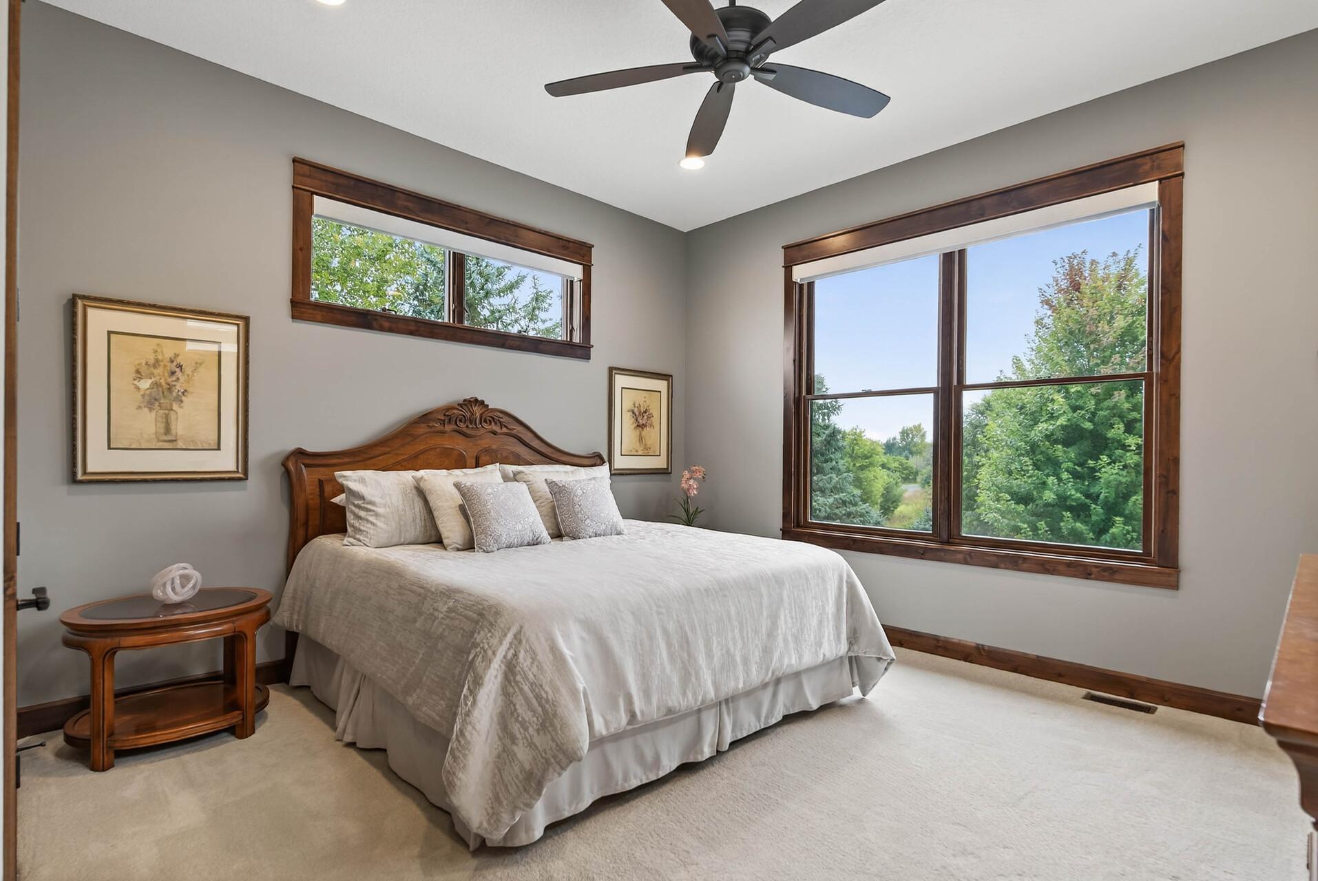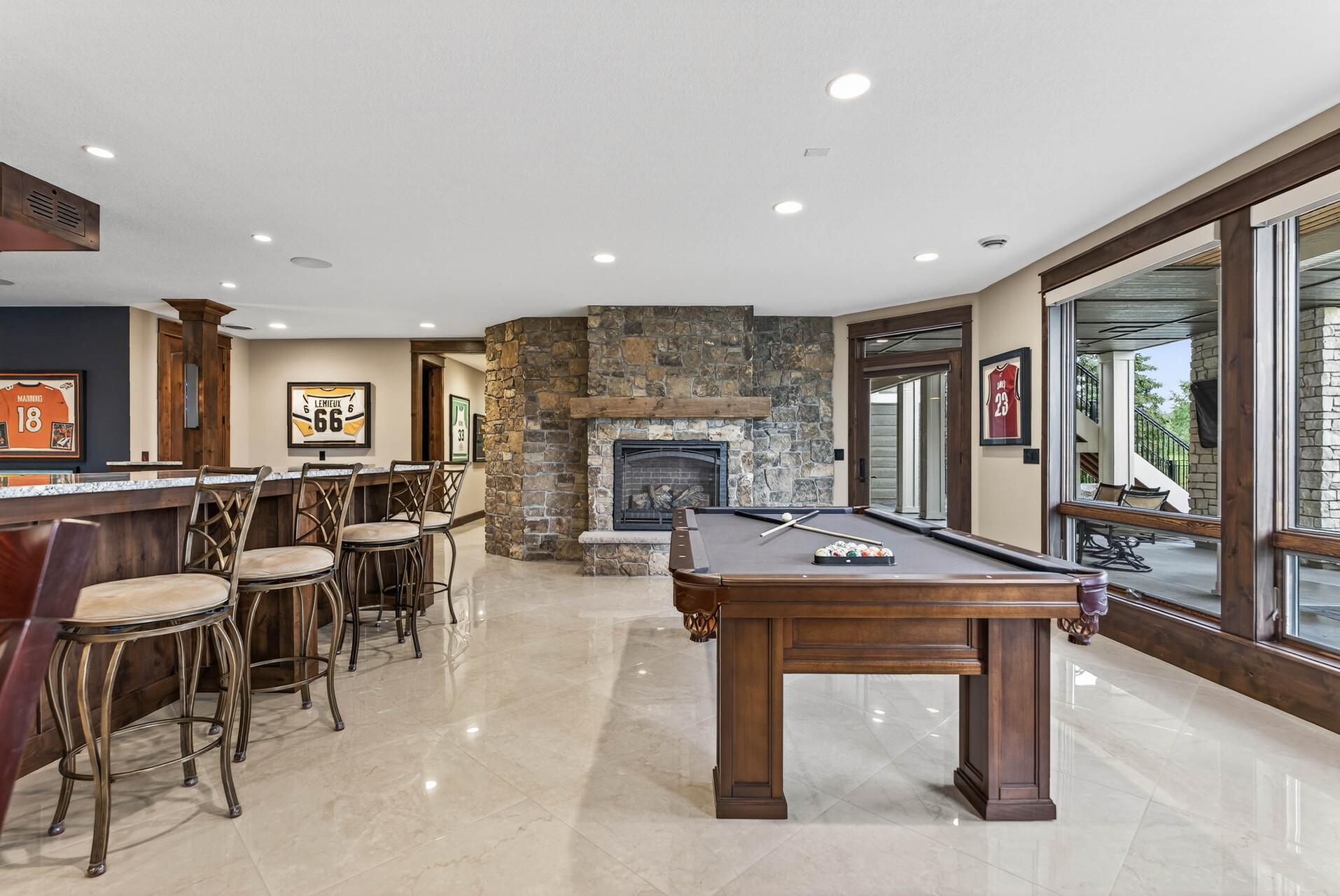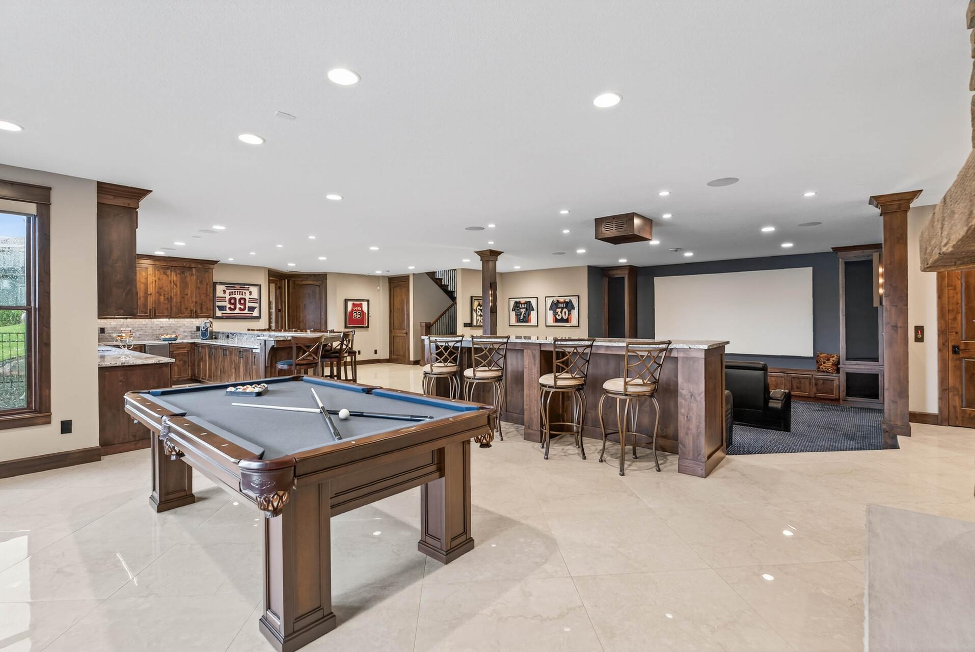 Set high on a hill in a private Lake Elmo neighborhood, this extraordinary custom-built estate offers nearly 10,000 finished square feet with six bedrooms, seven bathrooms, and an elevator serving every level. Designed with uncompromising craftsmanship, the home blends refined luxury with a warm, inviting atmosphere, creating a residence as functional as it is breathtaking. The entry opens through custom double doors into a dramatic two-story great room, where floor-to-ceiling windows frame serene views and a striking stone fireplace anchors the space. Hickory wood floors, rich millwork, and ten-foot ceilings add timeless elegance throughout the main level. At the heart of the home, the chef’s kitchen is both stunning and practical, featuring Alder cabinetry milled on site, granite countertops, double ovens, and Thermador appliances. A ten-foot island with seating encourages connection, while a walk-in pantry and beverage station add convenience. The adjacent dining room flows into a three-season cedar sunroom with fireplace and deck access, ideal for year-round enjoyment. A private mother-in-law suite offers complete independence with its own entrance, garage, full kitchen, laundry, and deck—perfect for guests or residents. Upstairs, the primary suite is a true retreat with an Alder wood tray ceiling, double-sided fireplace, spa-inspired bath, and expansive custom closet. Three additional bedrooms, each thoughtfully designed with private bathrooms, plus a nearby laundry room, complete the upper level. The lower level is an entertainer’s dream with heated floors, a full bar, tiered theater, recreation room with fireplace, 700+ bottle wine cellar, steam shower spa, second laundry room, and walkout access to the pool deck. Outdoors, a resort-worthy pool and pool house offer soaring cedar ceilings, a wood-burning fireplace, grill, powered screens, and built-in speakers. Every detail, from powered window shades to whole-home water purification, reflects thoughtful design and elevated living. This estate is more than a home—it’s a rare opportunity to experience everyday life as extraordinary.