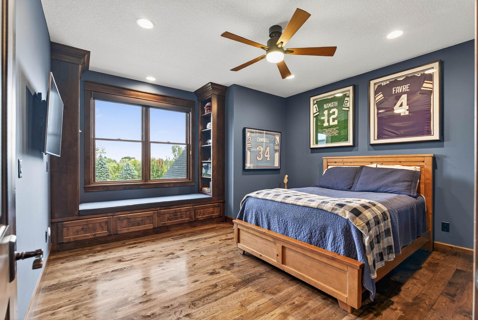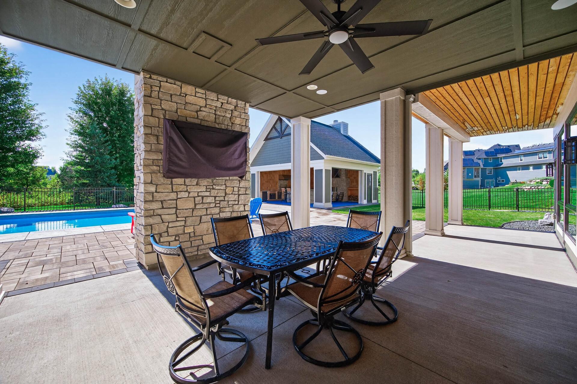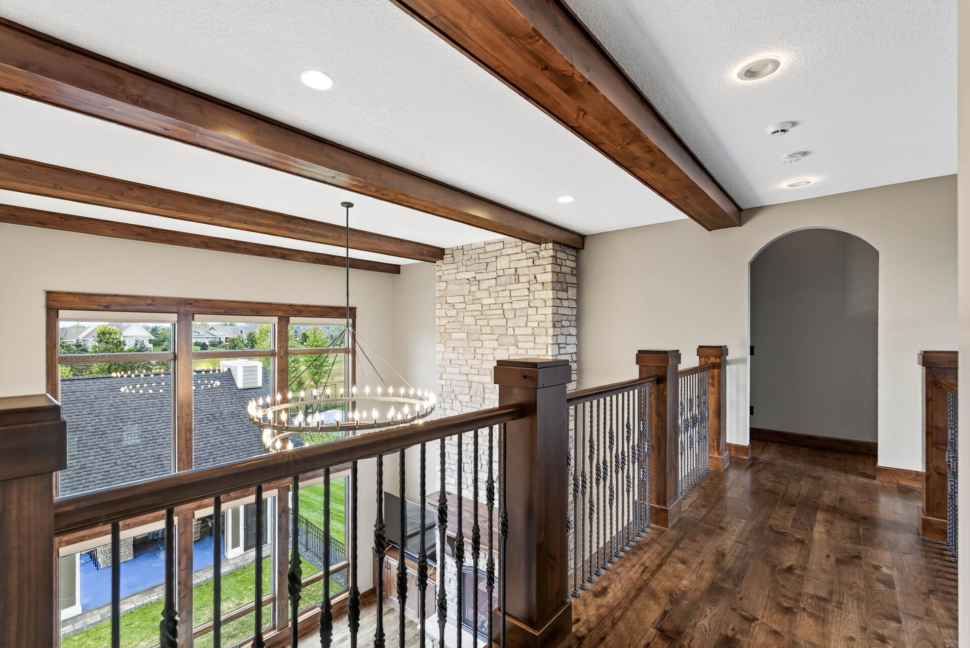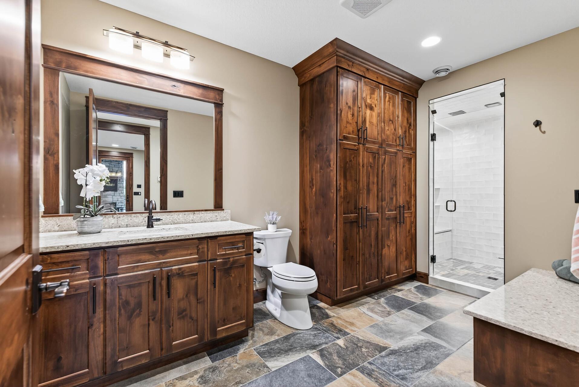 Set high on a hill in a private Lake Elmo neighborhood, this extraordinary custom-built estate offers nearly 10,000 finished square feet with six bedrooms, seven bathrooms, and an elevator serving every level. Designed with uncompromising craftsmanship, the home blends refined luxury with a warm, inviting atmosphere, creating a residence as functional as it is breathtaking. The entry opens through custom double doors into a dramatic two-story great room, where floor-to-ceiling windows frame serene views and a striking stone fireplace anchors the space. Hickory wood floors, rich millwork, and ten-foot ceilings add timeless elegance throughout the main level. At the heart of the home, the chef’s kitchen is both stunning and practical, featuring Alder cabinetry milled on site, granite countertops, double ovens, and Thermador appliances. A ten-foot island with seating encourages connection, while a walk-in pantry and beverage station add convenience. The adjacent dining room flows into a three-season cedar sunroom with fireplace and deck access, ideal for year-round enjoyment. A private mother-in-law suite offers complete independence with its own entrance, garage, full kitchen, laundry, and deck—perfect for guests or residents. Upstairs, the primary suite is a true retreat with an Alder wood tray ceiling, double-sided fireplace, spa-inspired bath, and expansive custom closet. Three additional bedrooms, each thoughtfully designed with private bathrooms, plus a nearby laundry room, complete the upper level. The lower level is an entertainer’s dream with heated floors, a full bar, tiered theater, recreation room with fireplace, 700+ bottle wine cellar, steam shower spa, second laundry room, and walkout access to the pool deck. Outdoors, a resort-worthy pool and pool house offer soaring cedar ceilings, a wood-burning fireplace, grill, powered screens, and built-in speakers. Every detail, from powered window shades to whole-home water purification, reflects thoughtful design and elevated living. This estate is more than a home—it’s a rare opportunity to experience everyday life as extraordinary.