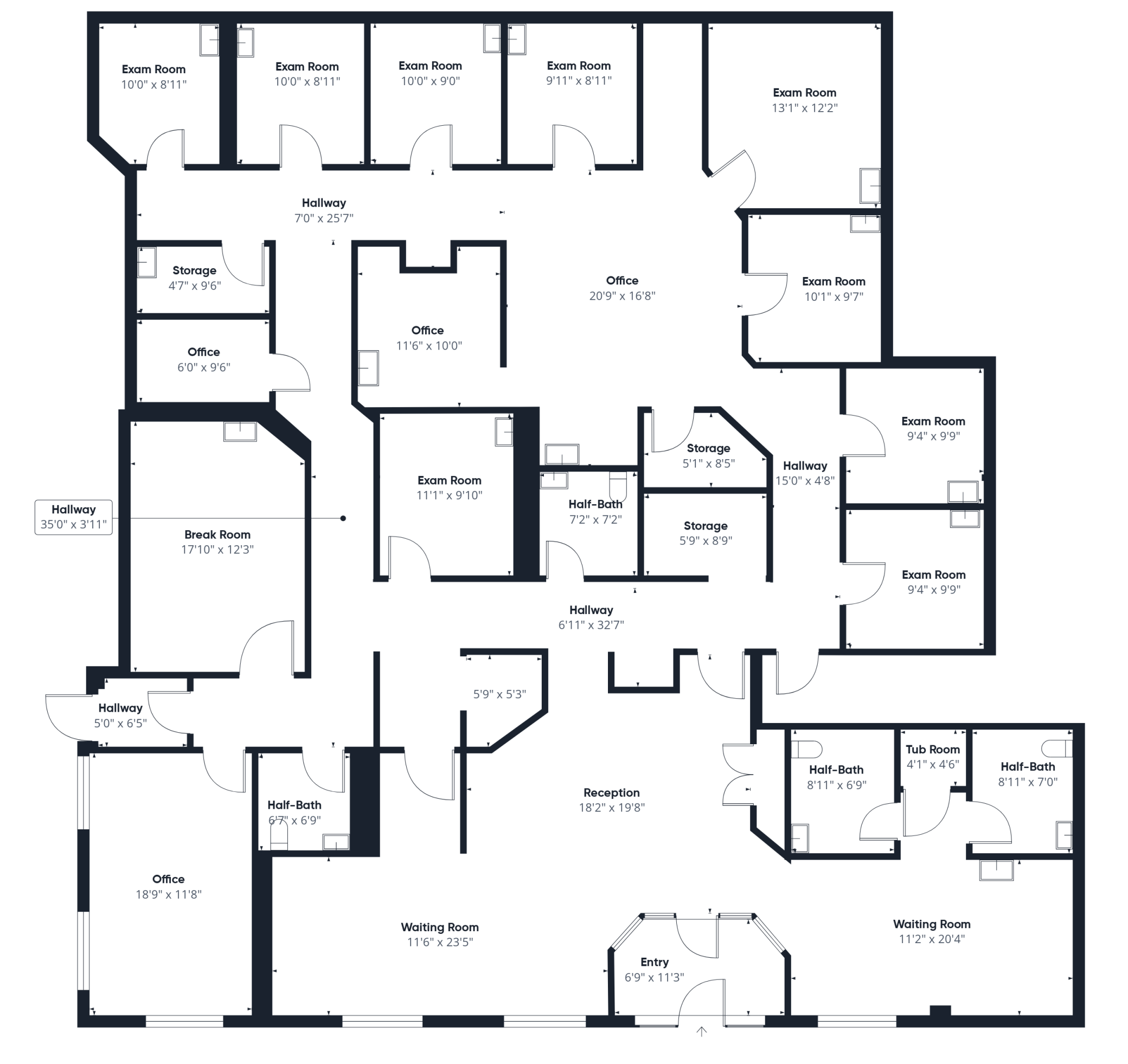 functional floor plan with a reception area, multiple private offices or exam rooms, restrooms, and