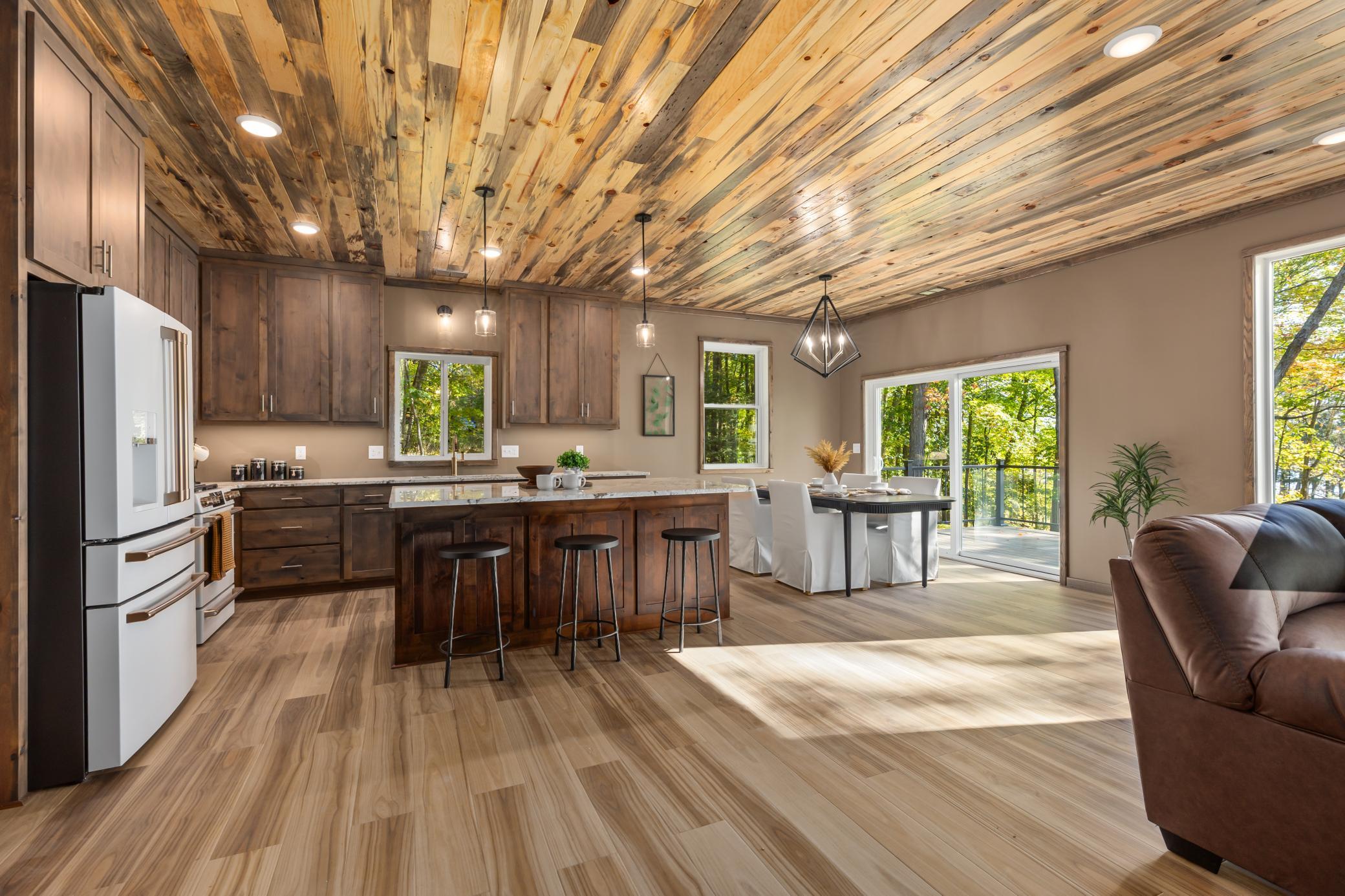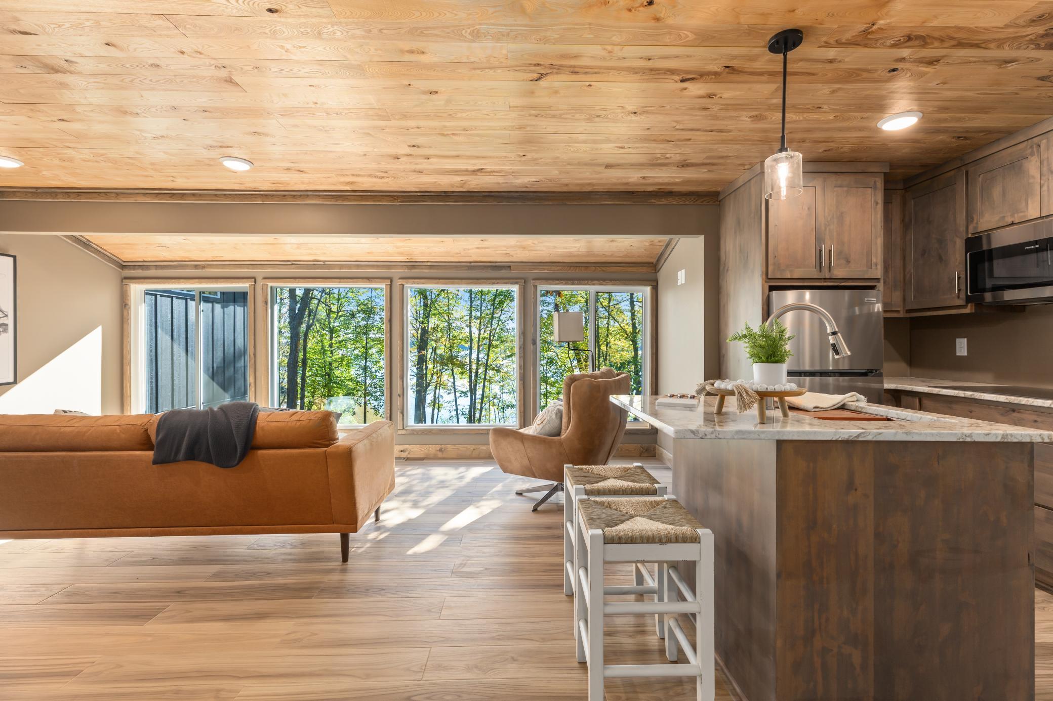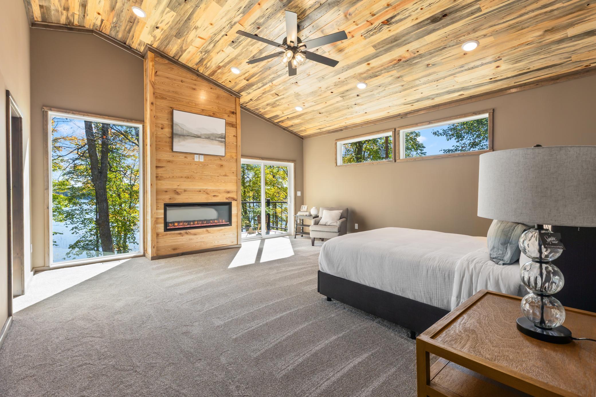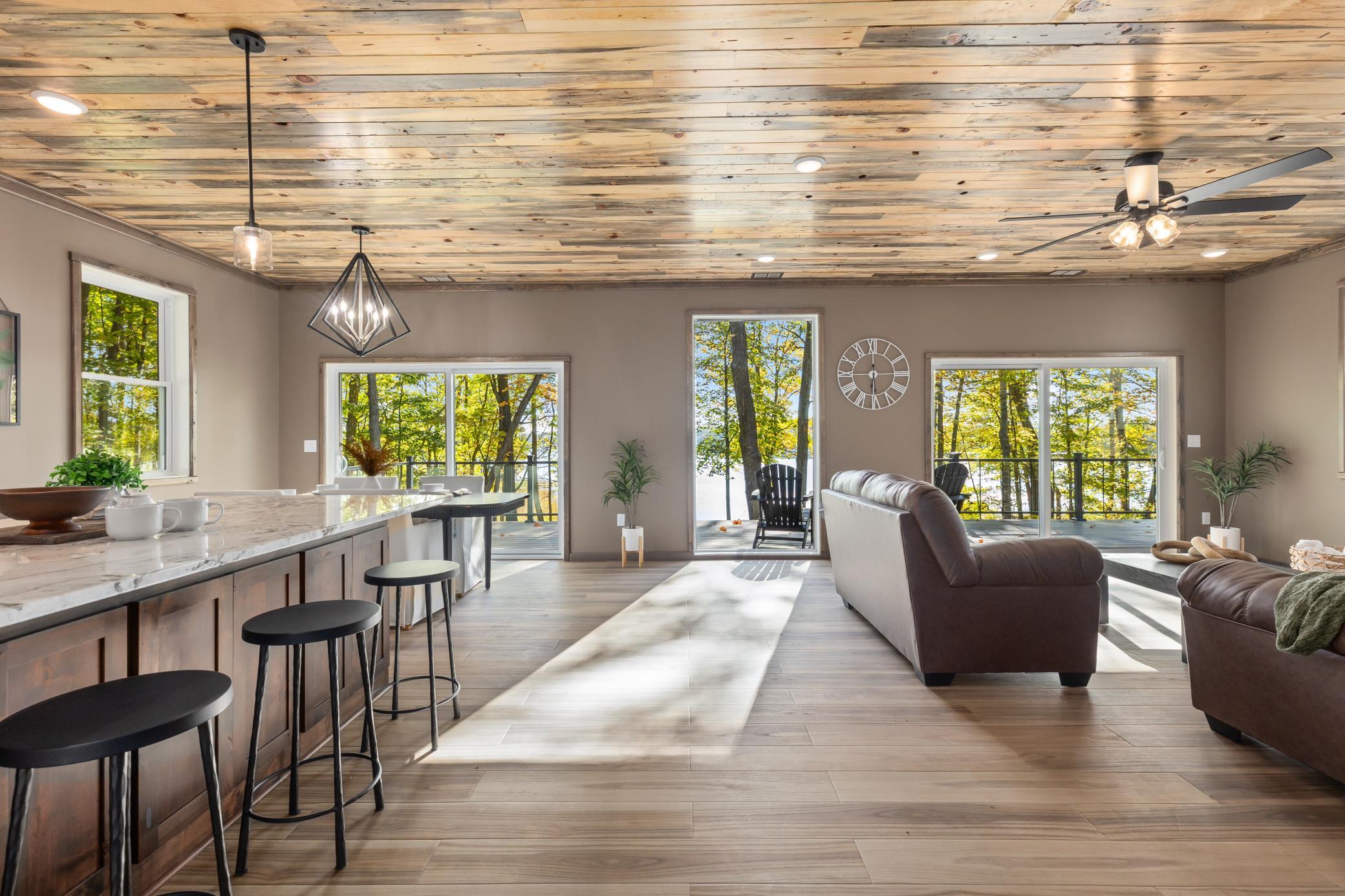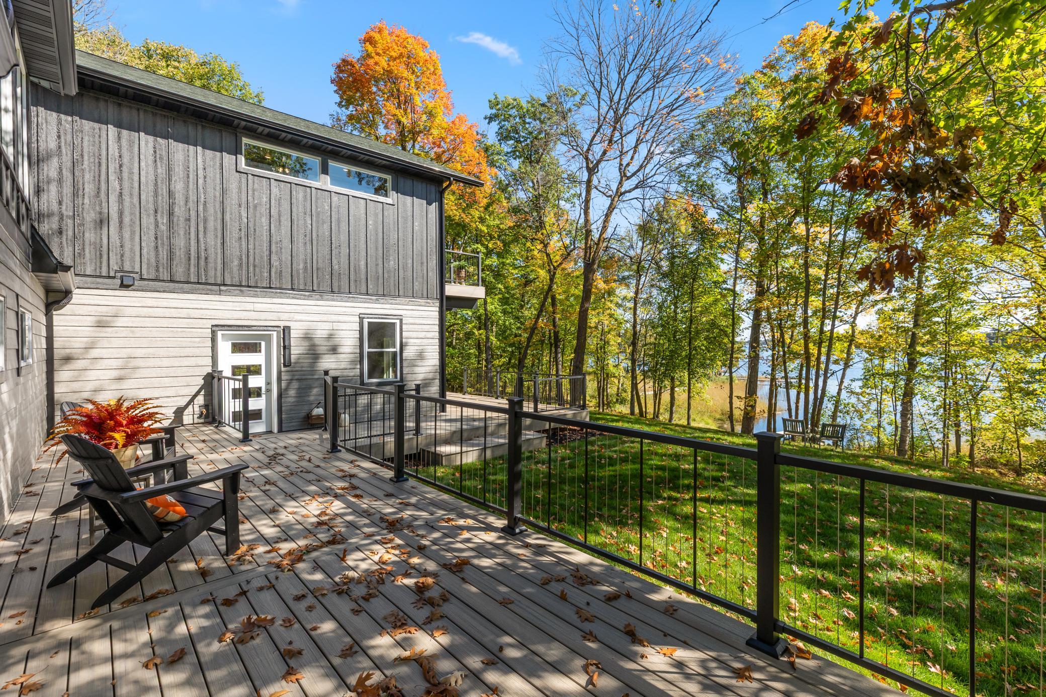 Set on the highly sought-after Woman Lake Chain, this beautiful property on Girl Lake offers the ultimate Up North lifestyle. Resting on 1.18 acres, the home provides a private retreat with a gentle slope to the water, two docks for all your lake activities, and a unique peninsula surrounded by water that’s perfect for evenings around the fire pit. This home was extensively renovated inside and out, with a reimagined floor plan and high-quality finishes that offer the feel of new construction. The main level showcases massive lake views and an open-concept custom kitchen with stylish designer Café appliances in white with rose-gold accents, perfectly complementing the Alder cabinetry. The space flows seamlessly into the dining and living area with a cozy electric fireplace and natural wood accents. Also on the main floor are a bedroom, bathroom, and laundry room, along with an insulated and heated 2-stall attached garage. Upstairs, the impressive primary suite will wow you with panoramic lake views, a private balcony, fireplace, spa-like bathroom with double sinks, soaking tub, tiled walk-in shower, and a custom walk-in closet. Above the garage, you’ll find versatile guest quarters/second living space, complete with a kitchen, bathroom, laundry hookups, living room, and bedroom—ideal for extended family, visitors, or even a game and entertainment room. The wraparound deck, finished with low-maintenance composite decking and a thoughtfully designed railing, maximizes your view of the lake, while LP SmartSide siding ensures durability and curb appeal. Whether you’re looking for a year-round residence or a private retreat, this property offers the space, craftsmanship, and lakeshore lifestyle you’ve been searching for.