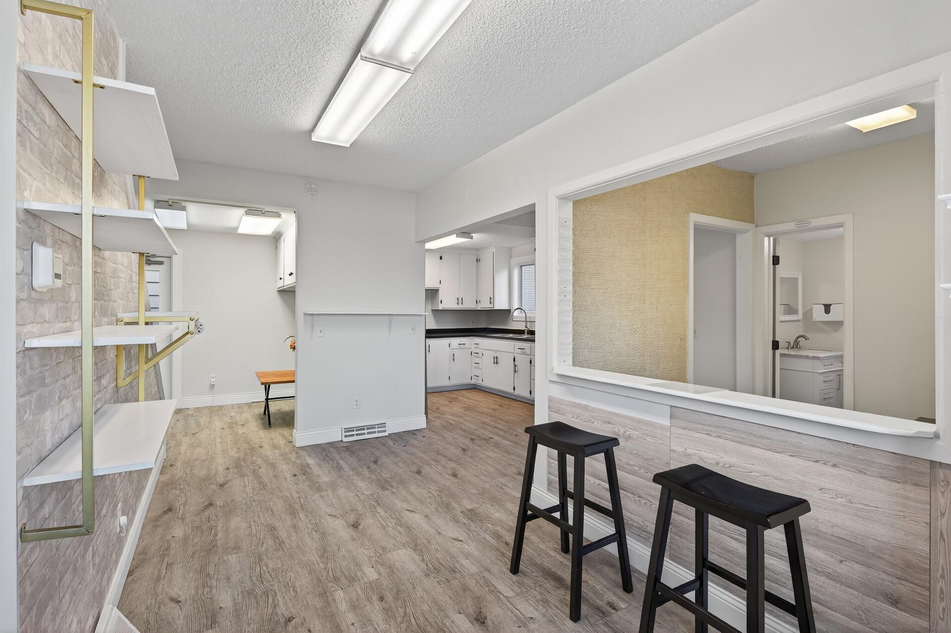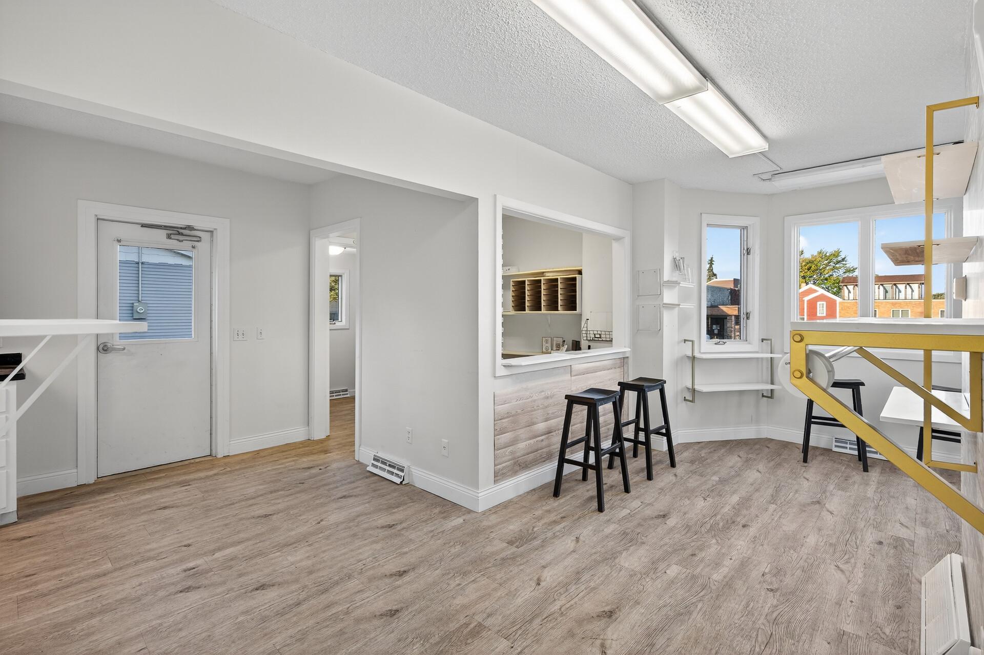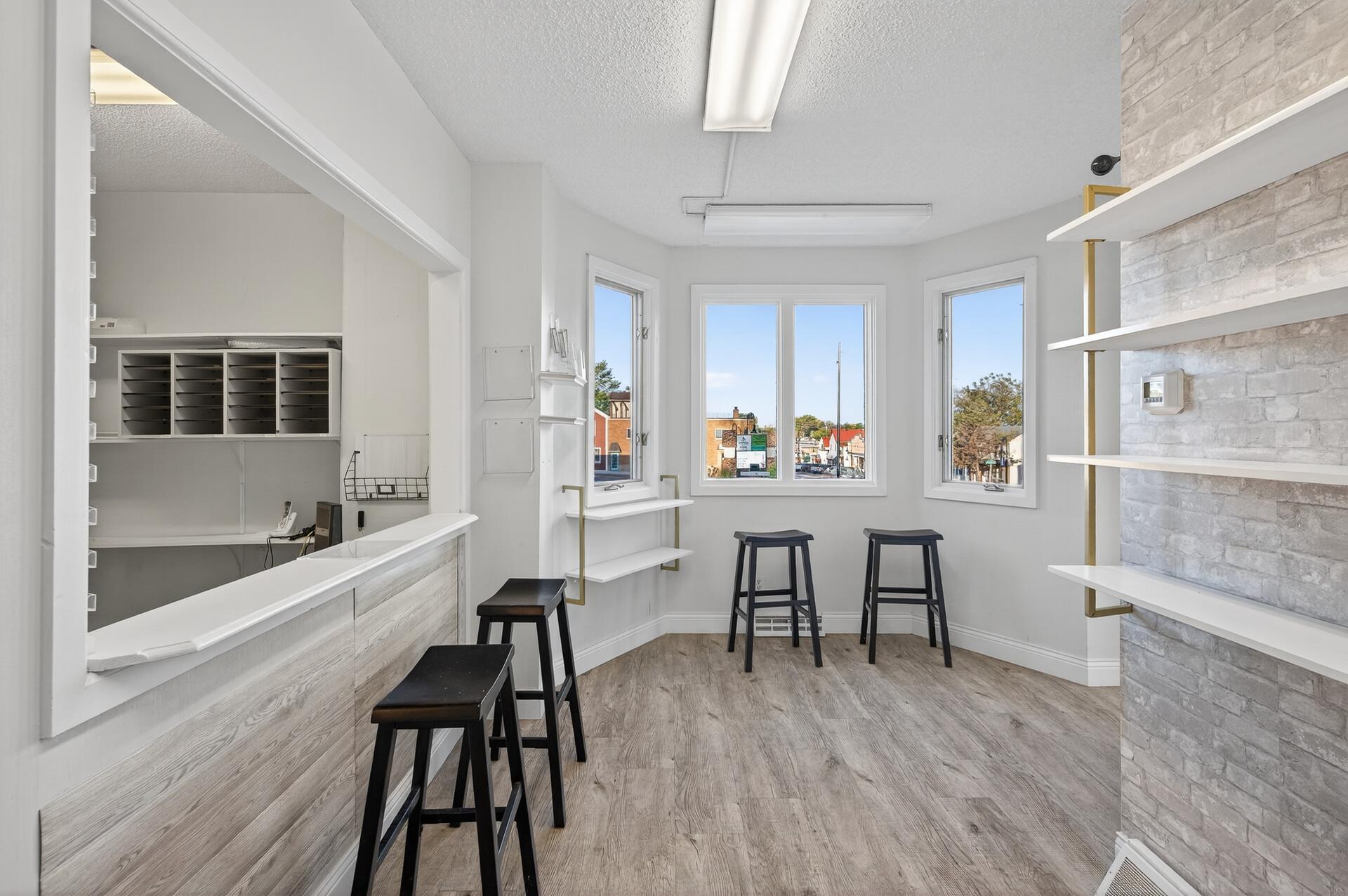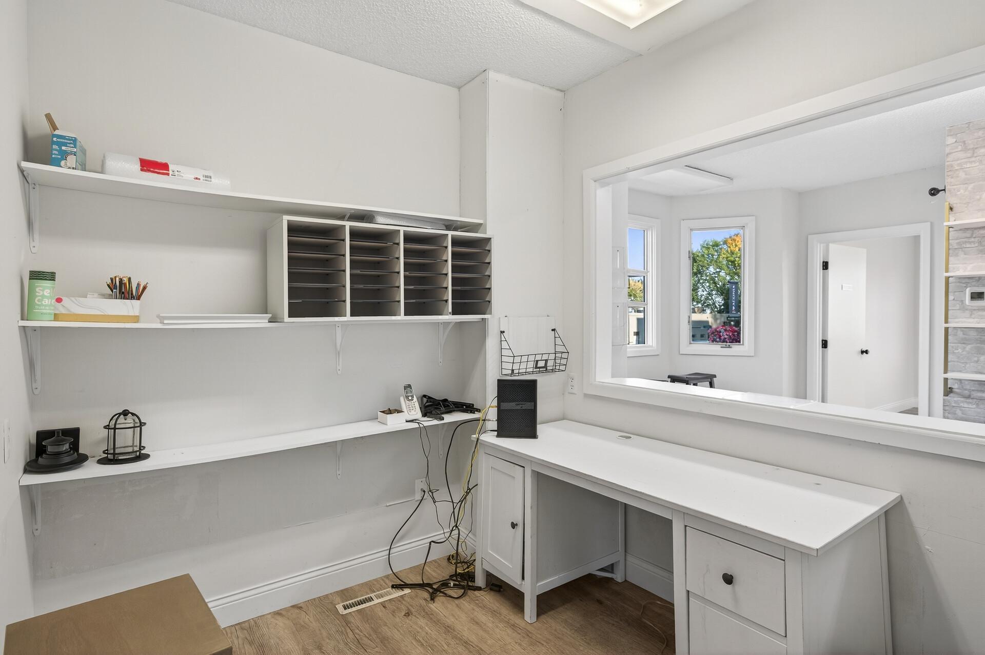 The main level features a welcoming entryway with a bright waiting area and a reception space complete with built-in shelving—perfect for a retail display or client check-in. You’ll also find a private office and a spacious additional room that can serve as a conference area or team workspace. The large kitchen provides convenience for staff breaks or casual meetings, and LVP flooring adds modern style and durability throughout.