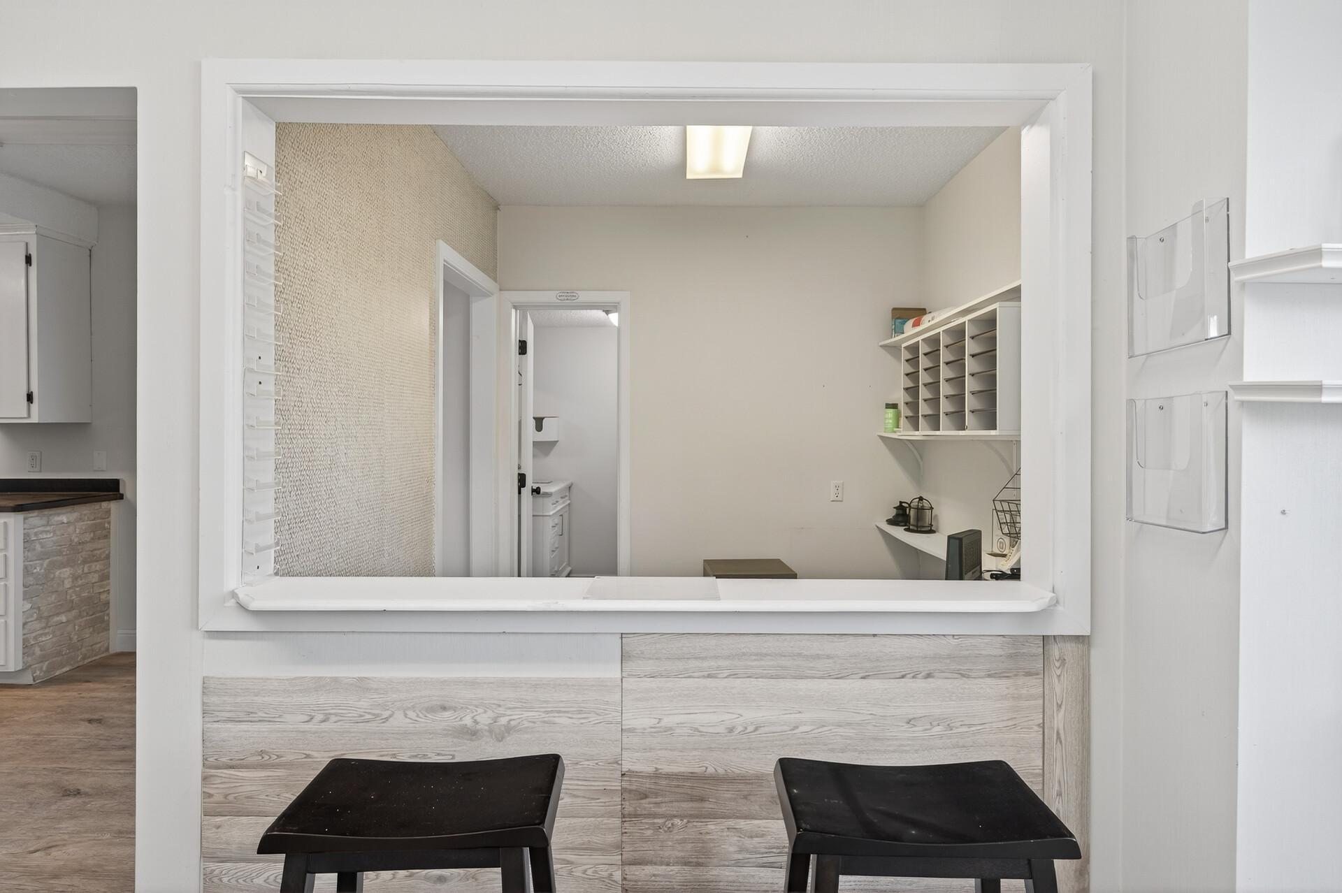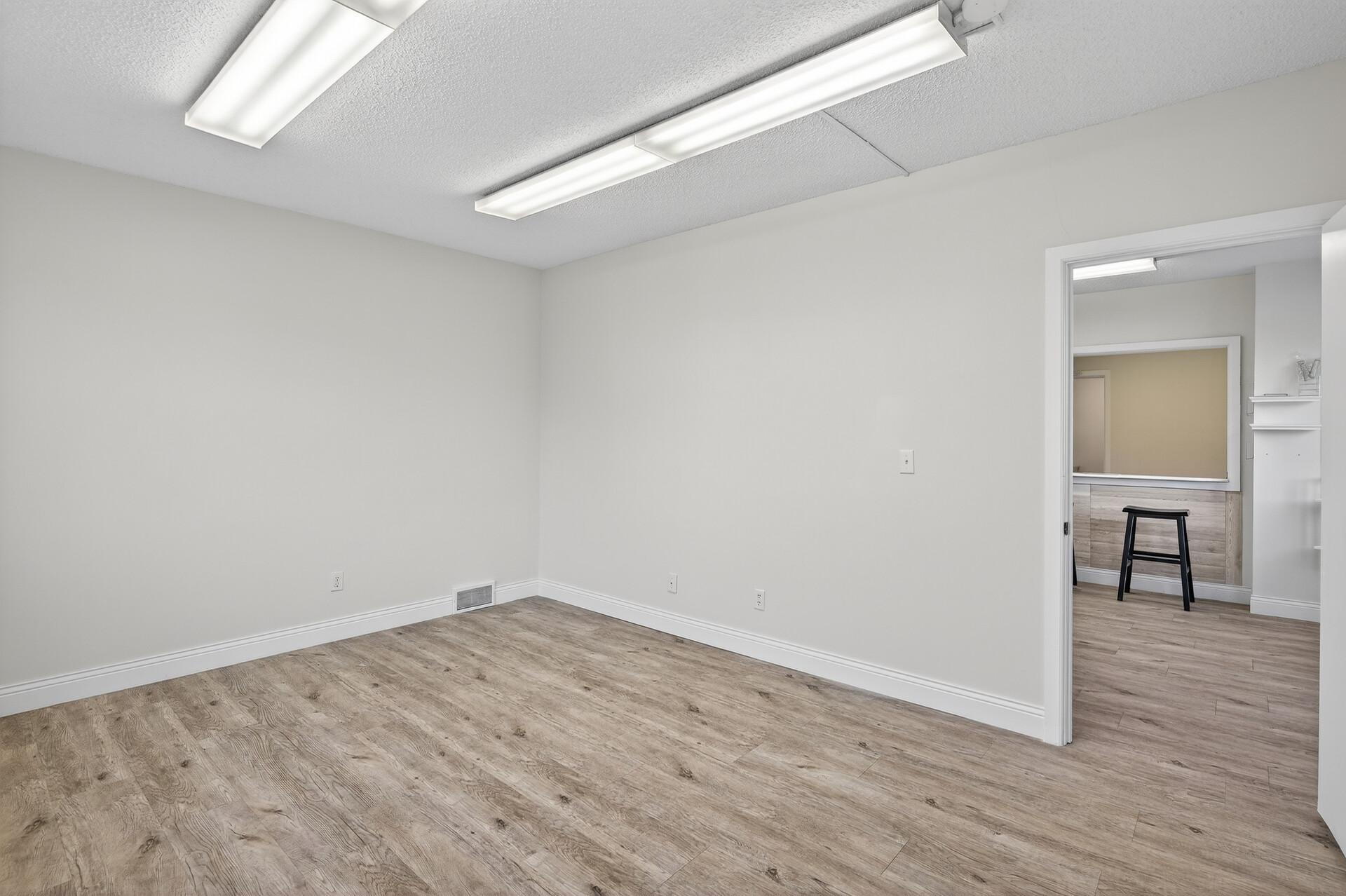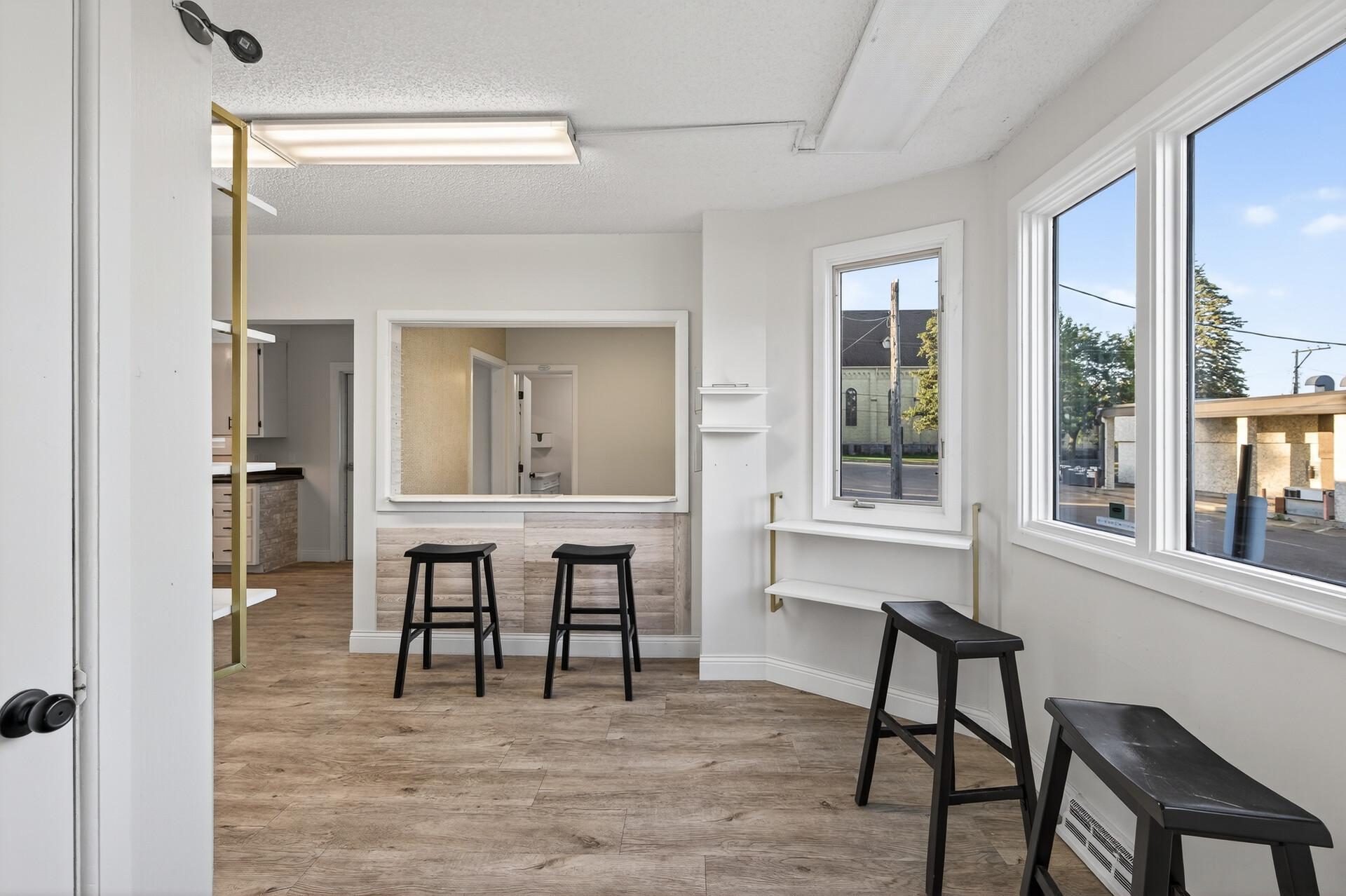 The main level features a welcoming entryway with a bright waiting area and a reception space complete with built-in shelving—perfect for a retail display or client check-in. You’ll also find a private office and a spacious additional room that can serve as a conference area or team workspace. The large kitchen provides convenience for staff breaks or casual meetings, and LVP flooring adds modern style and durability throughout.