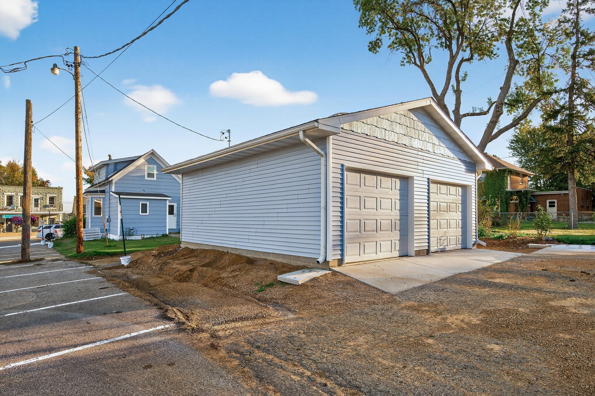 Upstairs, two generous offices offer privacy for individual workspaces or can be used as product storage areas. A detached two-car garage adds extra functionality and storage options.