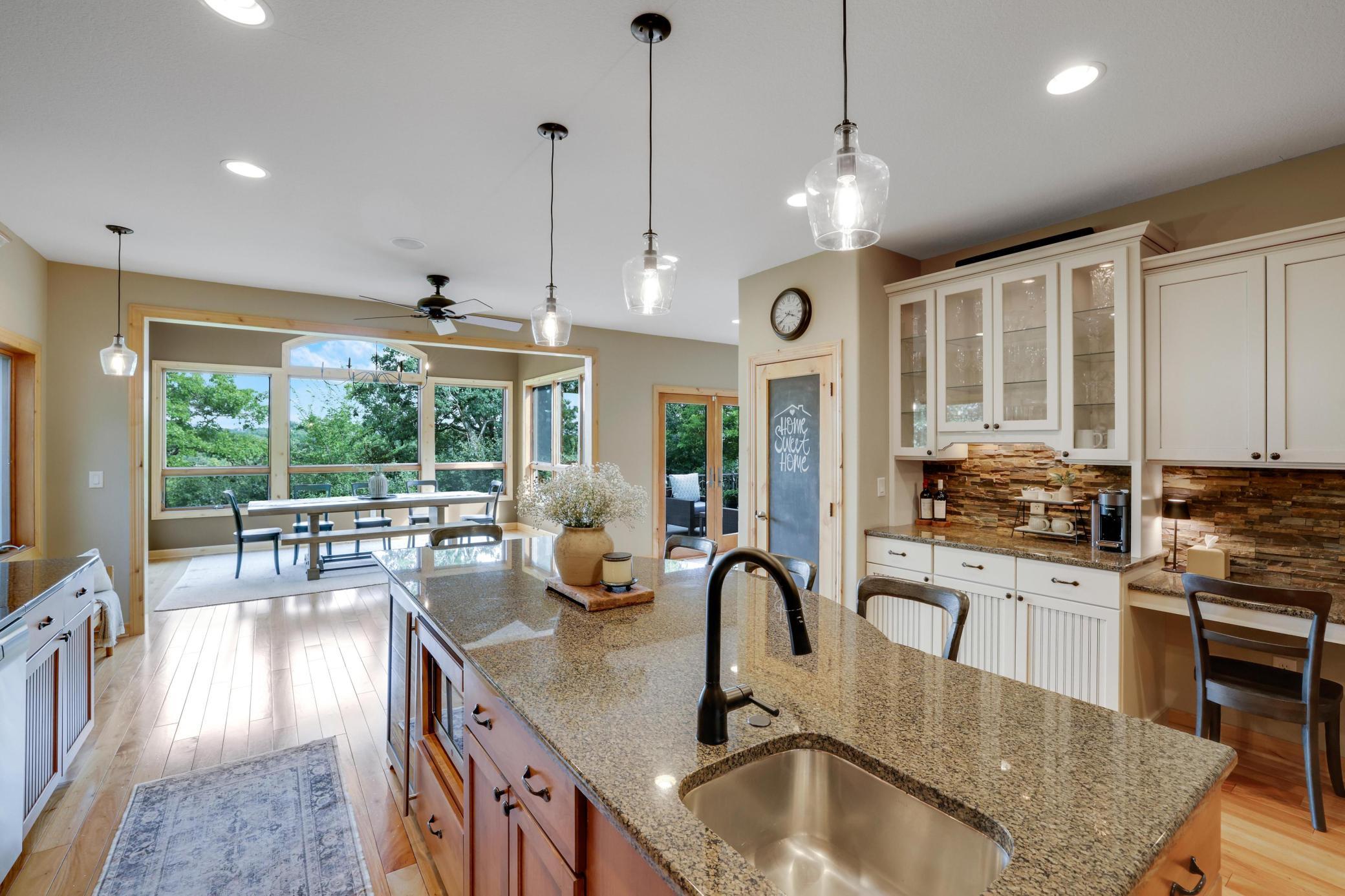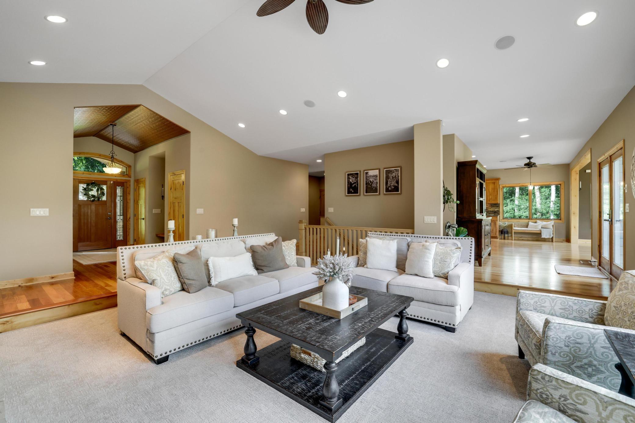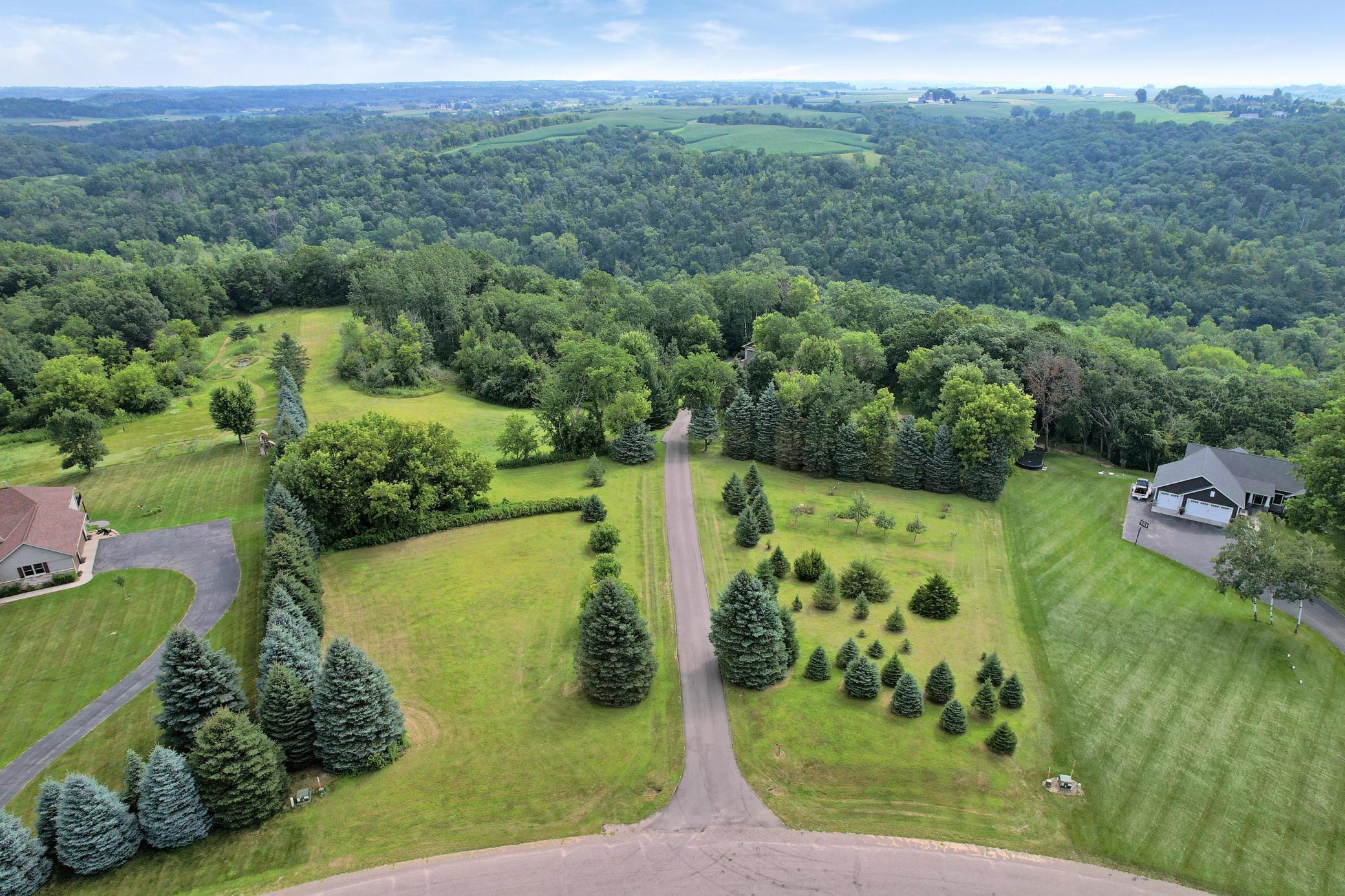 Discover this one-of-a-kind estate—an extraordinary blend of elegance, craftsmanship, and tranquility—nestled within your own 3+ acre sanctuary just six minutes from downtown Prescott and the scenic St. Croix River. Designed for luxurious main-level living, this nearly 5,500 sq. ft. residence captures sweeping, year-round views of the Big River Valley, framed beautifully through expansive walls of glass that flood the home with natural light. Step inside to soaring vaulted ceilings, a dramatic stone fireplace, and impeccable architectural detail that exudes sophistication at every turn. The chef’s kitchen is a true showpiece, featuring custom cabinetry, a walk-in pantry, an expansive island with prep sink, double ovens, a beverage refrigerator, and professional-grade appliances—offering the perfect space to entertain or unwind in style. The primary suite is a serene retreat with a spa-inspired bath and generous walk-in closet, while the main level also features a private home office and second bedroom. The walkout lower level provides an inviting extension of the home with a spacious family room, three additional bedrooms, two full bathrooms, and a versatile flex space ideal for a gym, theater, or hobby area. Car enthusiasts will love the oversized, fully finished garage, complemented by a heated tuck-under garage with direct lower-level access. Meticulously maintained and thoughtfully designed, this estate showcases countless high-end finishes and an exceptional level of care throughout. Blending privacy, luxury, and natural beauty, this wooded retreat is truly a rare find in one of Prescott’s most coveted settings.