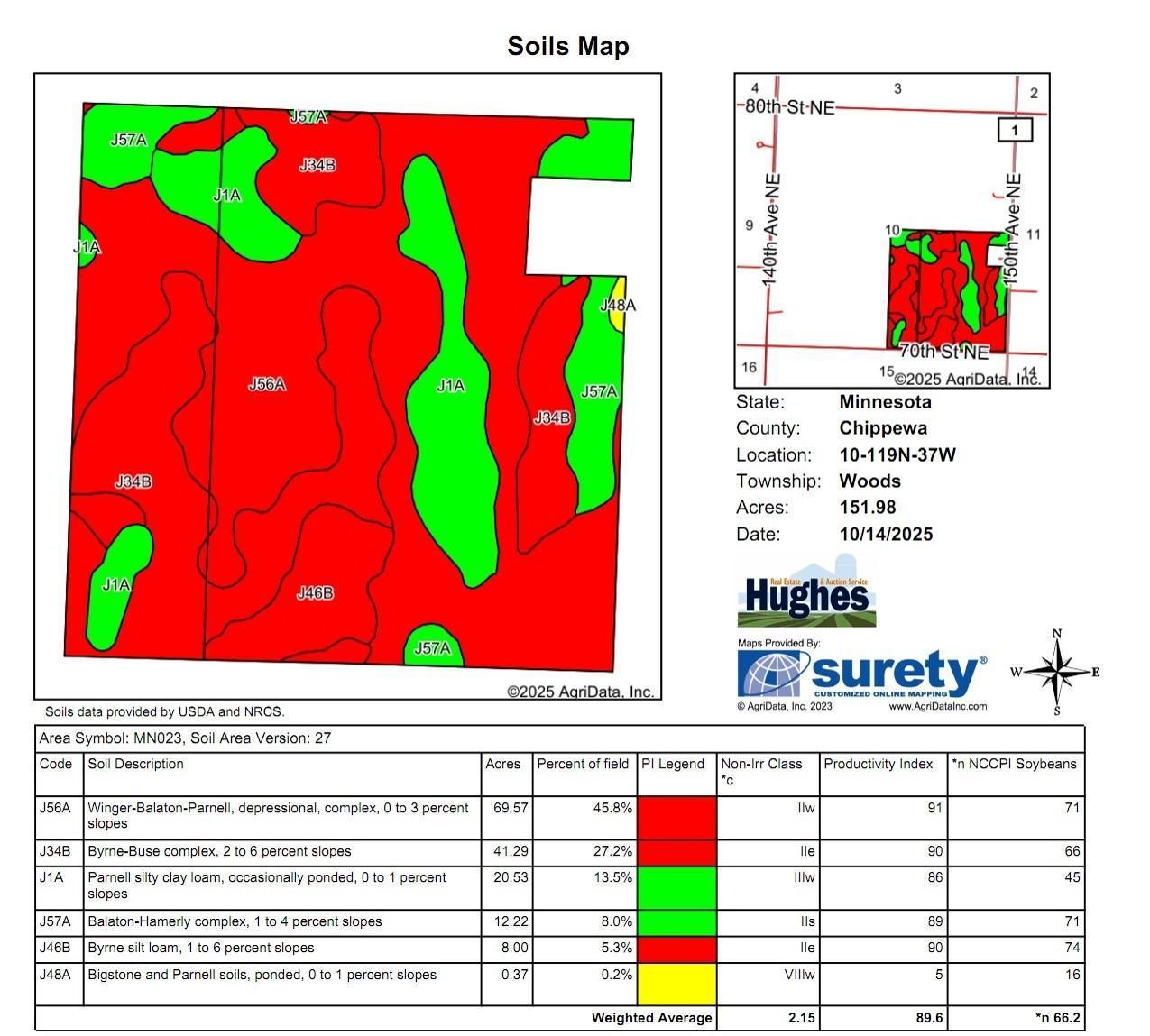 Online only land auction January 5-9, 2026. 154.48 Acres (+-) located in Section 10 of Woods Township, Chippewa County, MN. 151.98 (+-) Acres of Prime Chippewa County Tillable Farmland! Excellent Soils with a CPI of 89.6. Tile drainage included. Great addition to your farming operation or an investment property!
