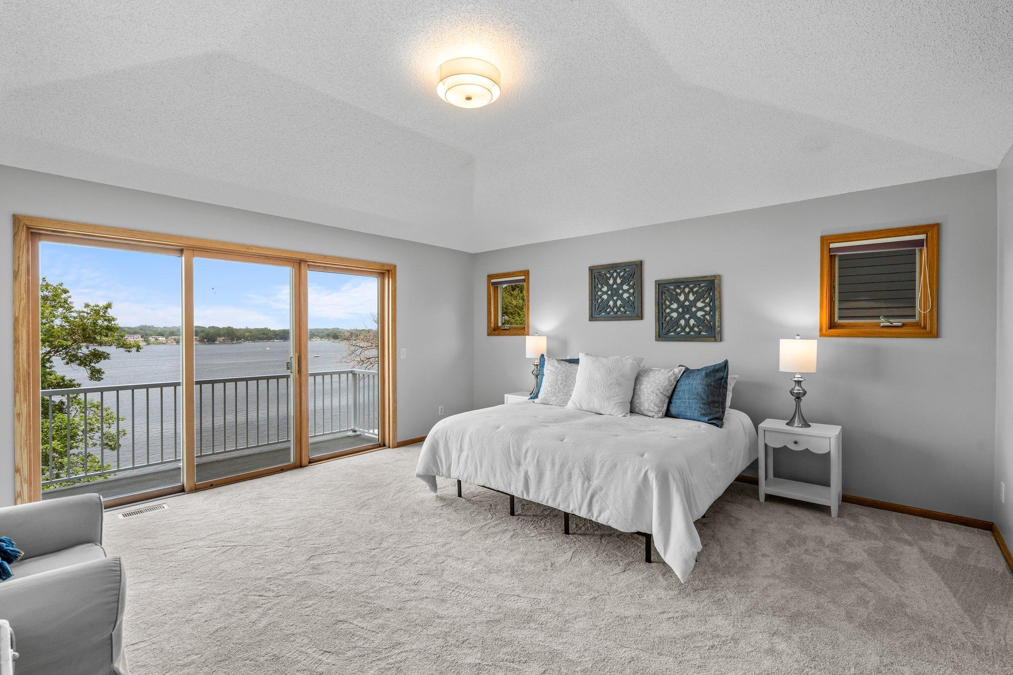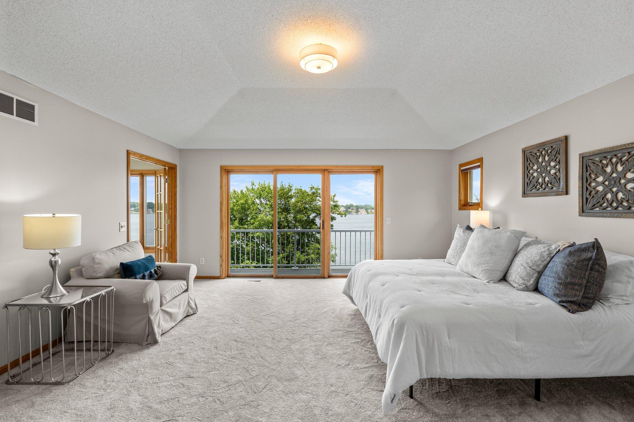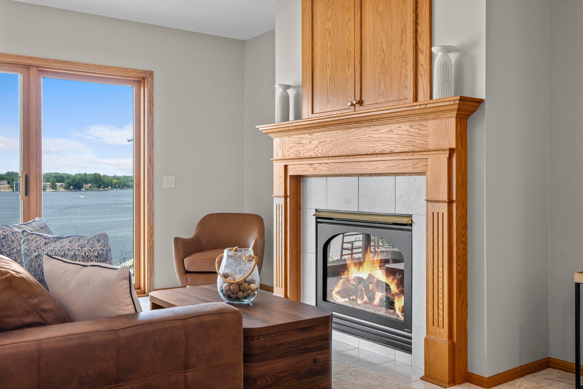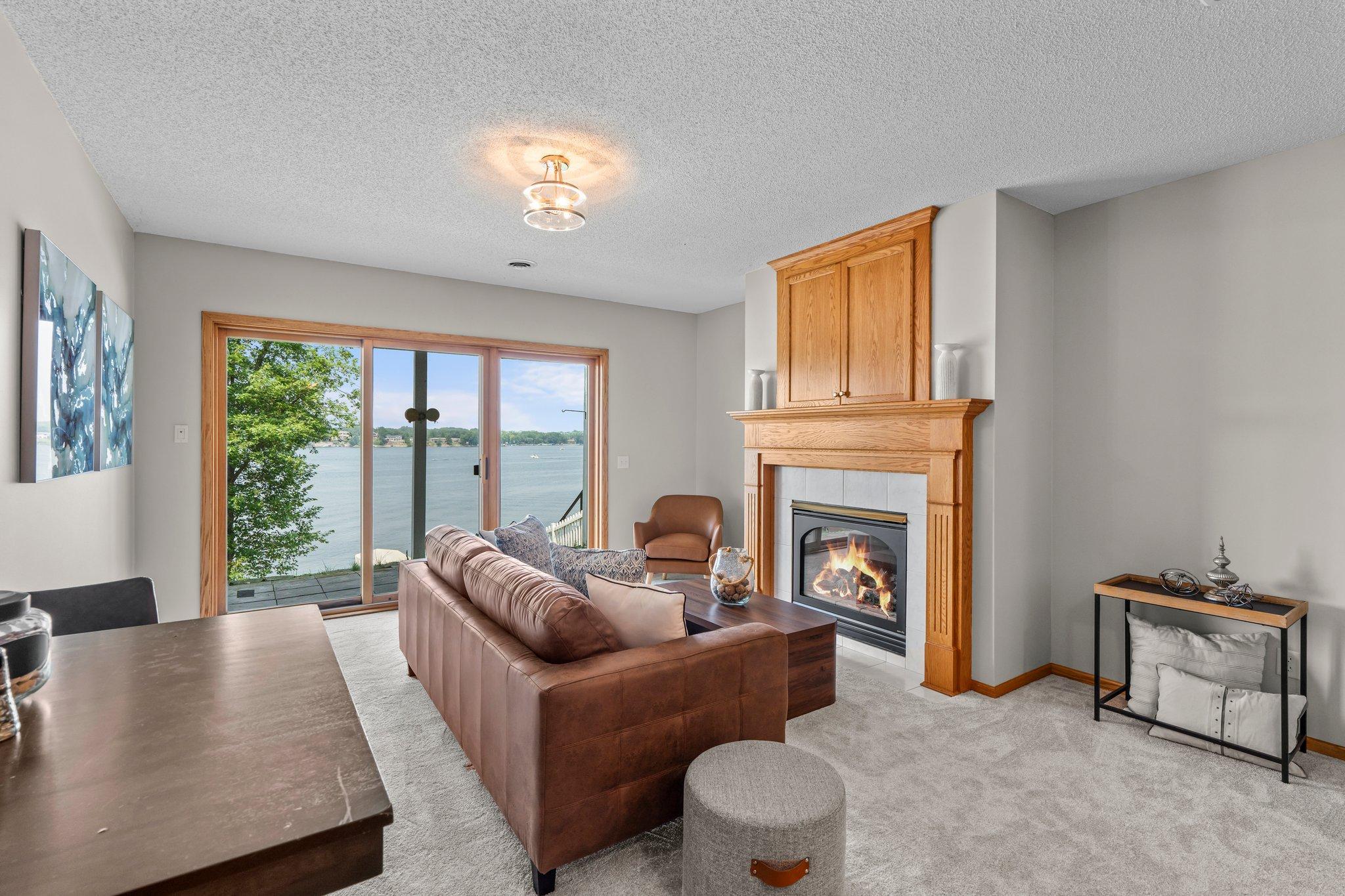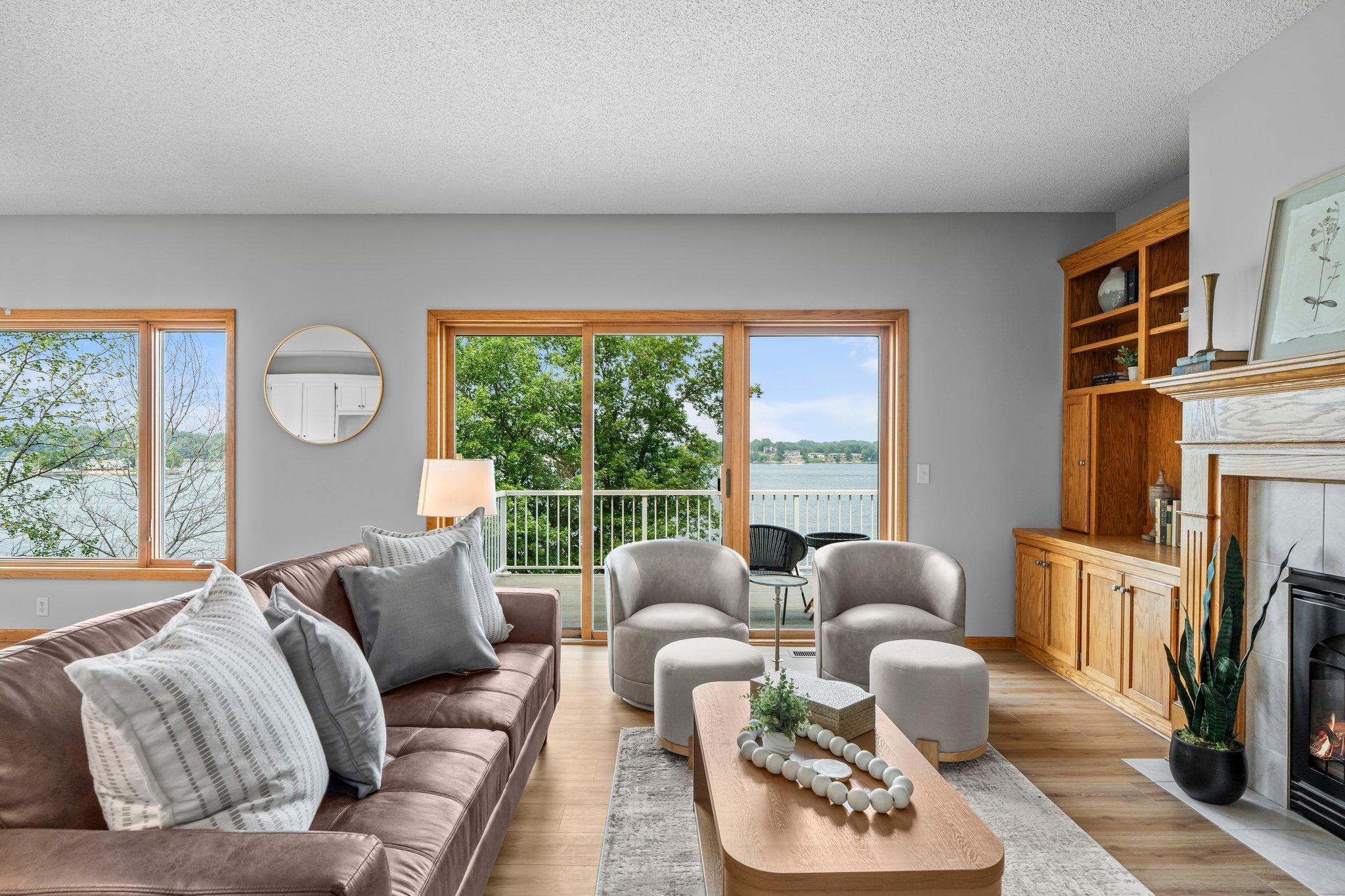 This beautifully updated Prior Lake home boasts 50 feet of sandy shoreline and sweeping lake views from nearly every room. The vaulted entry welcomes you with warm wood flooring that flows through the open main level. A spacious living room features custom built-ins, a cozy gas fireplace, and expansive windows opening to a lakeside deck—perfect for relaxing or entertaining. The kitchen is a showstopper with crisp white cabinetry, stone countertops, stainless steel appliances, tiled backsplash, and a center island with cooktop. An adjoining dining area makes every meal feel special with lake views as the backdrop. Upstairs, the private primary suite is a true retreat—double French doors open to a bright sitting area with new carpet, an ensuite ¾ bath with dual vanity, and a private balcony overlooking the water. A second bedroom, full bath, and open loft provide flexibility for family, guests, or a home office. The walkout lower level extends the living space with a family room and fireplace, an additional bedroom and bath, and a spacious laundry/mudroom—all designed to capture lake views. Outside, enjoy your own sandy beach, dock, and boat lift—easily accessed by stairs or a private lift. Just minutes from lakeside dining at Charlie’s on Prior and the heart of downtown Prior Lake, this home offers an unbeatable blend of luxury, location, and lifestyle.