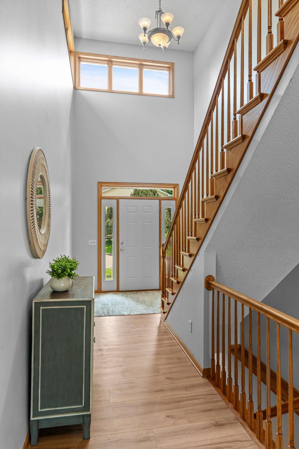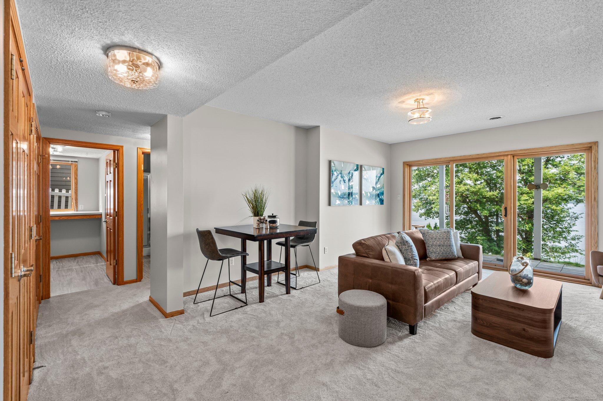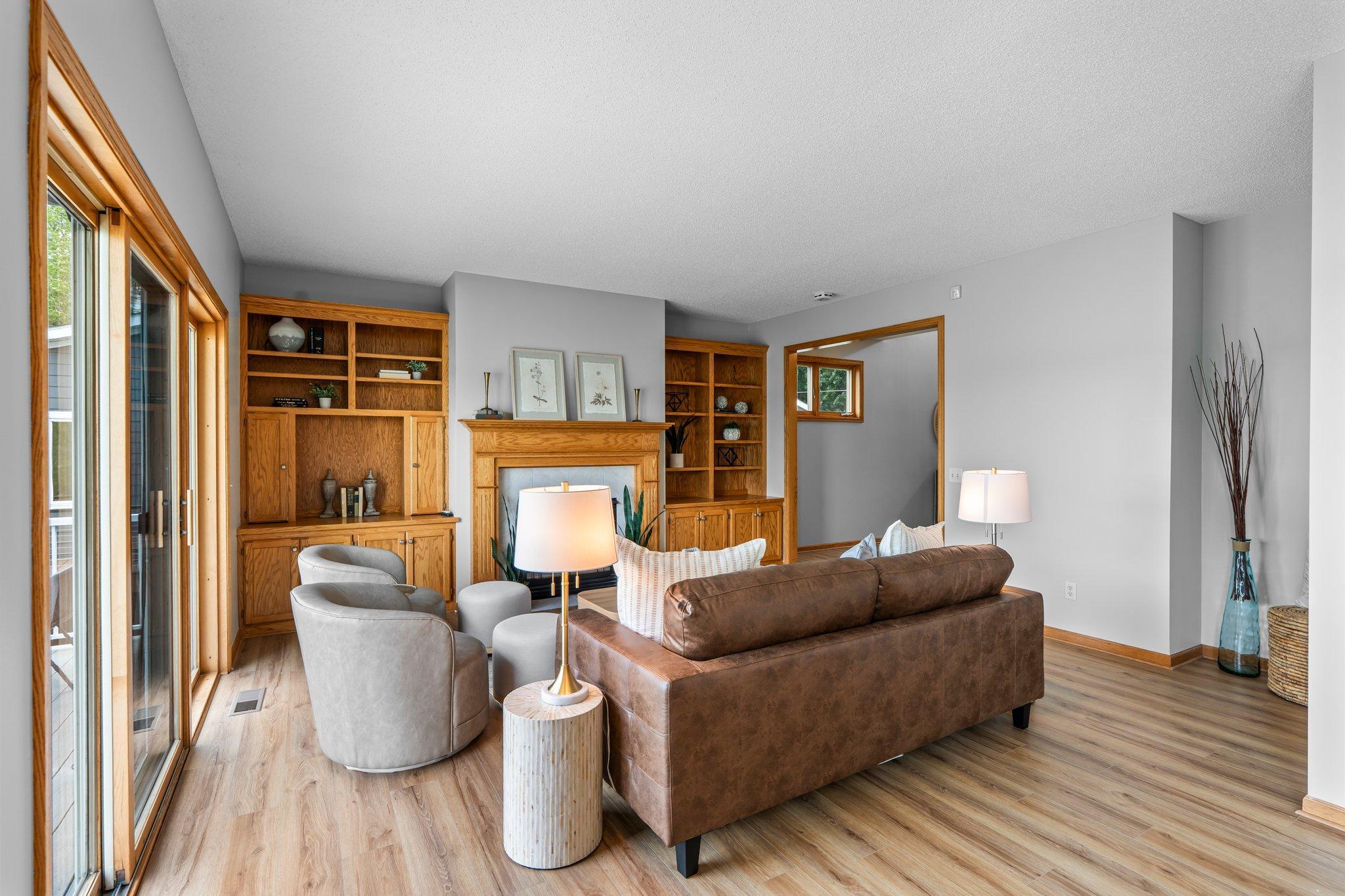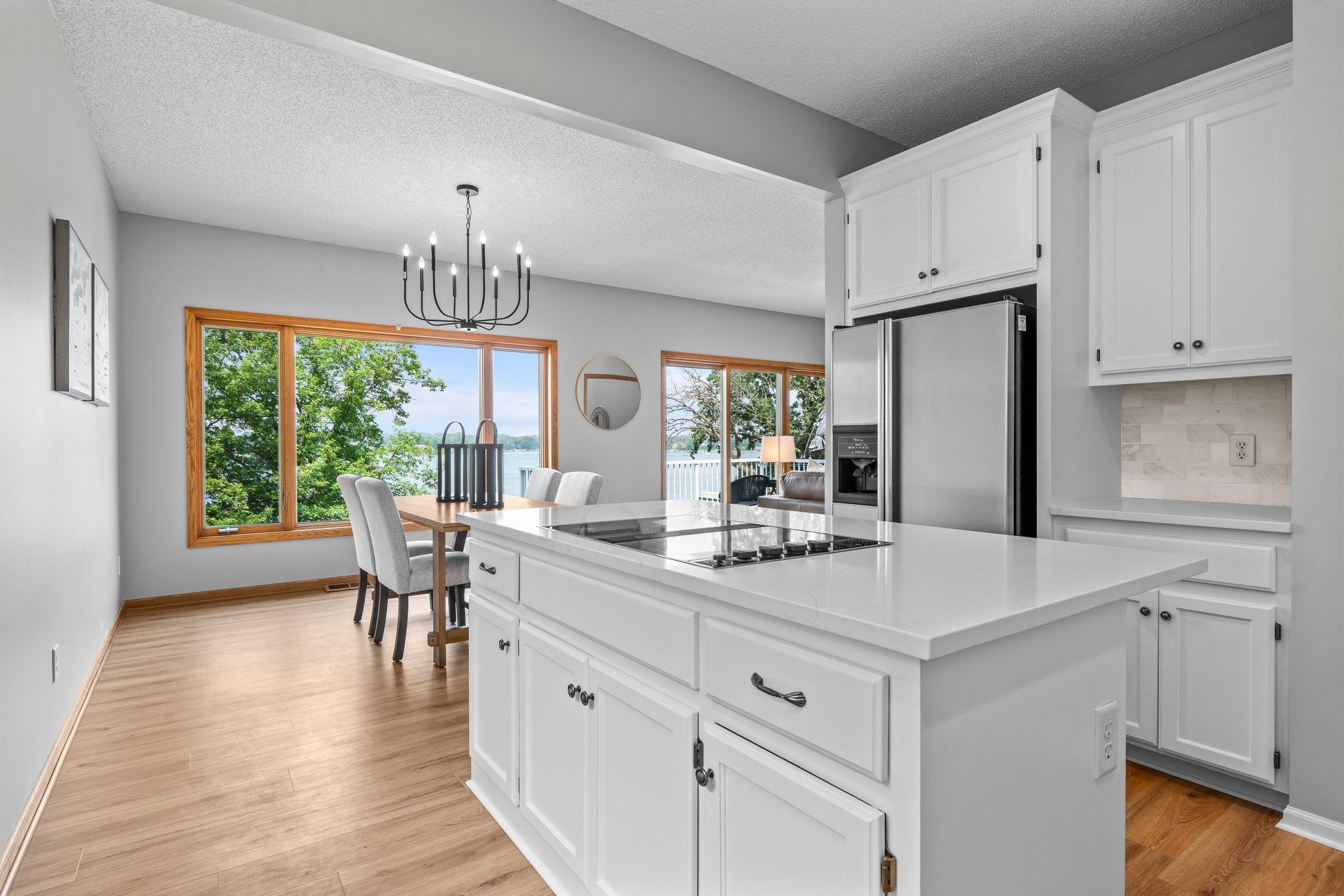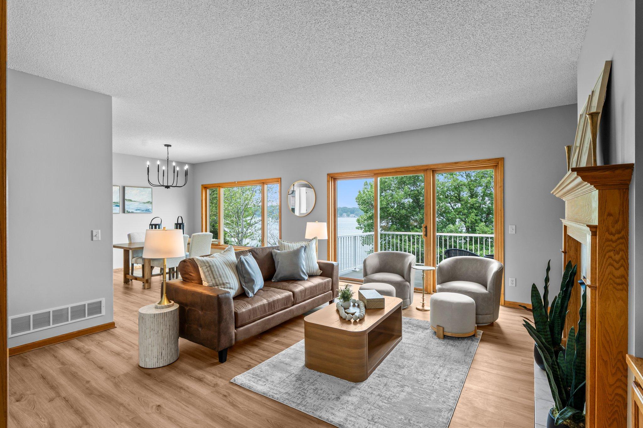 This beautifully updated Prior Lake home boasts 50 feet of sandy shoreline and sweeping lake views from nearly every room. The vaulted entry welcomes you with warm wood flooring that flows through the open main level. A spacious living room features custom built-ins, a cozy gas fireplace, and expansive windows opening to a lakeside deck—perfect for relaxing or entertaining. The kitchen is a showstopper with crisp white cabinetry, stone countertops, stainless steel appliances, tiled backsplash, and a center island with cooktop. An adjoining dining area makes every meal feel special with lake views as the backdrop. Upstairs, the private primary suite is a true retreat—double French doors open to a bright sitting area with new carpet, an ensuite ¾ bath with dual vanity, and a private balcony overlooking the water. A second bedroom, full bath, and open loft provide flexibility for family, guests, or a home office. The walkout lower level extends the living space with a family room and fireplace, an additional bedroom and bath, and a spacious laundry/mudroom—all designed to capture lake views. Outside, enjoy your own sandy beach, dock, and boat lift—easily accessed by stairs or a private lift. Just minutes from lakeside dining at Charlie’s on Prior and the heart of downtown Prior Lake, this home offers an unbeatable blend of luxury, location, and lifestyle.