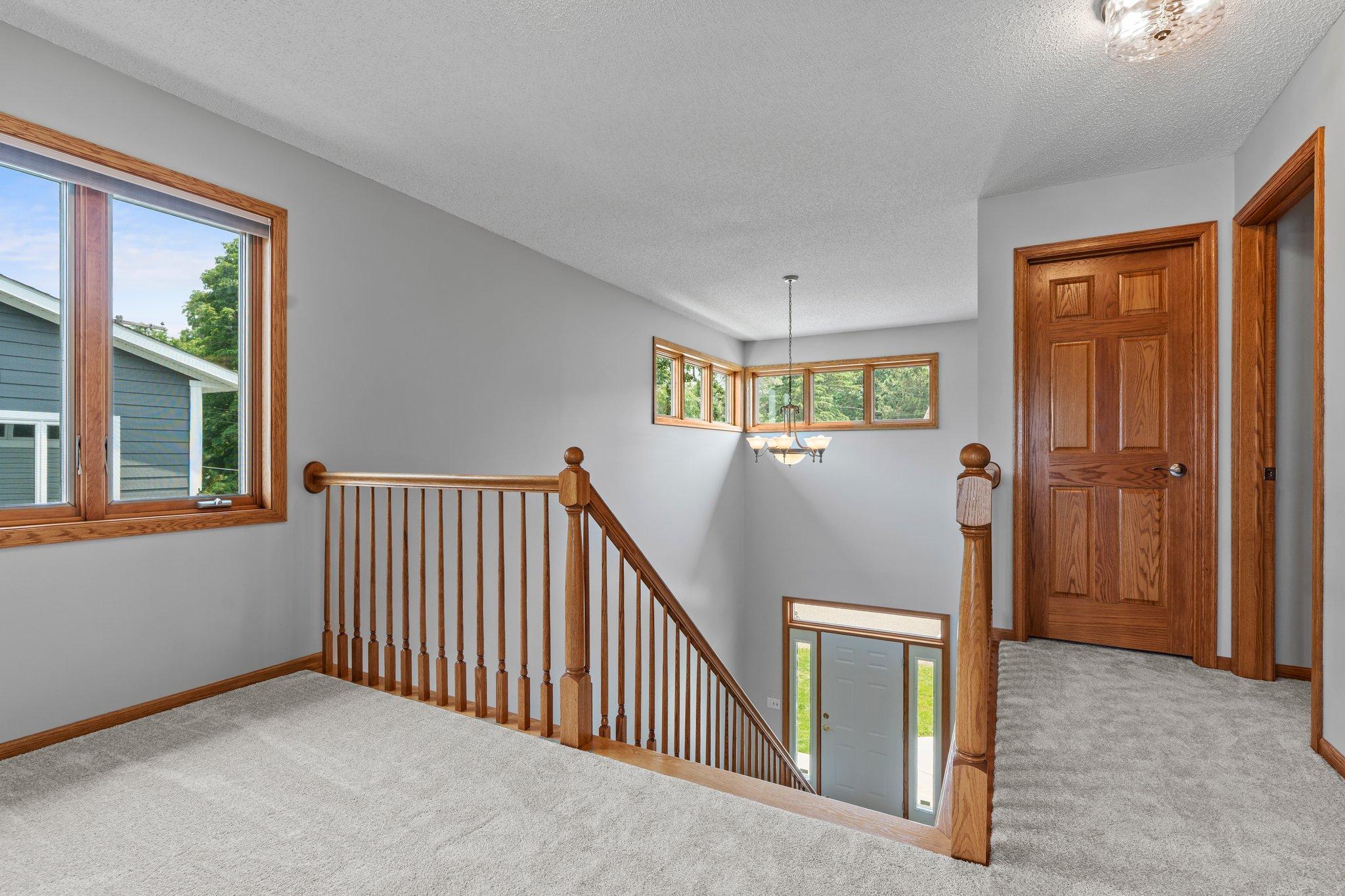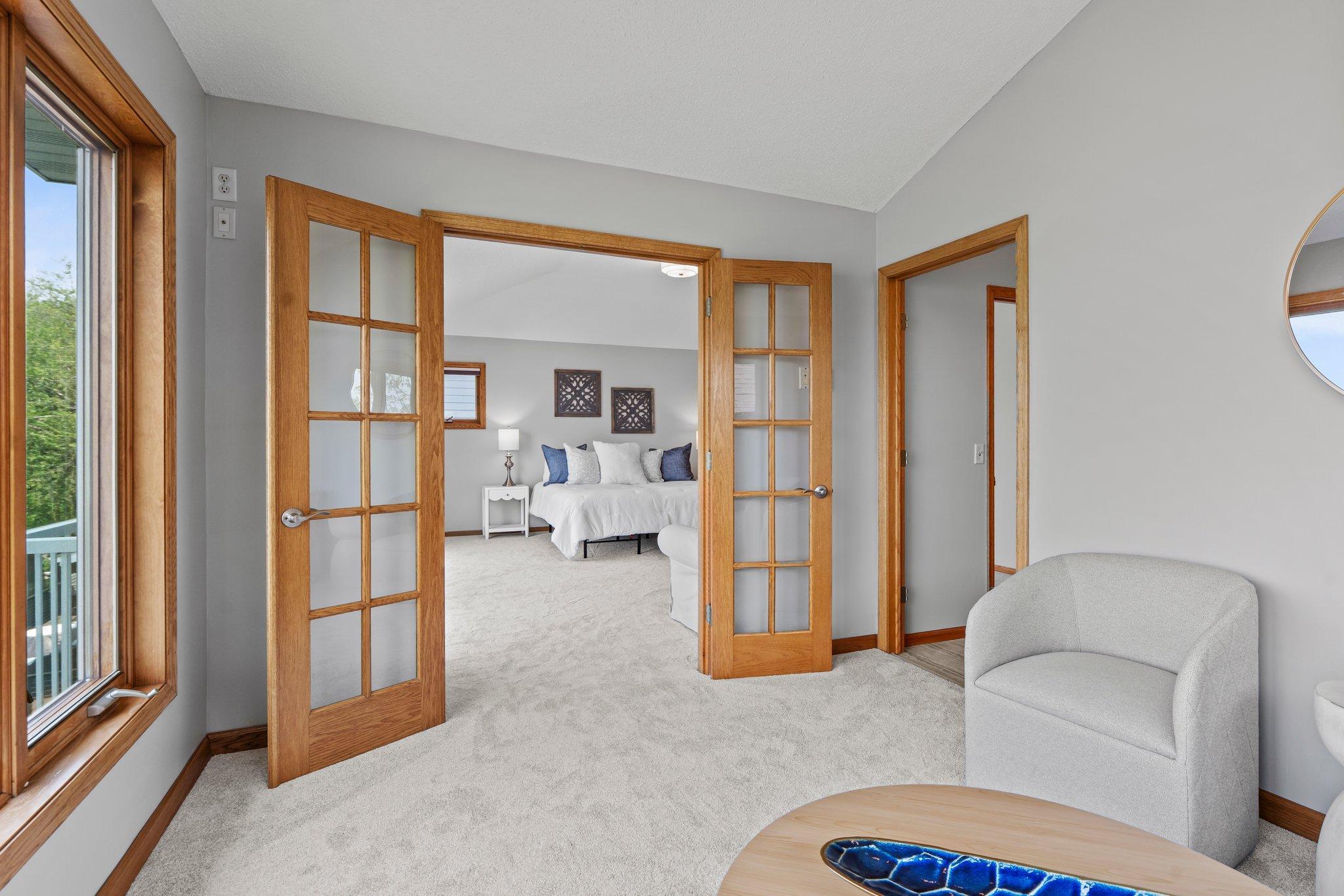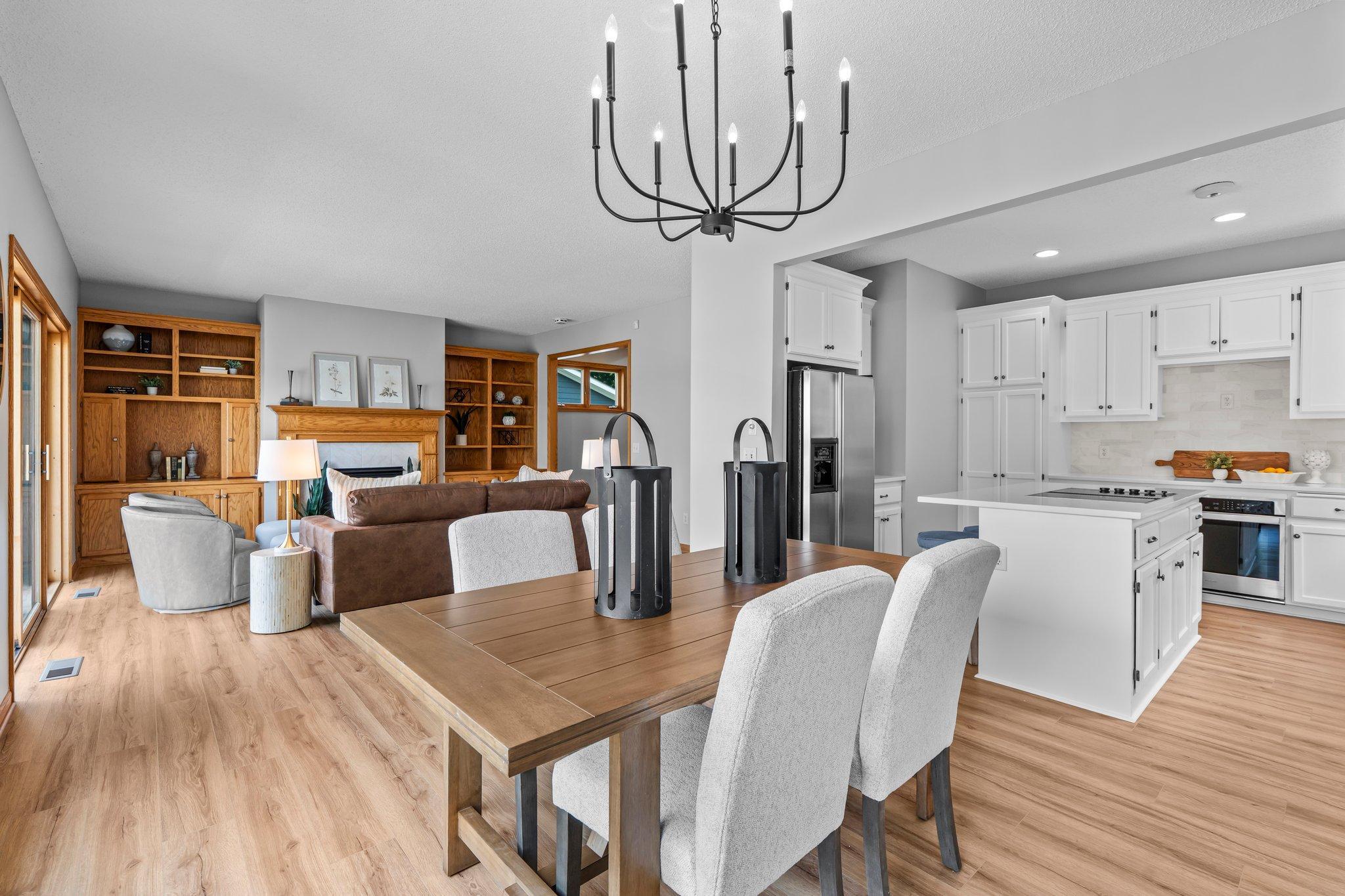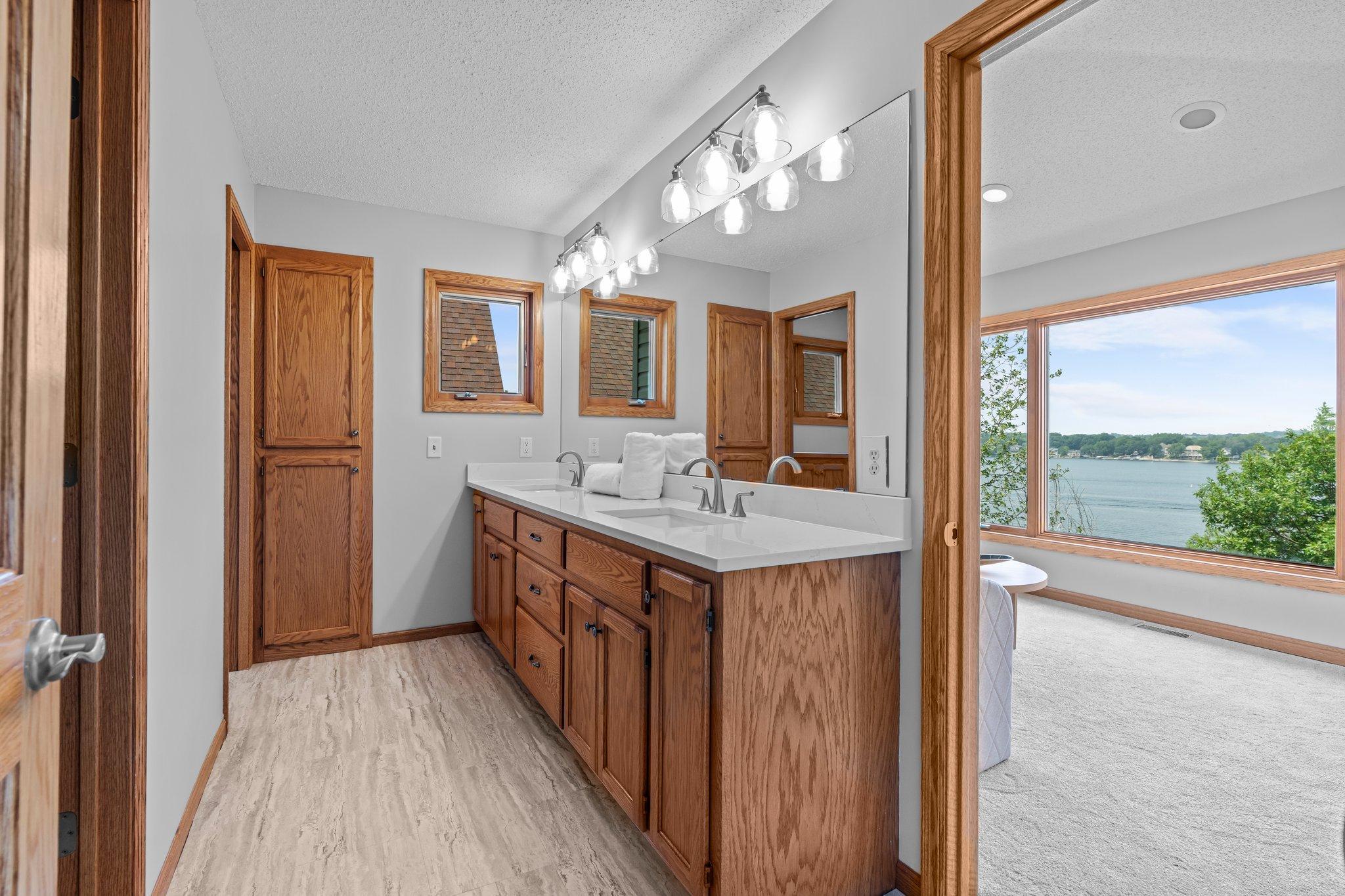 This beautifully updated Prior Lake home boasts 50 feet of sandy shoreline and sweeping lake views from nearly every room. The vaulted entry welcomes you with warm wood flooring that flows through the open main level. A spacious living room features custom built-ins, a cozy gas fireplace, and expansive windows opening to a lakeside deck—perfect for relaxing or entertaining. The kitchen is a showstopper with crisp white cabinetry, stone countertops, stainless steel appliances, tiled backsplash, and a center island with cooktop. An adjoining dining area makes every meal feel special with lake views as the backdrop. Upstairs, the private primary suite is a true retreat—double French doors open to a bright sitting area with new carpet, an ensuite ¾ bath with dual vanity, and a private balcony overlooking the water. A second bedroom, full bath, and open loft provide flexibility for family, guests, or a home office. The walkout lower level extends the living space with a family room and fireplace, an additional bedroom and bath, and a spacious laundry/mudroom—all designed to capture lake views. Outside, enjoy your own sandy beach, dock, and boat lift—easily accessed by stairs or a private lift. Just minutes from lakeside dining at Charlie’s on Prior and the heart of downtown Prior Lake, this home offers an unbeatable blend of luxury, location, and lifestyle.