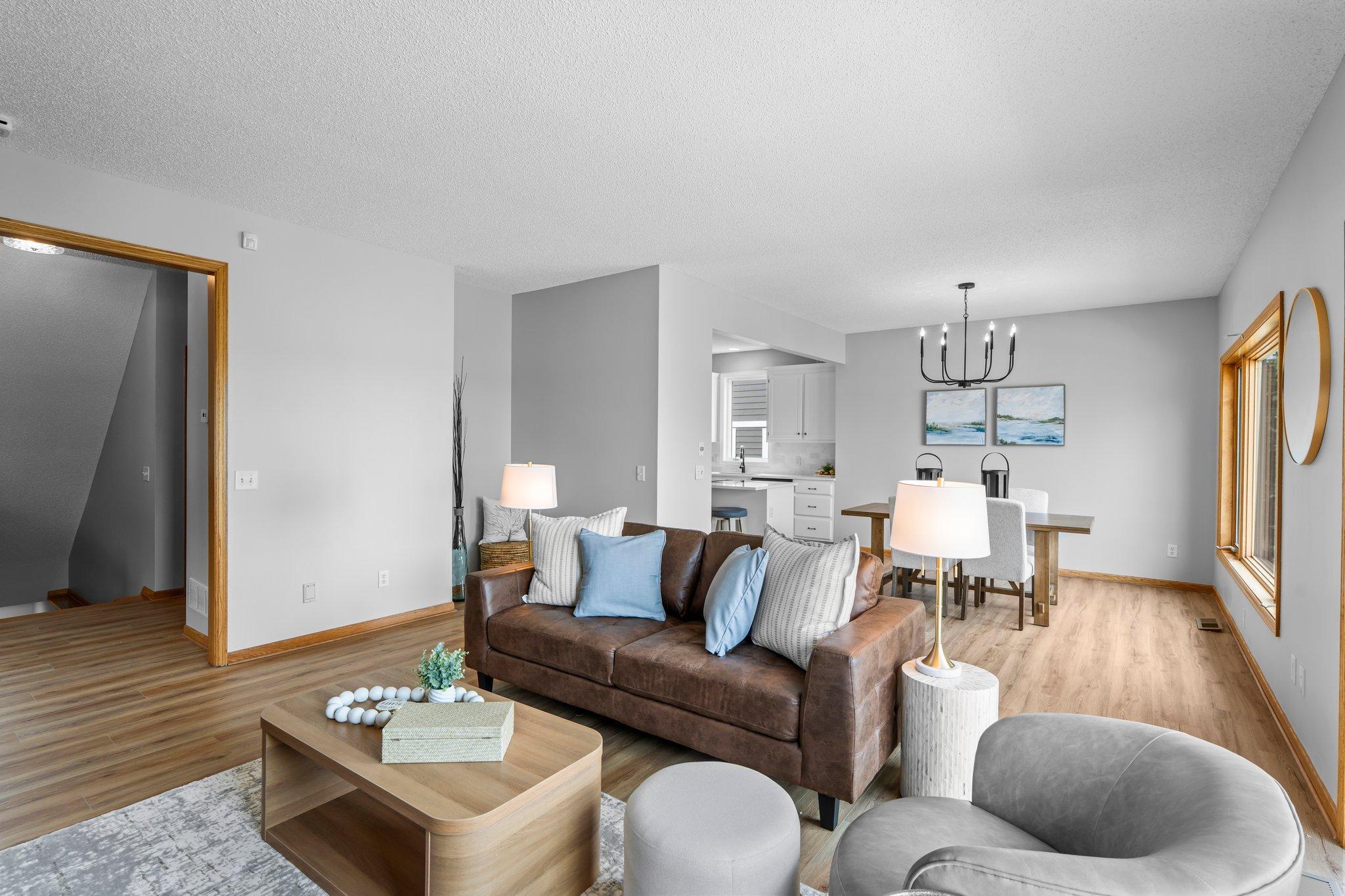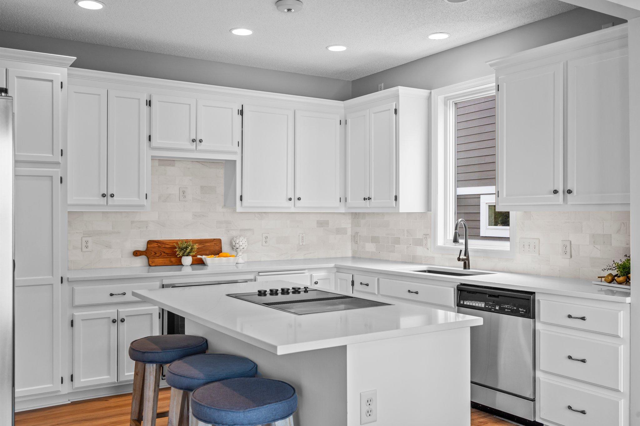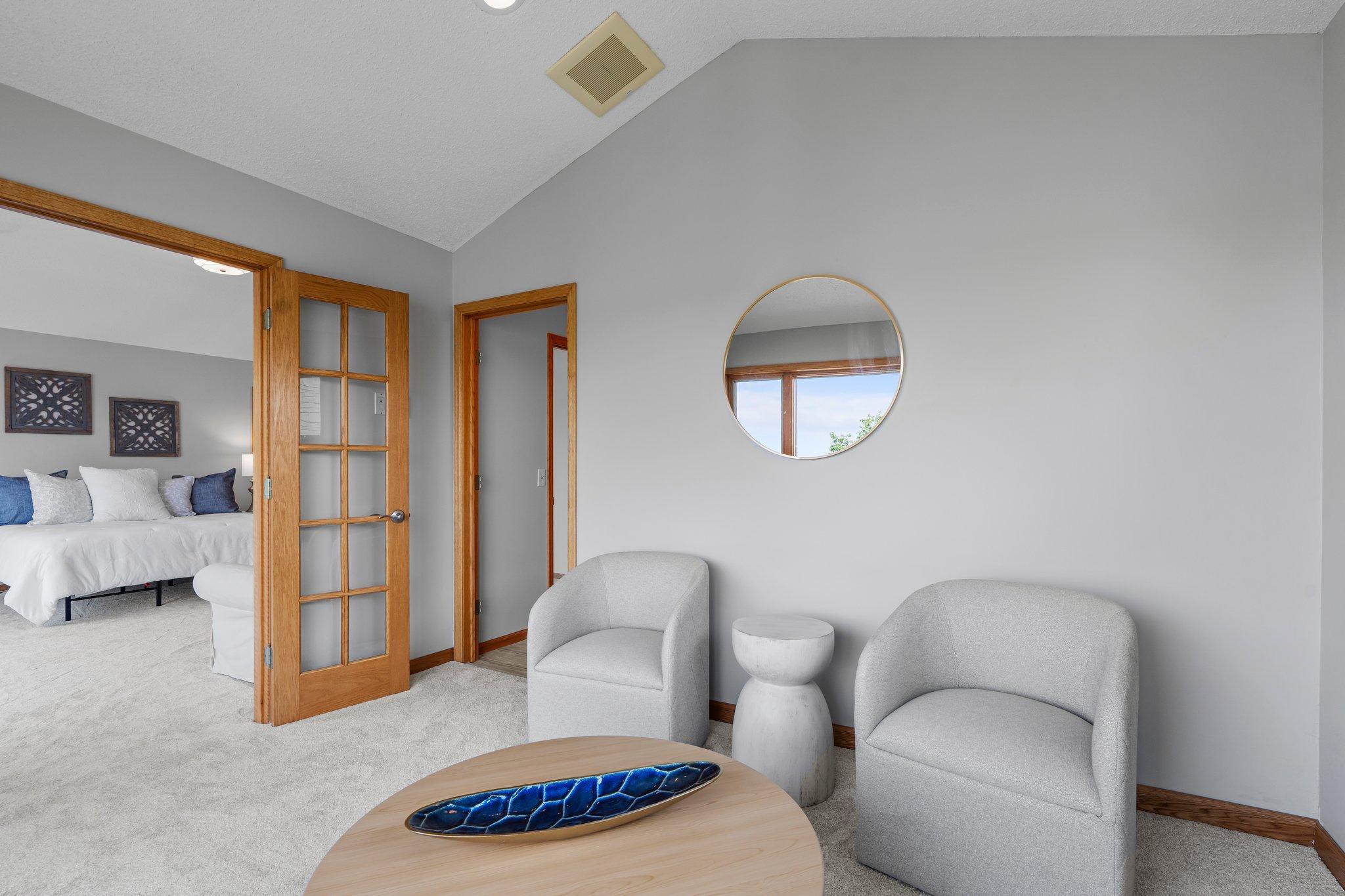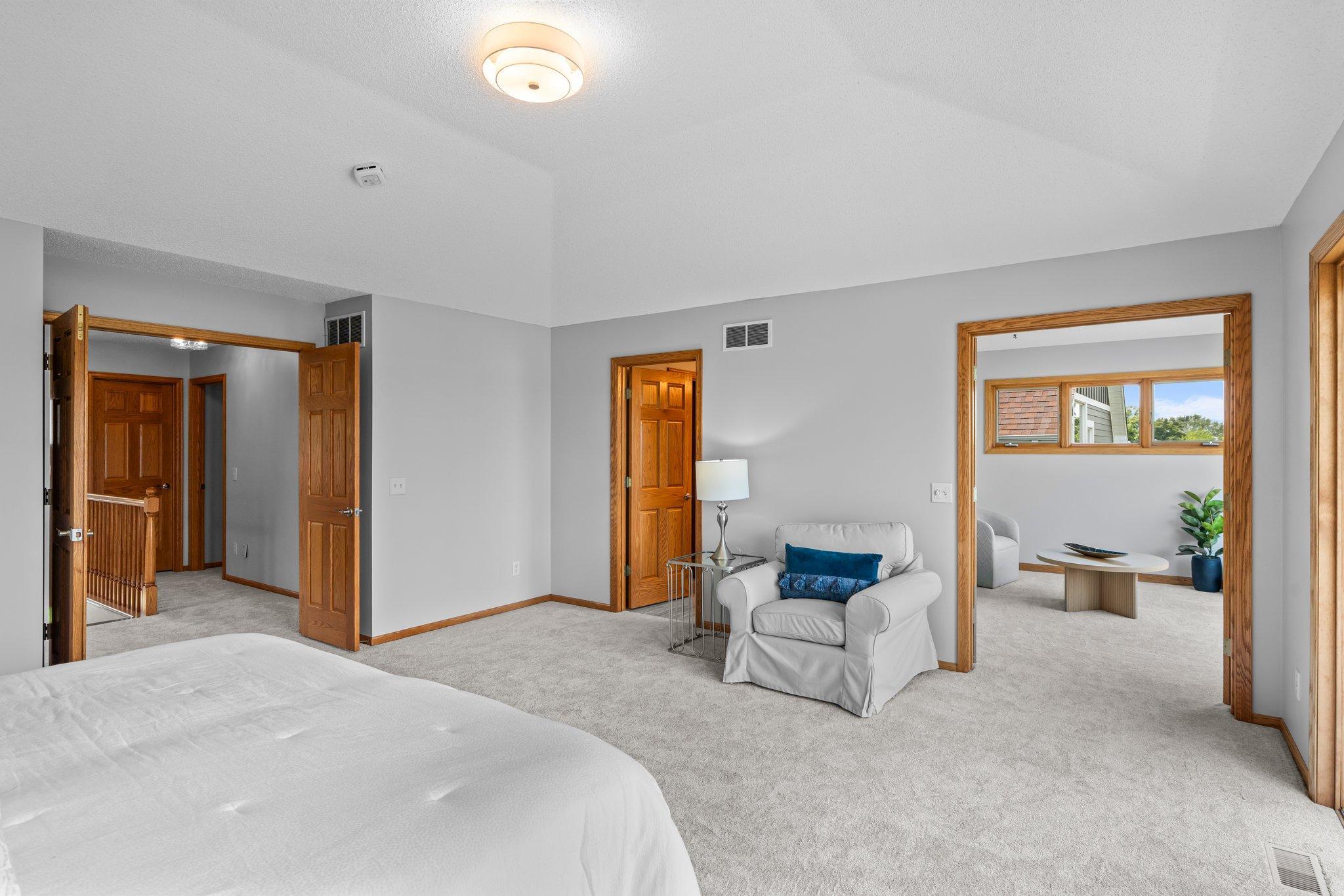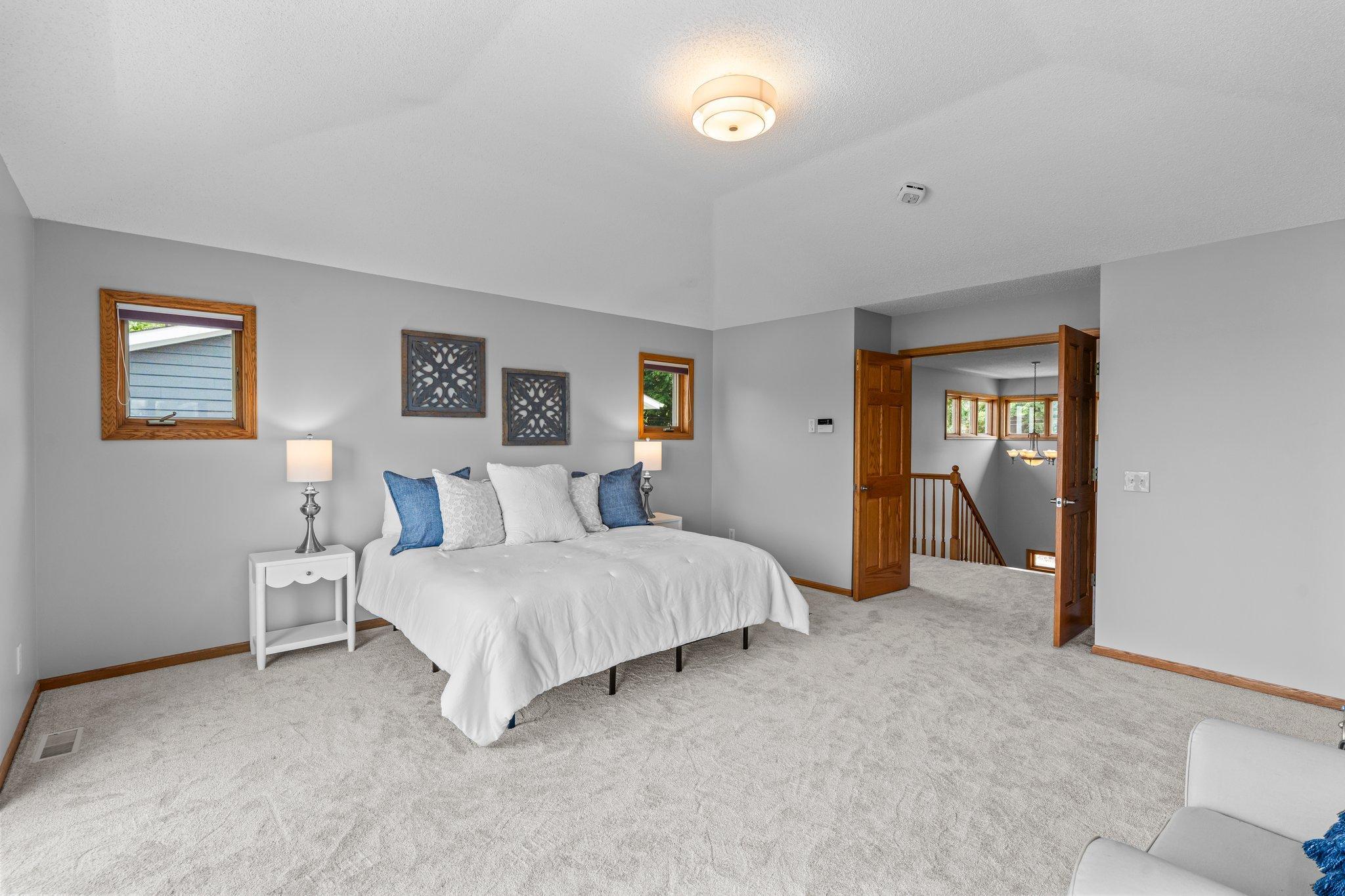 This beautifully updated Prior Lake home boasts 50 feet of sandy shoreline and sweeping lake views from nearly every room. The vaulted entry welcomes you with warm wood flooring that flows through the open main level. A spacious living room features custom built-ins, a cozy gas fireplace, and expansive windows opening to a lakeside deck—perfect for relaxing or entertaining. The kitchen is a showstopper with crisp white cabinetry, stone countertops, stainless steel appliances, tiled backsplash, and a center island with cooktop. An adjoining dining area makes every meal feel special with lake views as the backdrop. Upstairs, the private primary suite is a true retreat—double French doors open to a bright sitting area with new carpet, an ensuite ¾ bath with dual vanity, and a private balcony overlooking the water. A second bedroom, full bath, and open loft provide flexibility for family, guests, or a home office. The walkout lower level extends the living space with a family room and fireplace, an additional bedroom and bath, and a spacious laundry/mudroom—all designed to capture lake views. Outside, enjoy your own sandy beach, dock, and boat lift—easily accessed by stairs or a private lift. Just minutes from lakeside dining at Charlie’s on Prior and the heart of downtown Prior Lake, this home offers an unbeatable blend of luxury, location, and lifestyle.