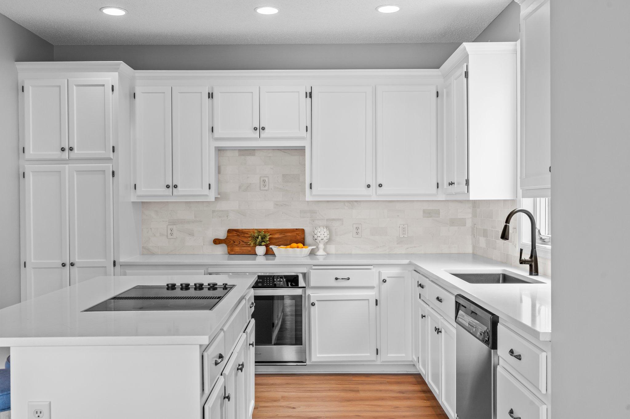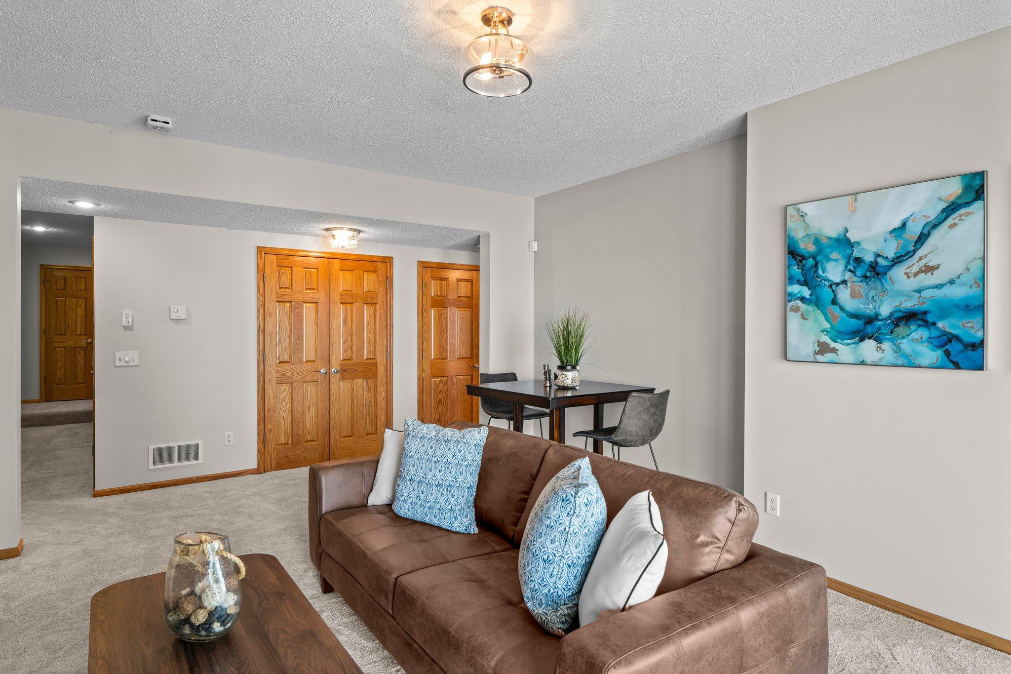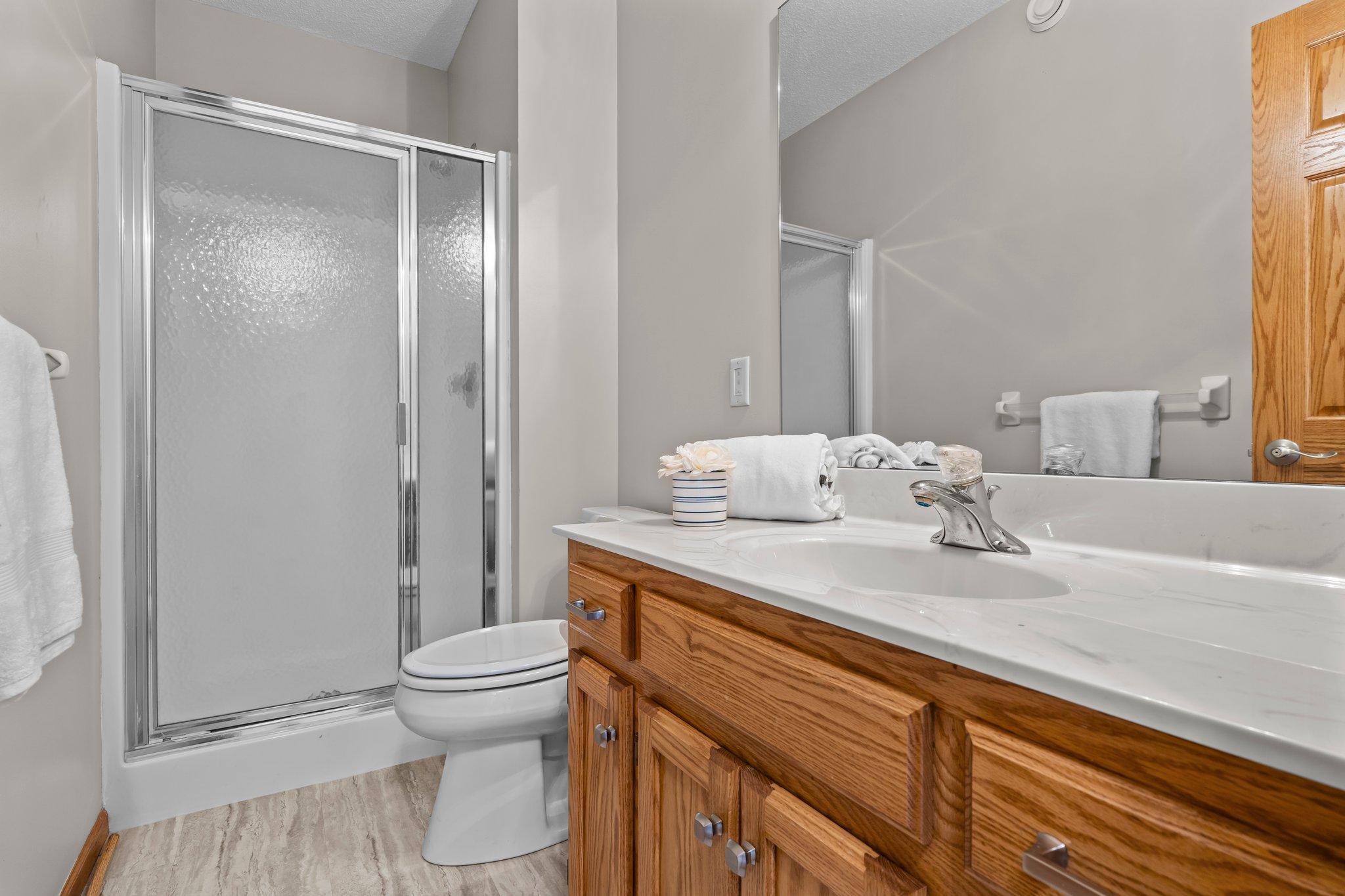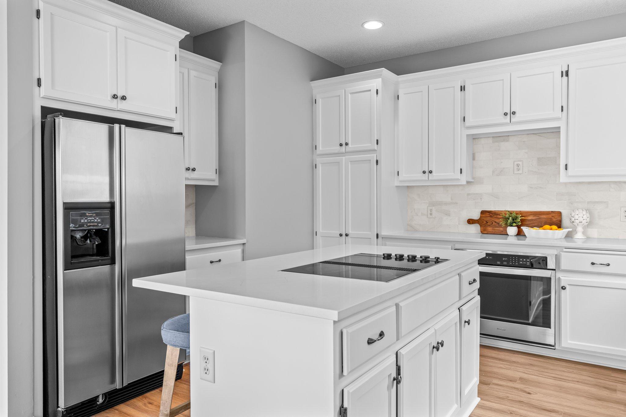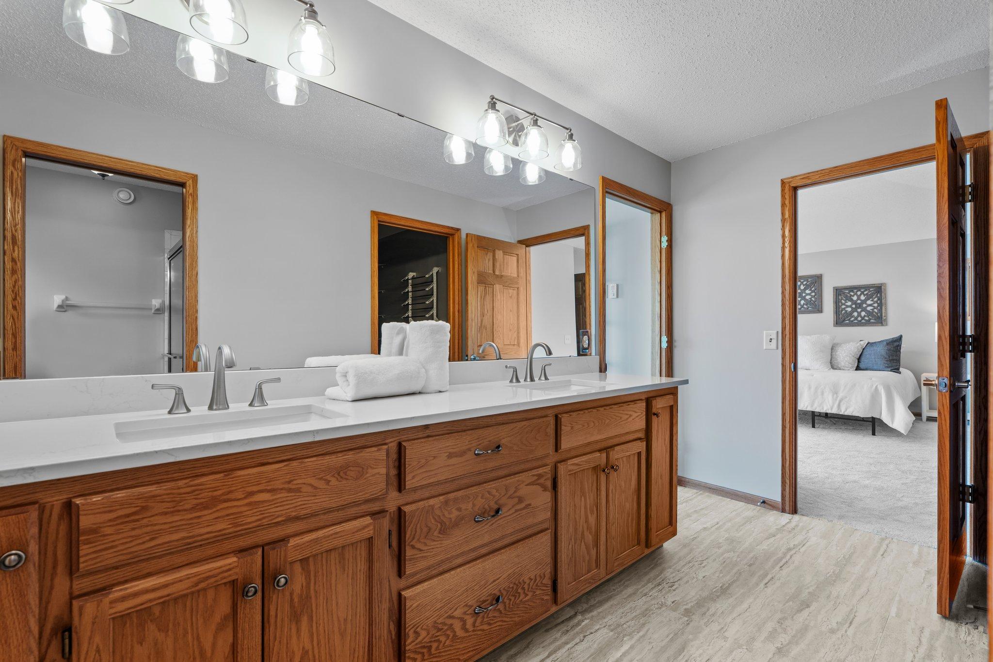 This beautifully updated Prior Lake home boasts 50 feet of sandy shoreline and sweeping lake views from nearly every room. The vaulted entry welcomes you with warm wood flooring that flows through the open main level. A spacious living room features custom built-ins, a cozy gas fireplace, and expansive windows opening to a lakeside deck—perfect for relaxing or entertaining. The kitchen is a showstopper with crisp white cabinetry, stone countertops, stainless steel appliances, tiled backsplash, and a center island with cooktop. An adjoining dining area makes every meal feel special with lake views as the backdrop. Upstairs, the private primary suite is a true retreat—double French doors open to a bright sitting area with new carpet, an ensuite ¾ bath with dual vanity, and a private balcony overlooking the water. A second bedroom, full bath, and open loft provide flexibility for family, guests, or a home office. The walkout lower level extends the living space with a family room and fireplace, an additional bedroom and bath, and a spacious laundry/mudroom—all designed to capture lake views. Outside, enjoy your own sandy beach, dock, and boat lift—easily accessed by stairs or a private lift. Just minutes from lakeside dining at Charlie’s on Prior and the heart of downtown Prior Lake, this home offers an unbeatable blend of luxury, location, and lifestyle.