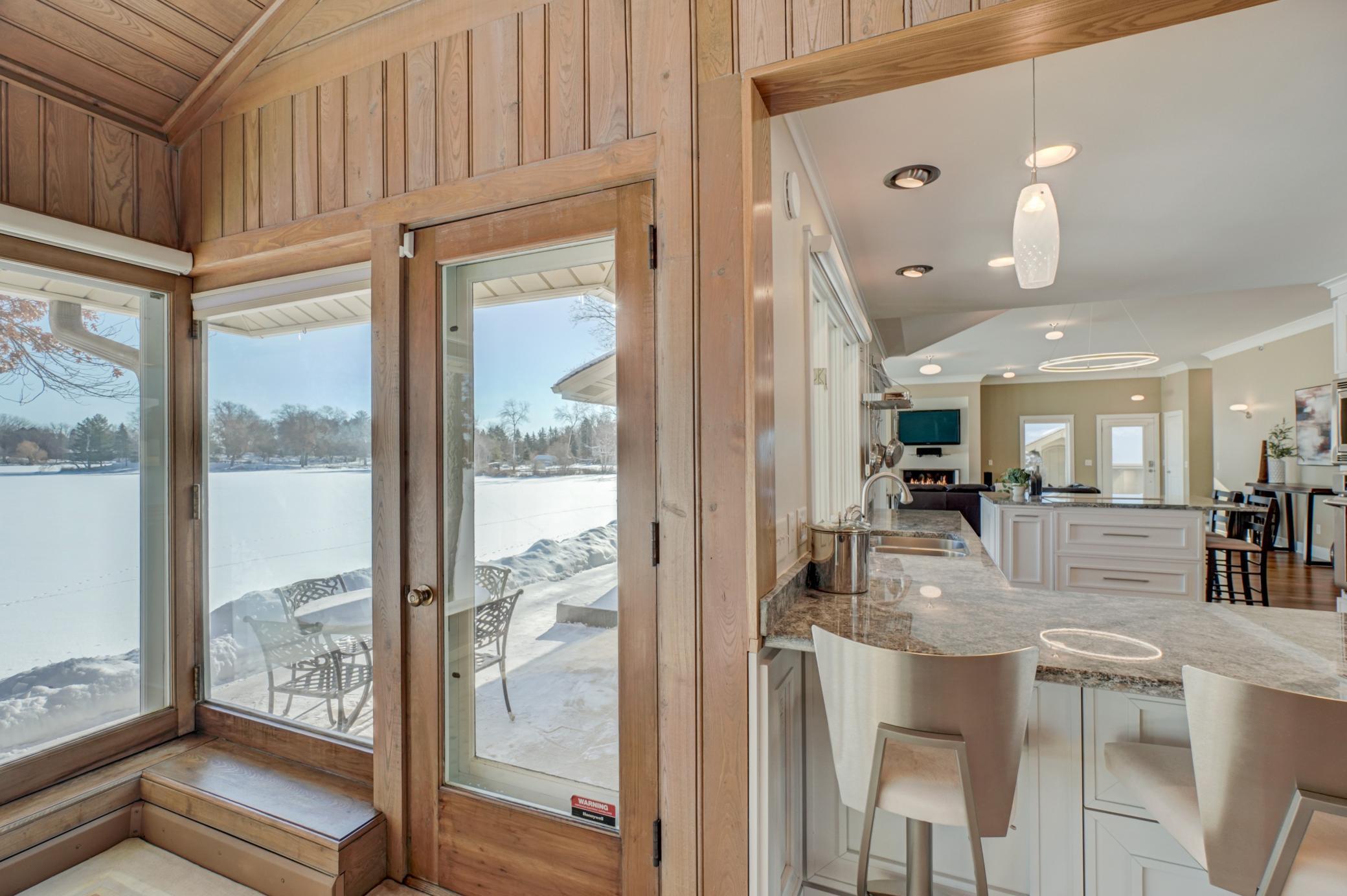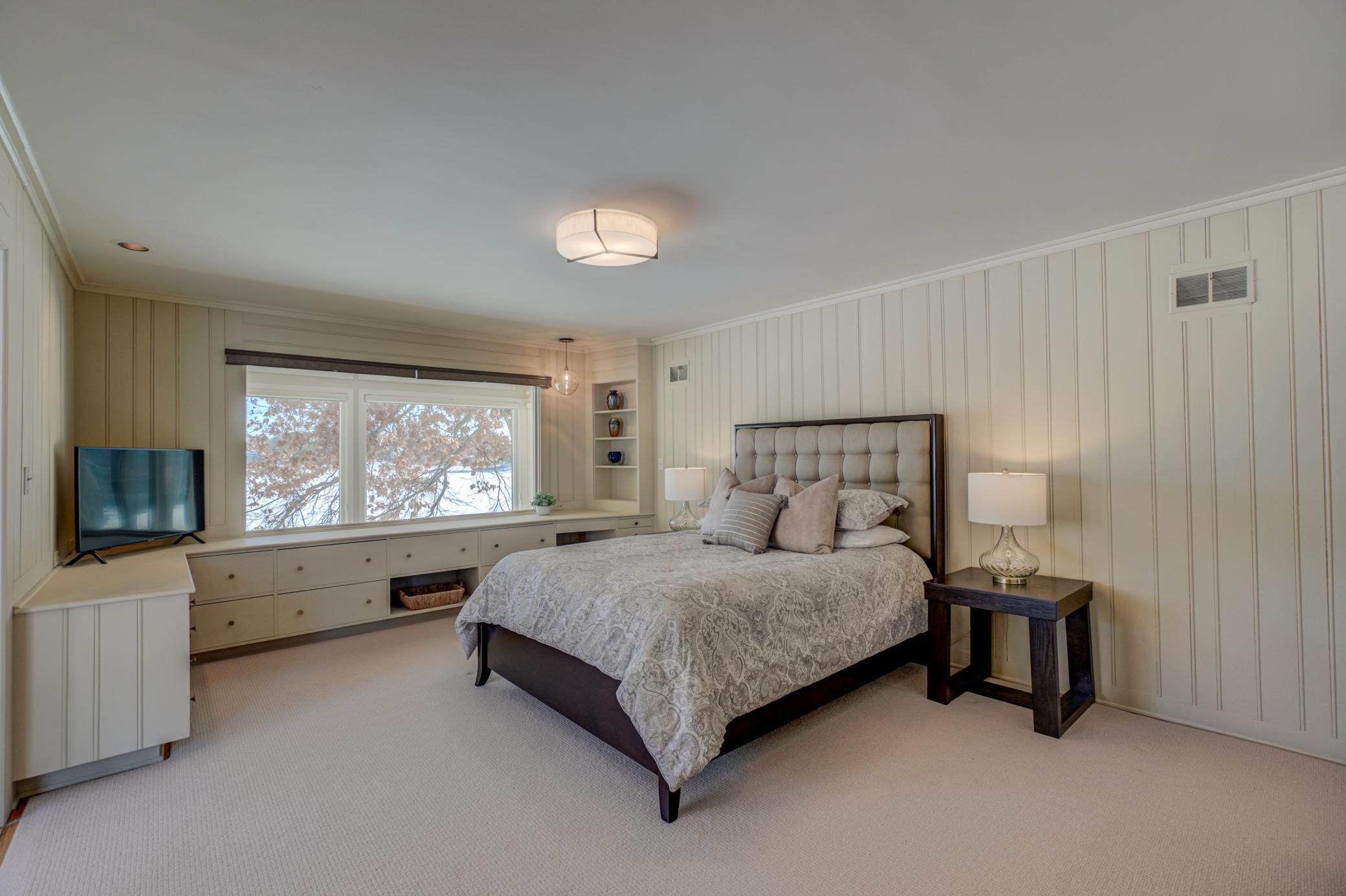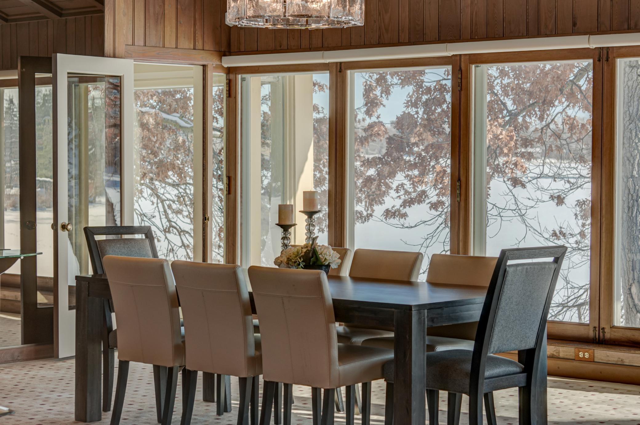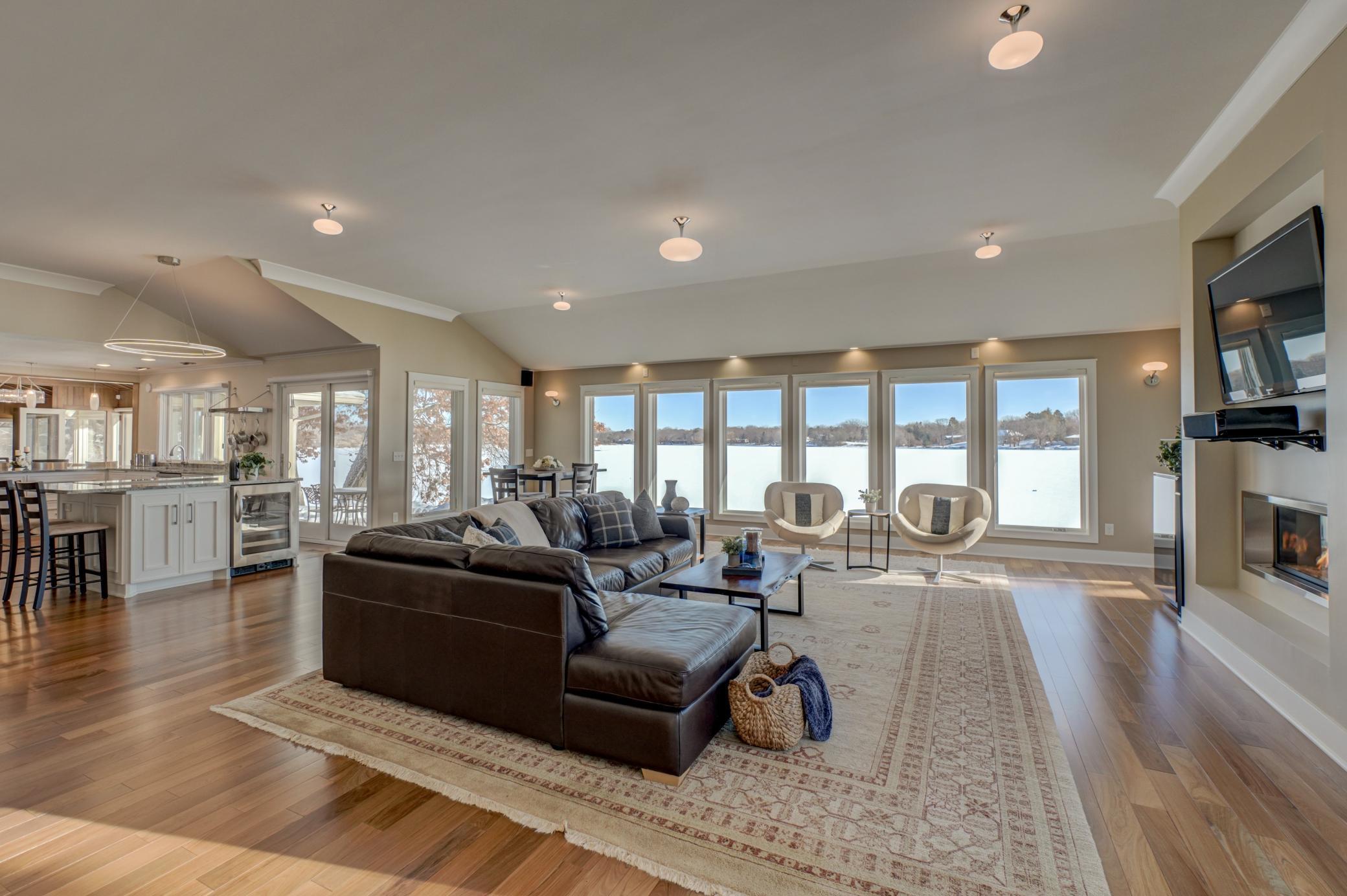 Welcome home to this mid-century modern rambler located on a 2 acre lot on the shores of Lake Gilfillan in the private community of North Oaks. You'll love the generously sized rooms and open, spacious floor plan with floor to ceiling windows and panoramic lake views. The custom kitchen features granite countertops, Thermador appliances, an induction cooktop, and an adjacent bar area and pantry space. The main floor primary suite features a walk-in closet, and spa like bath with heated floor that features a luxurious shower and separate soaking tub. Lakeside bedroom at the north end of the property has built-in cabinetry, sitting room with fireplace and space for a lakeside office. This home has all the right spaces for both everyday living, and entertaining of large gatherings of family and friends. The expansive lower level features an additional family room with a fireplace, media space, and plenty of room to spread out and enjoy. Relax over a glass of wine on the lakeside patio and take in the views of wildlife across the lake and beyond. The list of improvements for this meticulously maintained home is long, and recent improvements include new lighting, hardware, paint and landscaping. Three car garage includes EV hookup. Ready to move right in and enjoy!