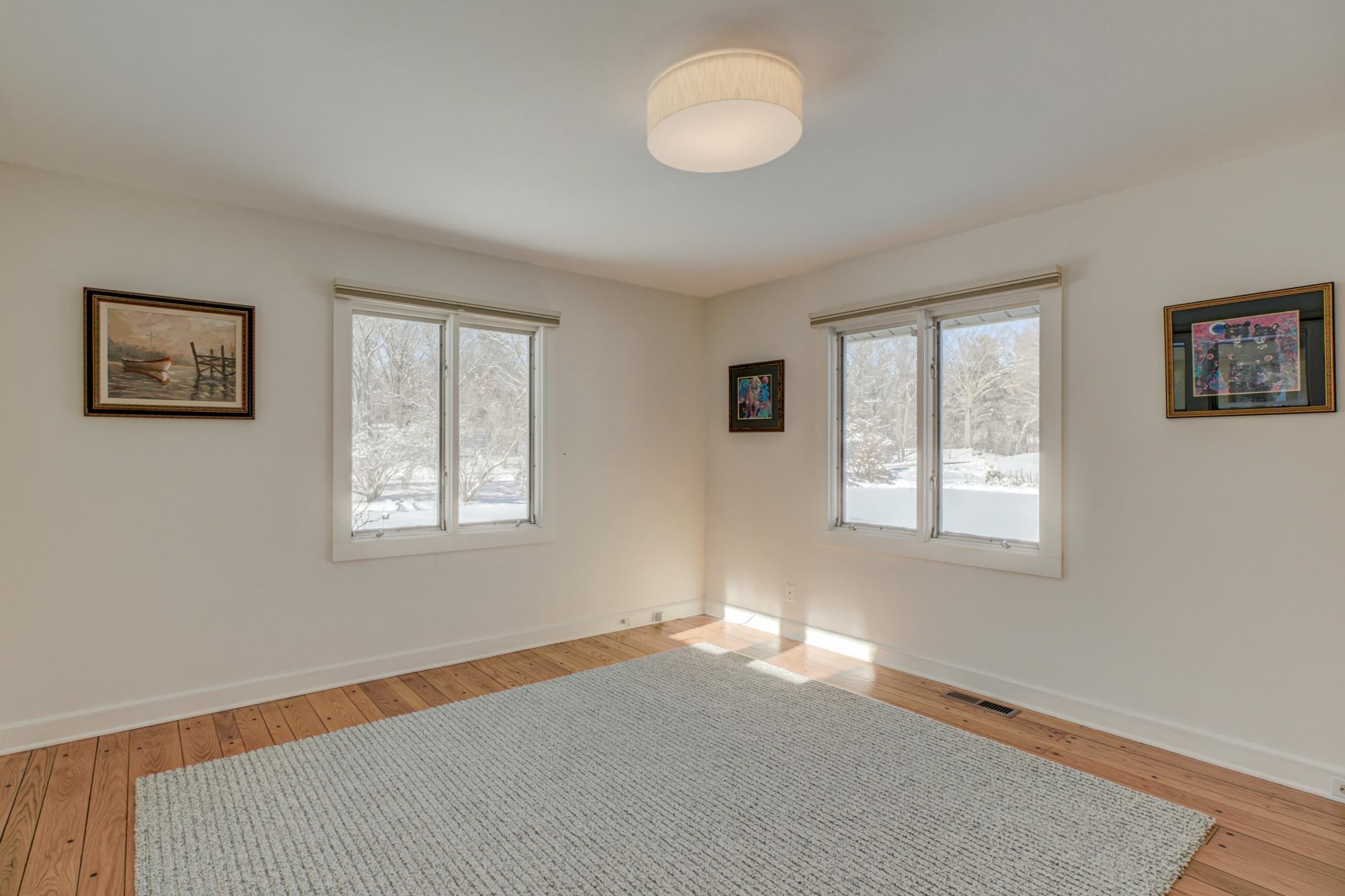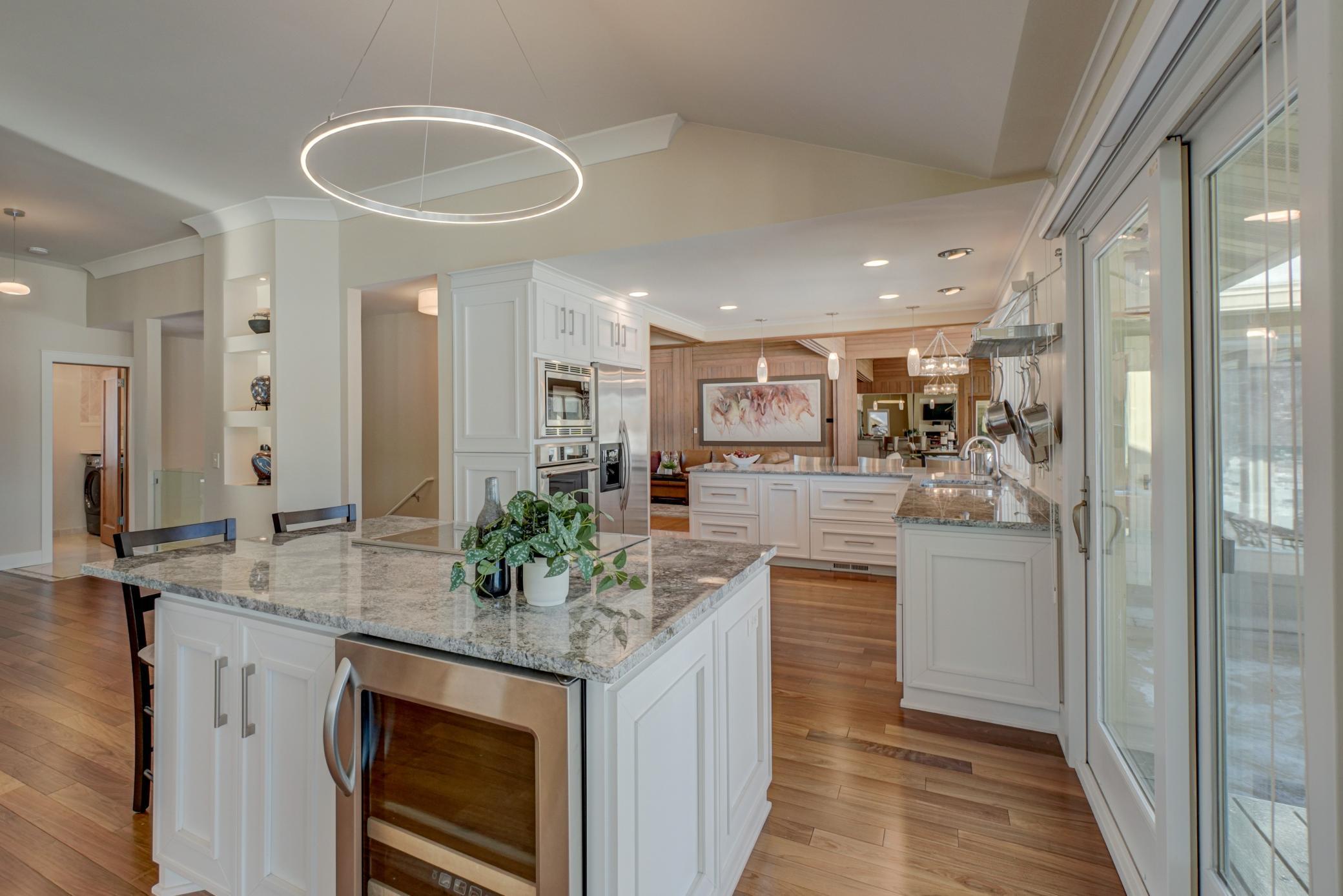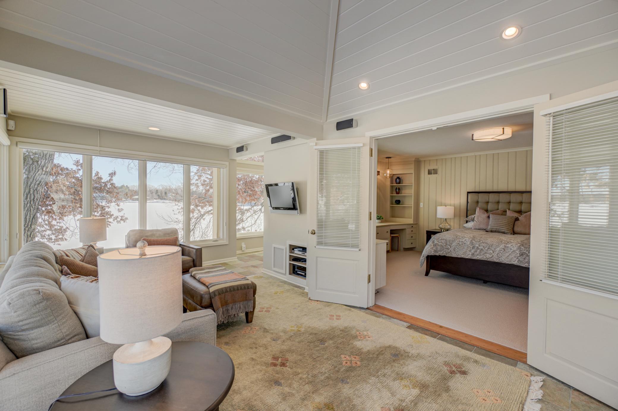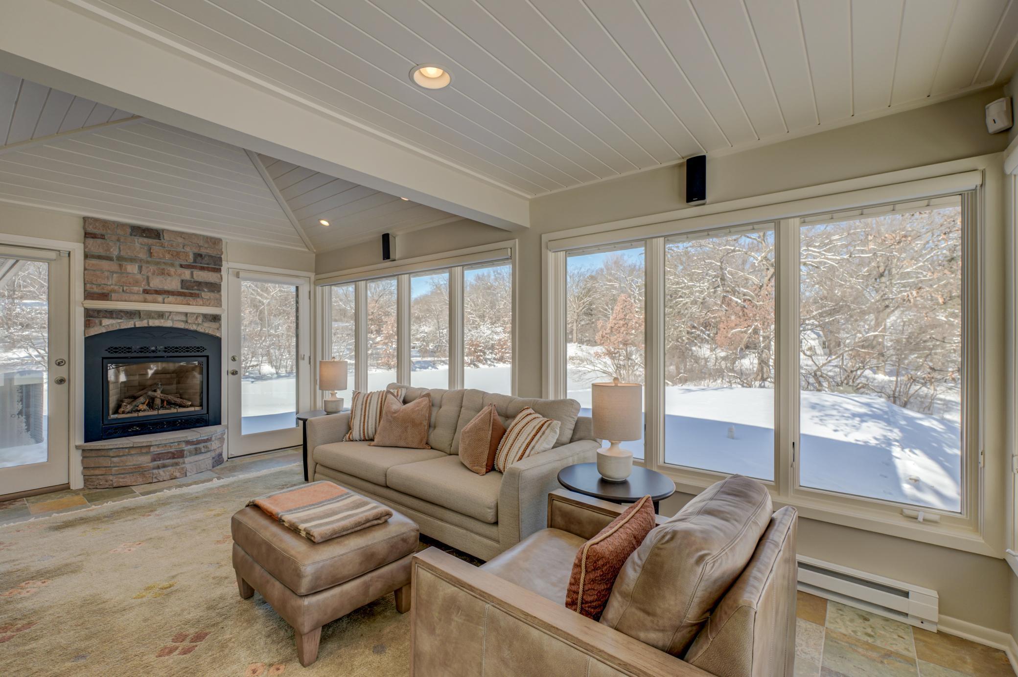 Welcome home to this mid-century modern rambler located on a 2 acre lot on the shores of Lake Gilfillan in the private community of North Oaks. You'll love the generously sized rooms and open, spacious floor plan with floor to ceiling windows and panoramic lake views. The custom kitchen features granite countertops, Thermador appliances, an induction cooktop, and an adjacent bar area and pantry space. The main floor primary suite features a walk-in closet, and spa like bath with heated floor that features a luxurious shower and separate soaking tub. Lakeside bedroom at the north end of the property has built-in cabinetry, sitting room with fireplace and space for a lakeside office. This home has all the right spaces for both everyday living, and entertaining of large gatherings of family and friends. The expansive lower level features an additional family room with a fireplace, media space, and plenty of room to spread out and enjoy. Relax over a glass of wine on the lakeside patio and take in the views of wildlife across the lake and beyond. The list of improvements for this meticulously maintained home is long, and recent improvements include new lighting, hardware, paint and landscaping. Three car garage includes EV hookup. Ready to move right in and enjoy!
