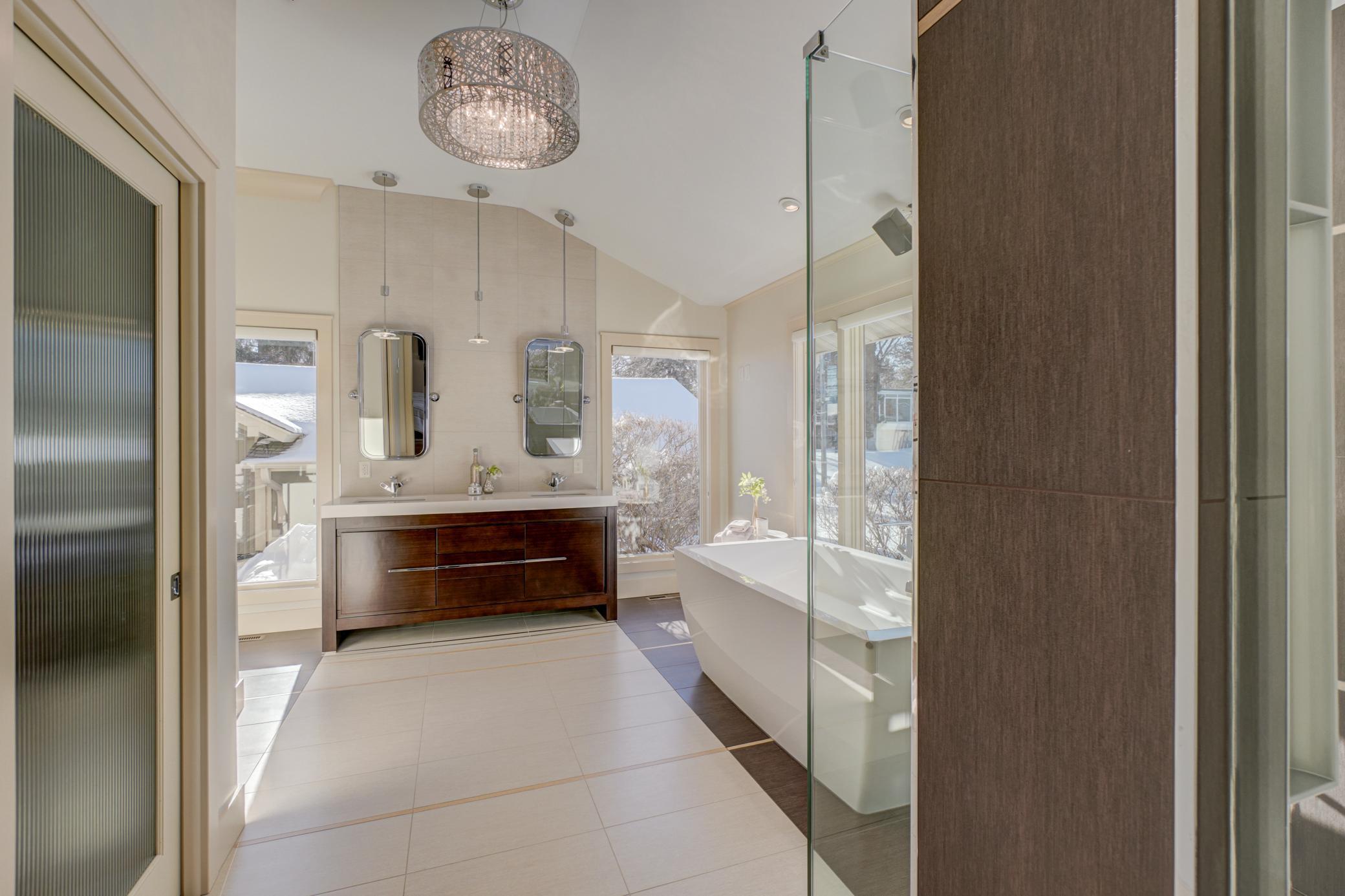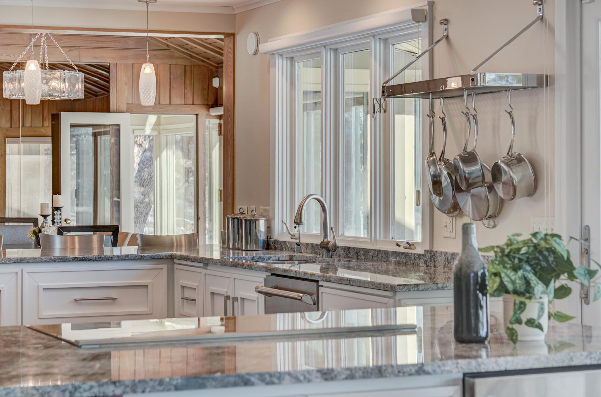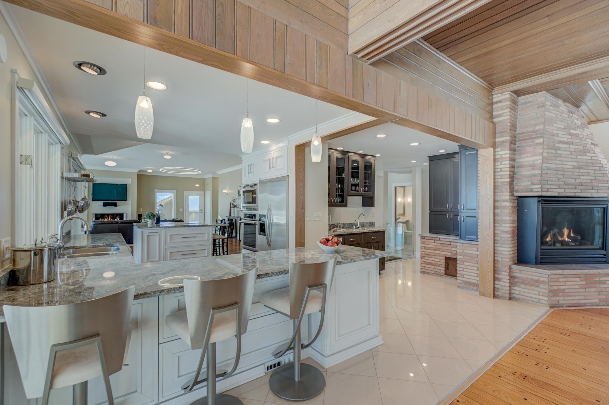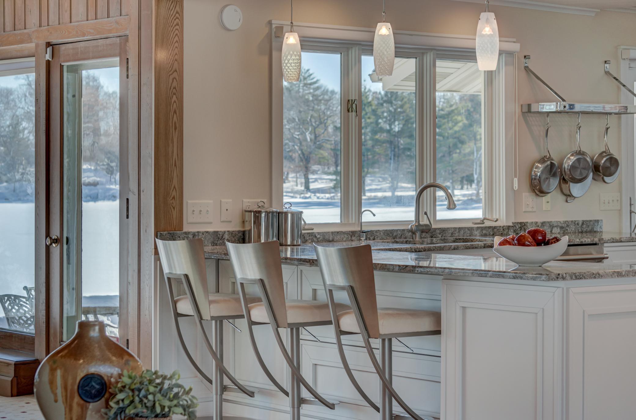 Welcome home to this mid-century modern rambler located on a 2 acre lot on the shores of Lake Gilfillan in the private community of North Oaks. You'll love the generously sized rooms and open, spacious floor plan with floor to ceiling windows and panoramic lake views. The custom kitchen features granite countertops, Thermador appliances, an induction cooktop, and an adjacent bar area and pantry space. The main floor primary suite features a walk-in closet, and spa like bath with heated floor that features a luxurious shower and separate soaking tub. Lakeside bedroom at the north end of the property has built-in cabinetry, sitting room with fireplace and space for a lakeside office. This home has all the right spaces for both everyday living, and entertaining of large gatherings of family and friends. The expansive lower level features an additional family room with a fireplace, media space, and plenty of room to spread out and enjoy. Relax over a glass of wine on the lakeside patio and take in the views of wildlife across the lake and beyond. The list of improvements for this meticulously maintained home is long, and recent improvements include new lighting, hardware, paint and landscaping. Three car garage includes EV hookup. Ready to move right in and enjoy!