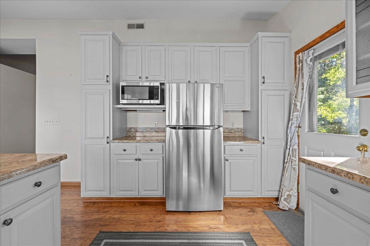 prime riverfront property is nestled on almost two beautiful acres and is truly one-of-a-kind, offering impressive, unmatched, and unobstructed views, proximity to the boat launch and a short drive to downtown Hudson. Enjoy no HOA dues, no covenants, a beautiful and fully functional "grandfathered" boathouse, a charming cabin-style guest house, and a cozy 3 bed/2 bath main-floor living home with picturesque water views. Additional features include a 3-car detached garage, 2 docks. As you enter the property, you're greeted by a convenient horseshoe driveway, making you feel as though you've arrived at your private waterfront retreat. The coveted boathouse, located right on the shoreline, is perfect for listening to the peaceful sounds of the river and watching boaters pass by-plus, it offers excellent storage! The guest cabin has a rustic yet updated feel and is simply darling. You'll find a spacious loft area, hardwood floors, kitchen,