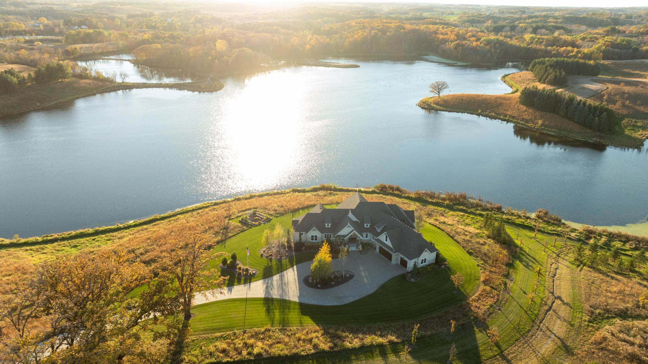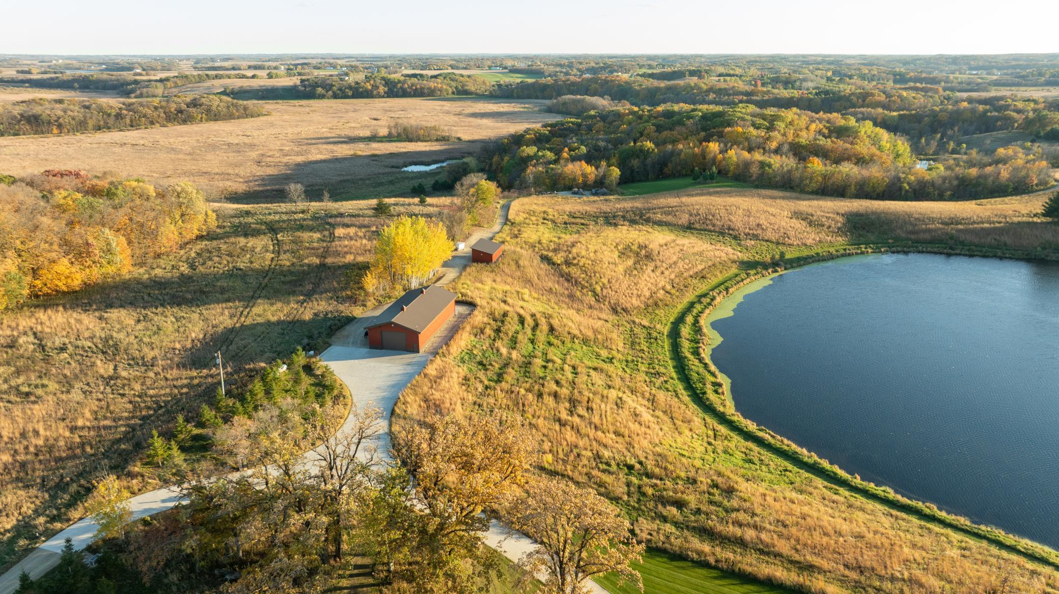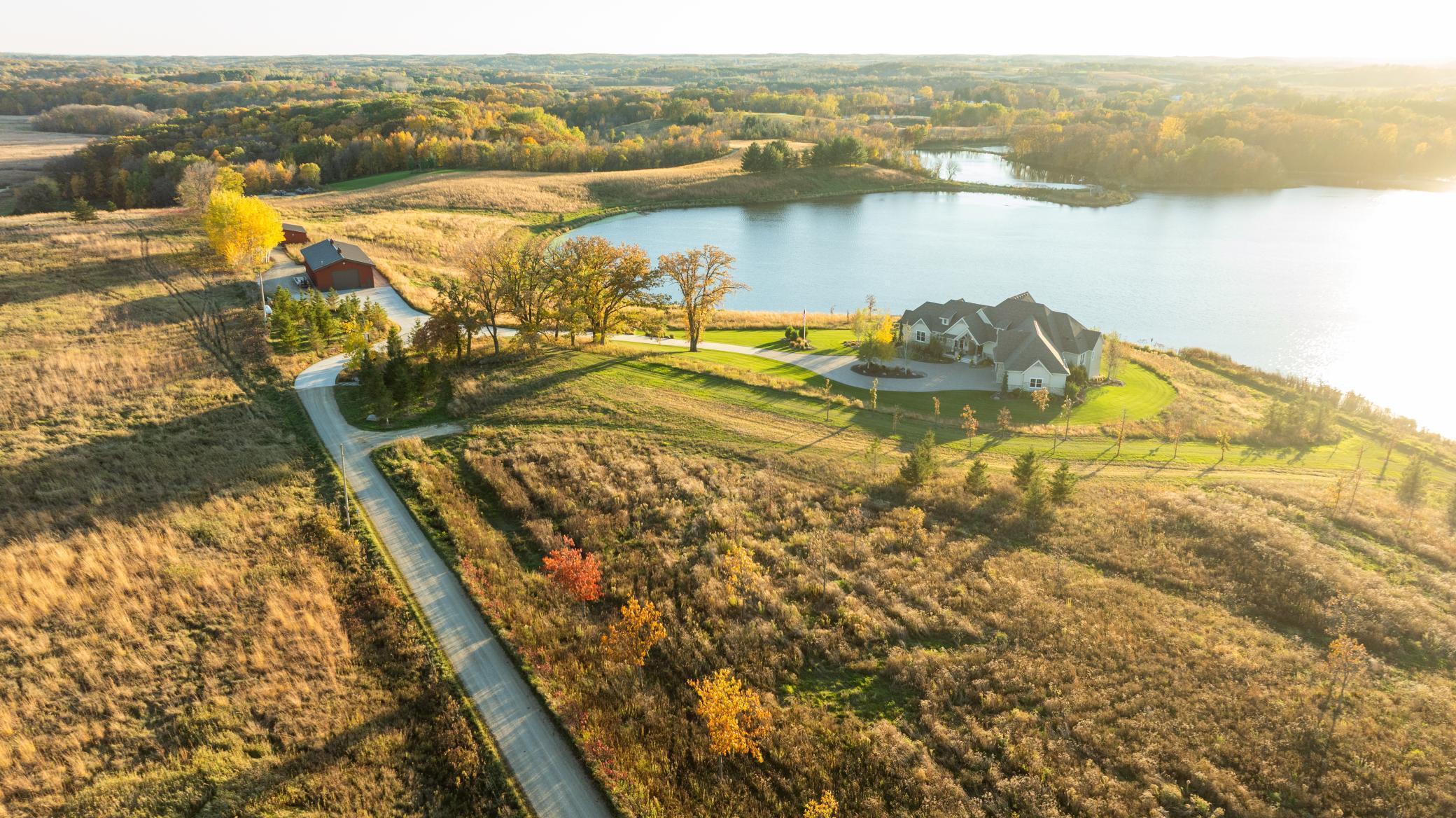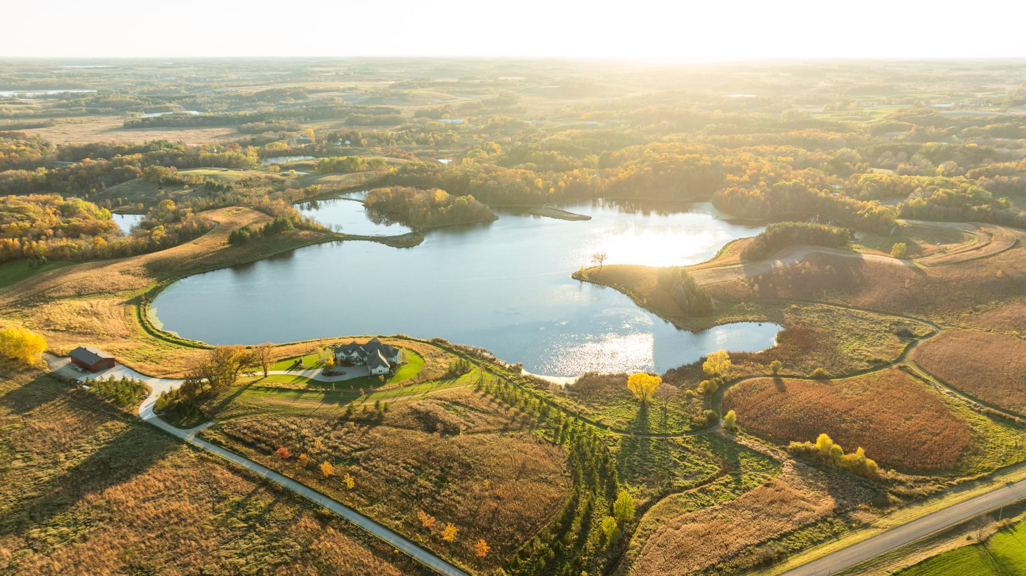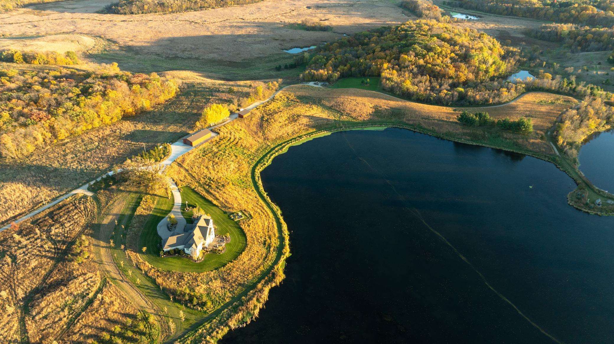 Discover Haven 189, an extraordinary 189-acre country estate nestled in pristine wildlife habitat, overlooking a breathtaking 40-acre pond. This private retreat blends luxury living, lodge-style entertaining, and unparalleled outdoor adventure, offering a lifestyle that is both hunter-friendly and adventurous. The property is rich with wildlife, including whitetail deer, turkeys, waterfowl, and pheasants, making it a true paradise for outdoor enthusiasts. Arriving at Haven 189, a powered entrance gate welcomes you to an elegant residence with rolling hills, native prairie grasses, mature landscaping, and scenic water views. The home itself is a harmonious mix of elegance and comfort. Inside, the great room features soaring natural wood beams, a dramatic stone fireplace, and European white oak floors, while walls of windows frame the pond and surrounding landscape. The chef’s kitchen is both functional and stunning, with custom cabinetry, a large island, premium countertops, and professional-grade appliances—perfect for everything from casual family meals to entertaining large groups. The owner’s suite is a private sanctuary, complete with vaulted ceilings, a seating area, and a spa-inspired bath with Jacuzzi tub, walk-in shower, heated tile floors, and dual vanities. A custom walk-in closet with center island connects directly to the laundry and craft room, providing unmatched convenience and organization. The main level also offers a refined office with built-in cabinets, providing a polished workspace. Two spacious guest suites each feature dual vanities, and access to a large shared walk-in shower with changing area. A versatile laundry and craft room offers custom cabinetry, oversized storage drawers, and a built-in bench—combining style with practicality. Step down to the lower level, designed with masculine warmth and rugged sophistication. Polished, heated concrete floors lead to a full-sized bar and a large entertainment space with gas fireplace and dining area, creating the perfect space for gatherings. The bunk room features three sets of built-in queen bunk beds, ideal for family, guests, or large groups. This level also includes two spacious bathrooms with walk-in showers, one featuring a urinal. The dedicated outdoor gear room offers six lockers, a large island with ample storage for supplies, and behind barn doors, a closet conceals a large steel security door to a gun vault with ample storage for firearms, ammo, and hunting gear. Walk-out patios with pavers, fire pit, and grilling stations extend the lodge-style atmosphere outdoors, perfect for relaxation and camaraderie. A private gym with audio and wall-mounted TV completes this level. Additional Home Amenities Haven 189 is equipped with a full in-home audio system, dual air handlers with individual zoning for total temperature control everywhere in the home, and seamless wireless internet throughout the home. Each bedroom and living space features dedicated, wall-mounted screens for comfortable, customized viewing. The home also includes a mechanical room with a full-size washer and dryer on pedestals, ideal for cleaning and caring for outdoor gear, ensuring convenience and efficiency throughout the estate. Adjacent to the home, the 1,450 sq. ft. attached, oversized three-car heated and air-conditioned garage offers epoxy-coated floors, in-floor drain, remote-access keyless locks, and a finished trophy wall, combining practicality with luxury. This space is ideal for storing vehicles, atv’s, utv’s, providing functionality without compromising style. Haven 189’s grounds are meticulously designed with automated outdoor lighting, lawn irrigation with chemical injection, and drip lines for landscaping, ensuring healthy and vibrant grounds year-round. An elevated hardscape vegetable garden with a built-in watering system adds both beauty and functionality, enhancing the estate’s outdoor living experience.
