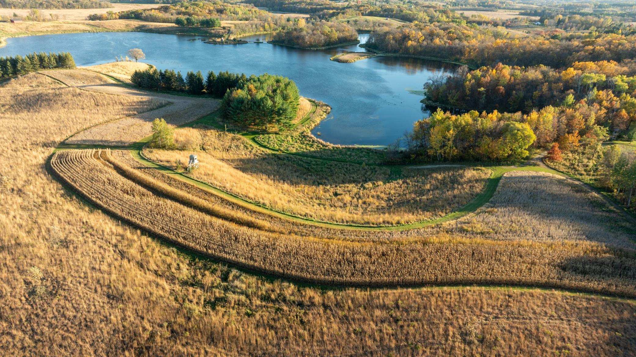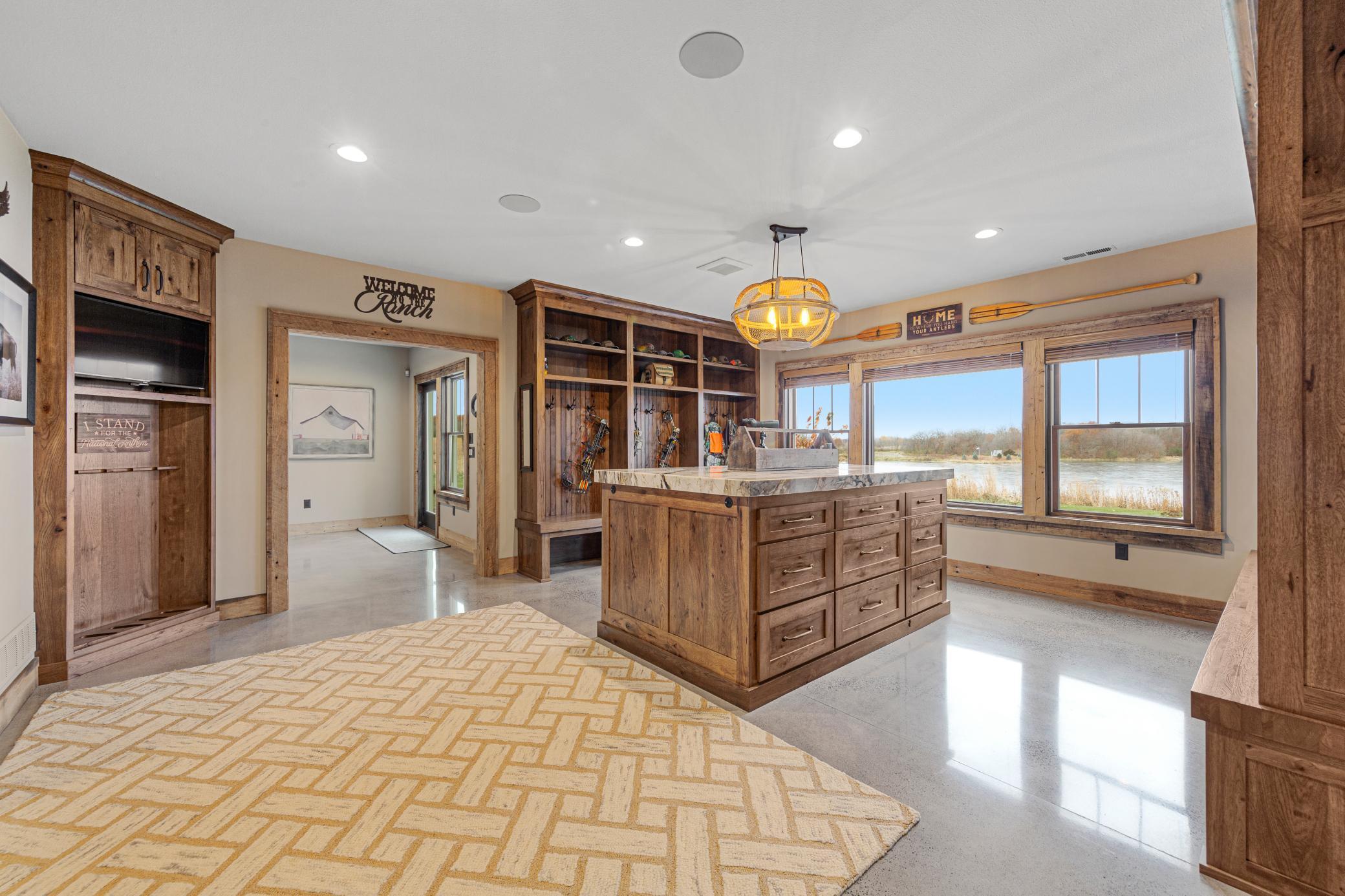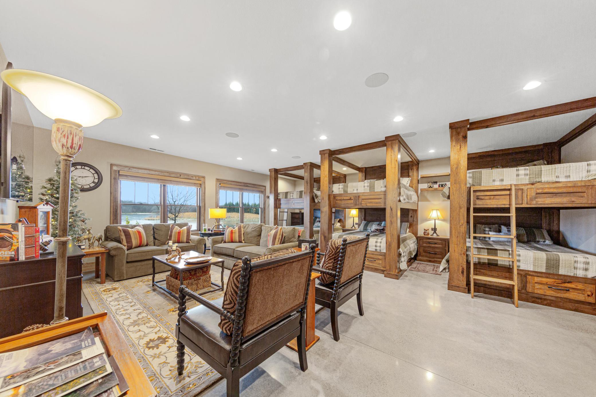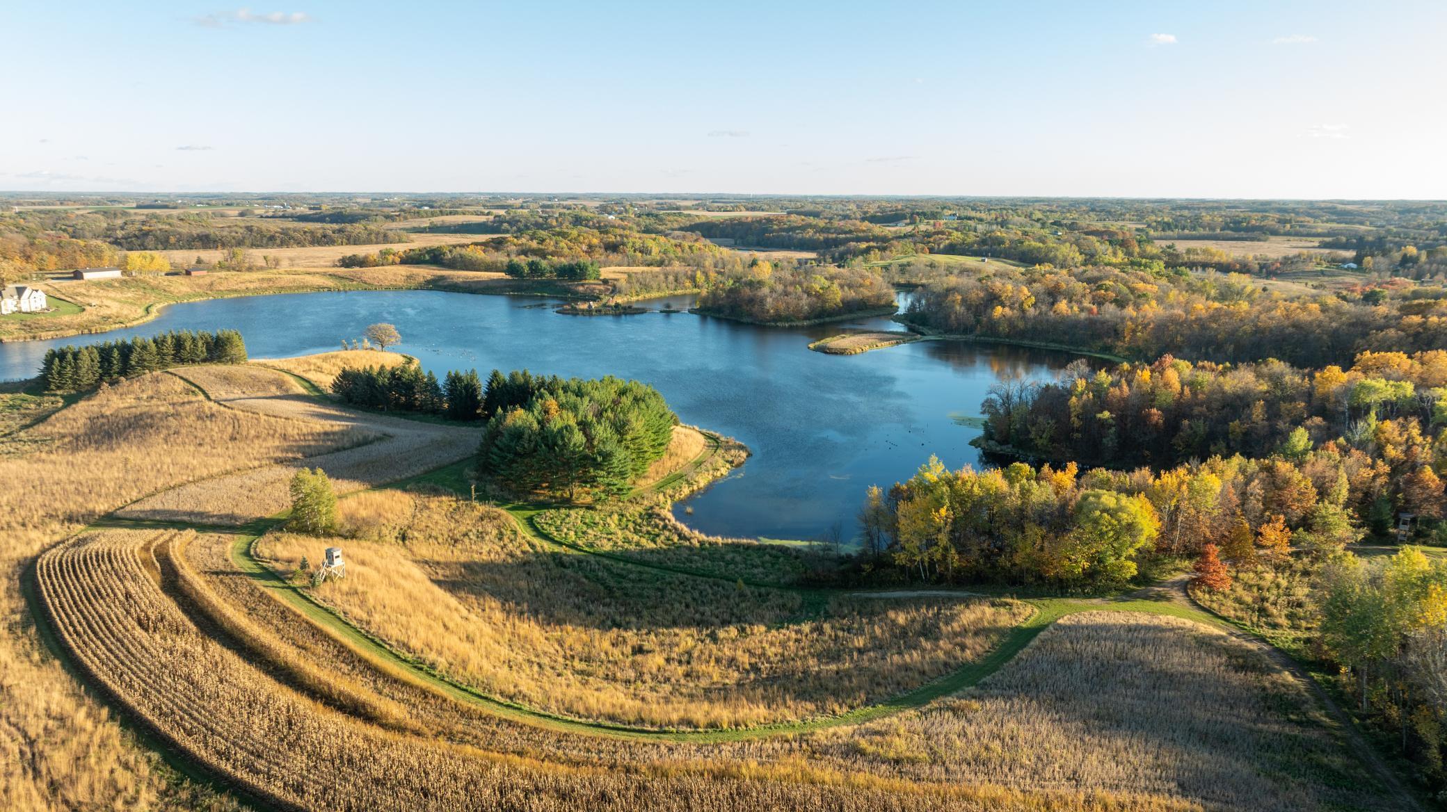 Discover Haven 189, an extraordinary 189-acre country estate nestled in pristine wildlife habitat, overlooking a breathtaking 40-acre pond. This private retreat blends luxury living, lodge-style entertaining, and unparalleled outdoor adventure, offering a lifestyle that is both hunter-friendly and adventurous. The property is rich with wildlife, including whitetail deer, turkeys, waterfowl, and pheasants, making it a true paradise for outdoor enthusiasts. Arriving at Haven 189, a powered entrance gate welcomes you to an elegant residence with rolling hills, native prairie grasses, mature landscaping, and scenic water views. The home itself is a harmonious mix of elegance and comfort. Inside, the great room features soaring natural wood beams, a dramatic stone fireplace, and European white oak floors, while walls of windows frame the pond and surrounding landscape. The chef’s kitchen is both functional and stunning, with custom cabinetry, a large island, premium countertops, and professional-grade appliances—perfect for everything from casual family meals to entertaining large groups. The owner’s suite is a private sanctuary, complete with vaulted ceilings, a seating area, and a spa-inspired bath with Jacuzzi tub, walk-in shower, heated tile floors, and dual vanities. A custom walk-in closet with center island connects directly to the laundry and craft room, providing unmatched convenience and organization. The main level also offers a refined office with built-in cabinets, providing a polished workspace. Two spacious guest suites each feature dual vanities, and access to a large shared walk-in shower with changing area. A versatile laundry and craft room offers custom cabinetry, oversized storage drawers, and a built-in bench—combining style with practicality. Step down to the lower level, designed with masculine warmth and rugged sophistication. Polished, heated concrete floors lead to a full-sized bar and a large entertainment space with gas fireplace and dining area, creating the perfect space for gatherings. The bunk room features three sets of built-in queen bunk beds, ideal for family, guests, or large groups. This level also includes two spacious bathrooms with walk-in showers, one featuring a urinal. The dedicated outdoor gear room offers six lockers, a large island with ample storage for supplies, and behind barn doors, a closet conceals a large steel security door to a gun vault with ample storage for firearms, ammo, and hunting gear. Walk-out patios with pavers, fire pit, and grilling stations extend the lodge-style atmosphere outdoors, perfect for relaxation and camaraderie. A private gym with audio and wall-mounted TV completes this level. Additional Home Amenities Haven 189 is equipped with a full in-home audio system, dual air handlers with individual zoning for total temperature control everywhere in the home, and seamless wireless internet throughout the home. Each bedroom and living space features dedicated, wall-mounted screens for comfortable, customized viewing. The home also includes a mechanical room with a full-size washer and dryer on pedestals, ideal for cleaning and caring for outdoor gear, ensuring convenience and efficiency throughout the estate. Adjacent to the home, the 1,450 sq. ft. attached, oversized three-car heated and air-conditioned garage offers epoxy-coated floors, in-floor drain, remote-access keyless locks, and a finished trophy wall, combining practicality with luxury. This space is ideal for storing vehicles, atv’s, utv’s, providing functionality without compromising style. Haven 189’s grounds are meticulously designed with automated outdoor lighting, lawn irrigation with chemical injection, and drip lines for landscaping, ensuring healthy and vibrant grounds year-round. An elevated hardscape vegetable garden with a built-in watering system adds both beauty and functionality, enhancing the estate’s outdoor living experience.