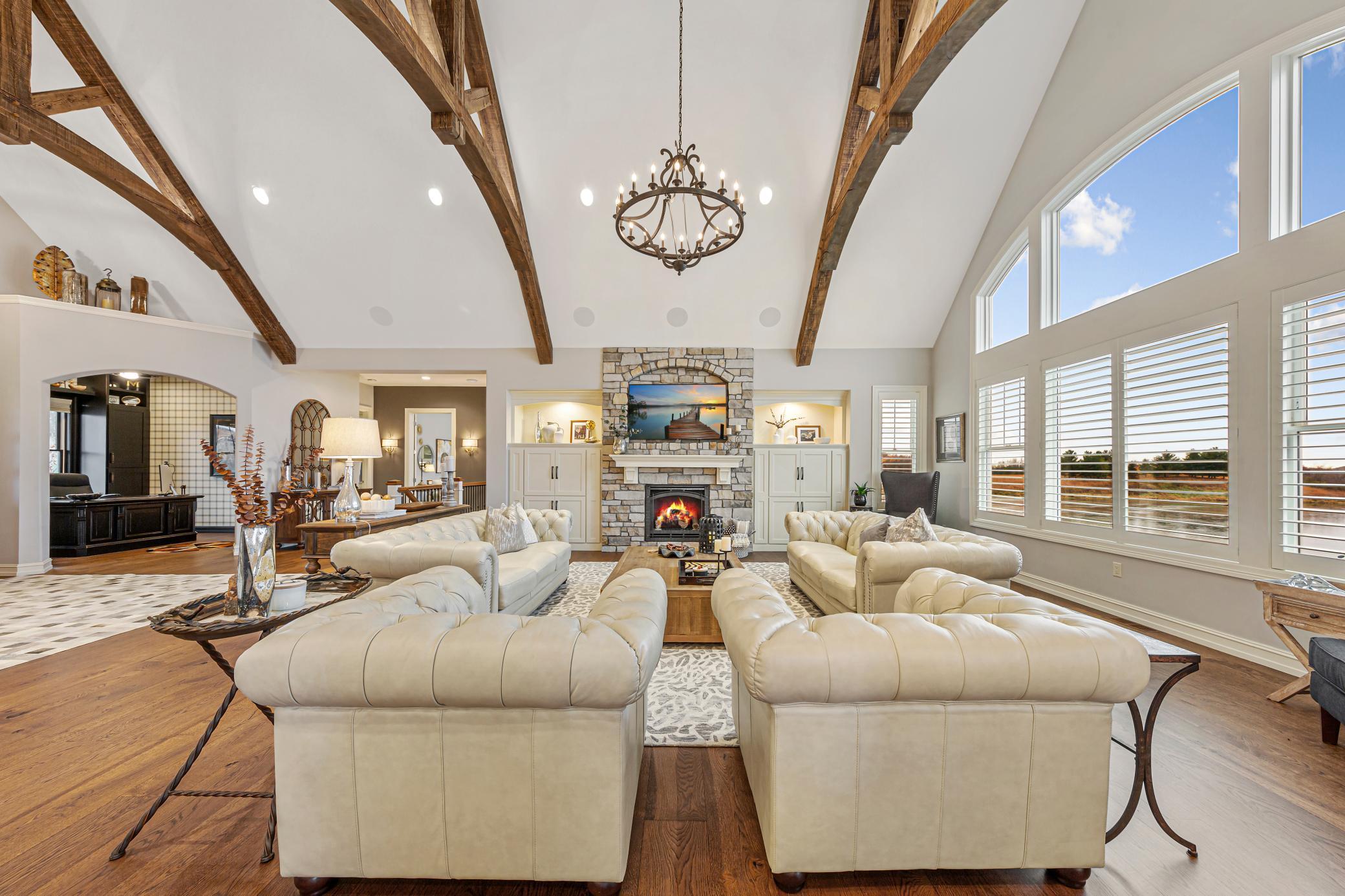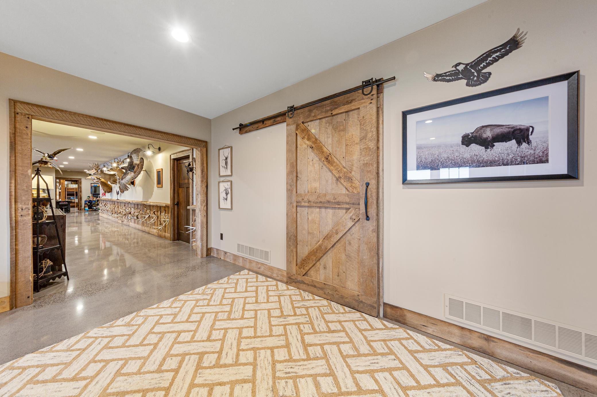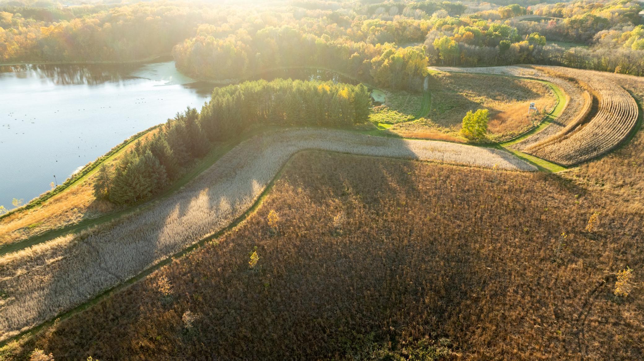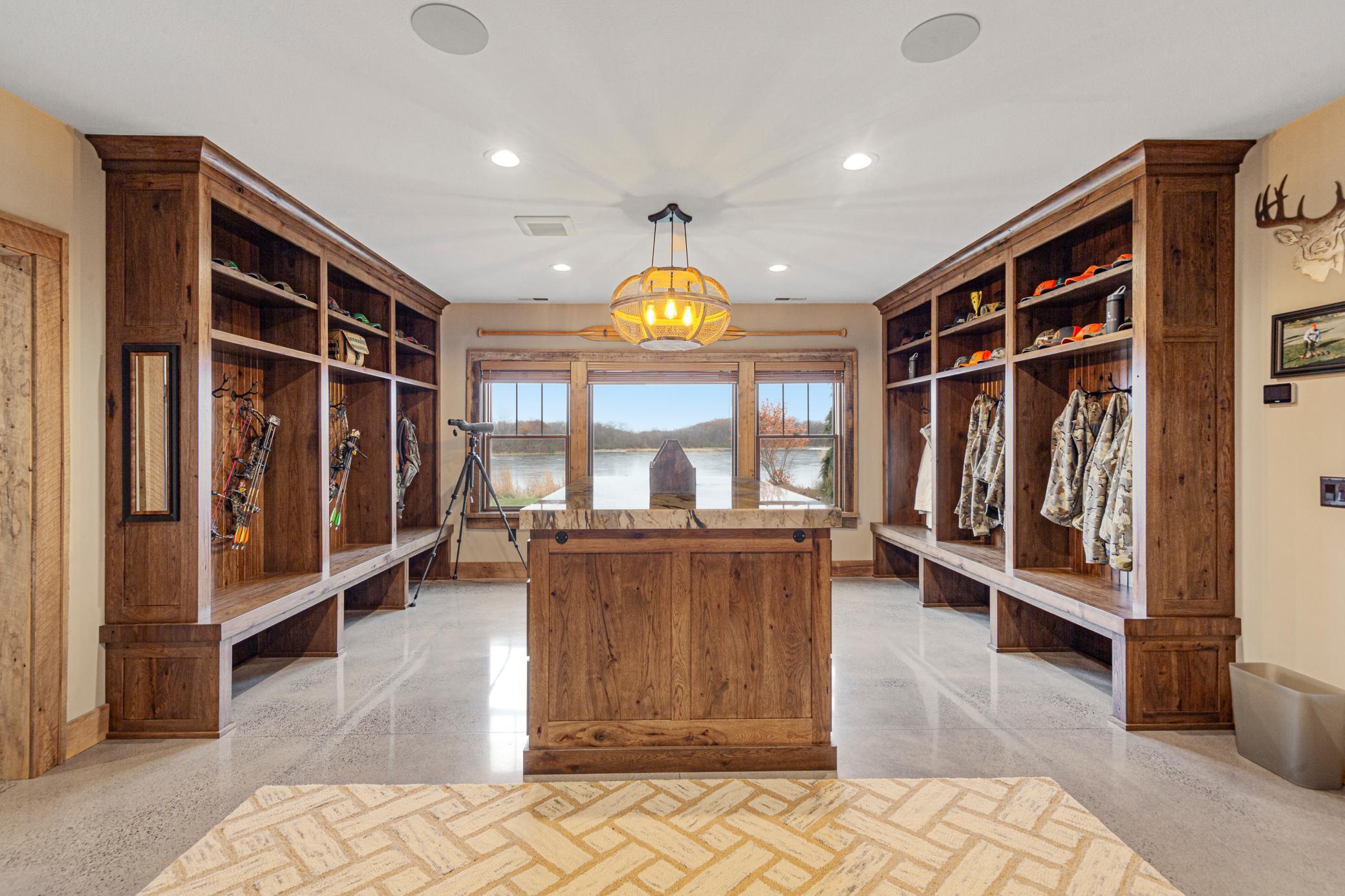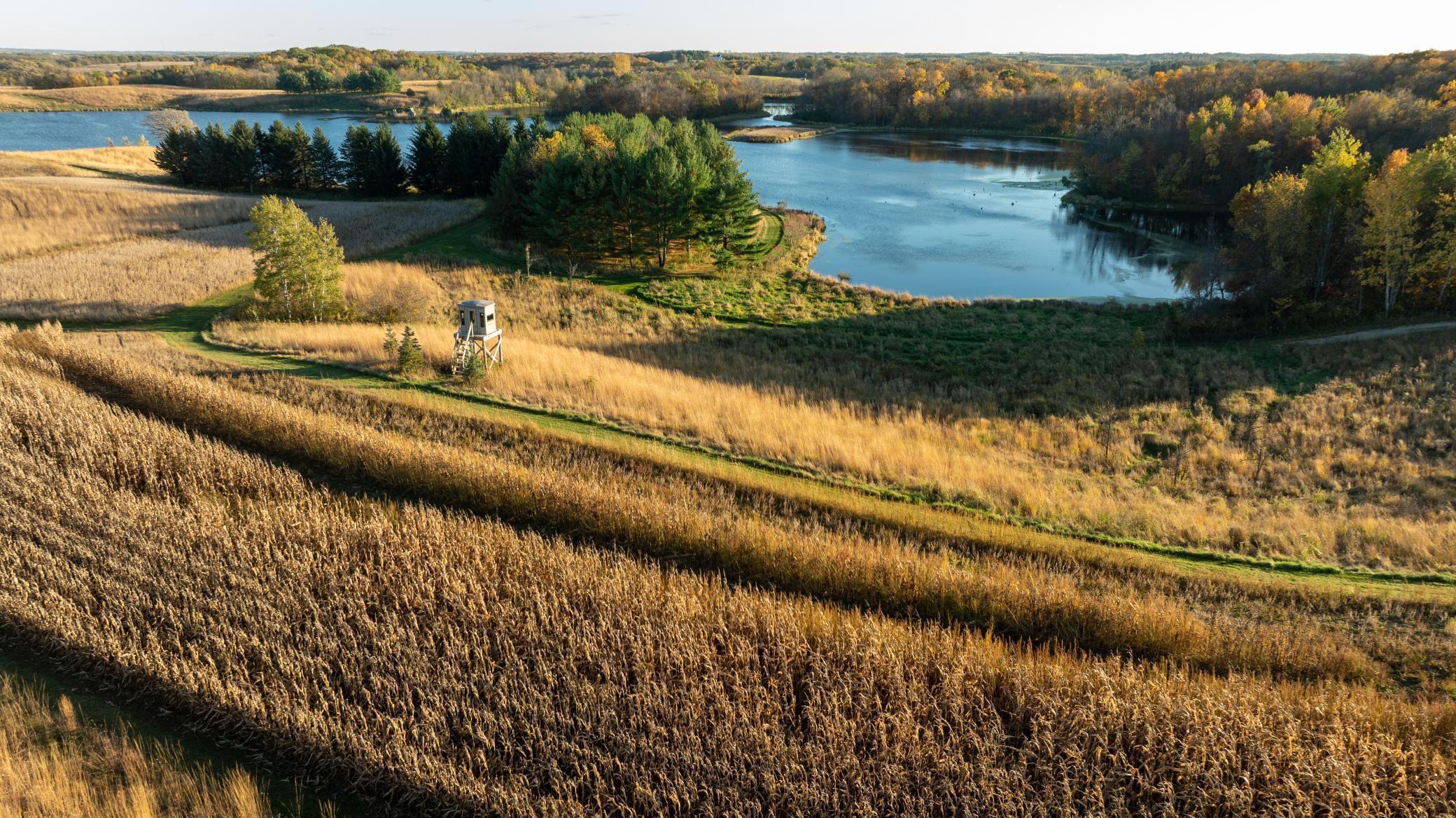 Discover Haven 189, an extraordinary 189-acre country estate nestled in pristine wildlife habitat, overlooking a breathtaking 40-acre pond. This private retreat blends luxury living, lodge-style entertaining, and unparalleled outdoor adventure, offering a lifestyle that is both hunter-friendly and adventurous. The property is rich with wildlife, including whitetail deer, turkeys, waterfowl, and pheasants, making it a true paradise for outdoor enthusiasts. Arriving at Haven 189, a powered entrance gate welcomes you to an elegant residence with rolling hills, native prairie grasses, mature landscaping, and scenic water views. The home itself is a harmonious mix of elegance and comfort. Inside, the great room features soaring natural wood beams, a dramatic stone fireplace, and European white oak floors, while walls of windows frame the pond and surrounding landscape. The chef’s kitchen is both functional and stunning, with custom cabinetry, a large island, premium countertops, and professional-grade appliances—perfect for everything from casual family meals to entertaining large groups. The owner’s suite is a private sanctuary, complete with vaulted ceilings, a seating area, and a spa-inspired bath with Jacuzzi tub, walk-in shower, heated tile floors, and dual vanities. A custom walk-in closet with center island connects directly to the laundry and craft room, providing unmatched convenience and organization. The main level also offers a refined office with built-in cabinets, providing a polished workspace. Two spacious guest suites each feature dual vanities, and access to a large shared walk-in shower with changing area. A versatile laundry and craft room offers custom cabinetry, oversized storage drawers, and a built-in bench—combining style with practicality. Step down to the lower level, designed with masculine warmth and rugged sophistication. Polished, heated concrete floors lead to a full-sized bar and a large entertainment space with gas fireplace and dining area, creating the perfect space for gatherings. The bunk room features three sets of built-in queen bunk beds, ideal for family, guests, or large groups. This level also includes two spacious bathrooms with walk-in showers, one featuring a urinal. The dedicated outdoor gear room offers six lockers, a large island with ample storage for supplies, and behind barn doors, a closet conceals a large steel security door to a gun vault with ample storage for firearms, ammo, and hunting gear. Walk-out patios with pavers, fire pit, and grilling stations extend the lodge-style atmosphere outdoors, perfect for relaxation and camaraderie. A private gym with audio and wall-mounted TV completes this level. Additional Home Amenities Haven 189 is equipped with a full in-home audio system, dual air handlers with individual zoning for total temperature control everywhere in the home, and seamless wireless internet throughout the home. Each bedroom and living space features dedicated, wall-mounted screens for comfortable, customized viewing. The home also includes a mechanical room with a full-size washer and dryer on pedestals, ideal for cleaning and caring for outdoor gear, ensuring convenience and efficiency throughout the estate. Adjacent to the home, the 1,450 sq. ft. attached, oversized three-car heated and air-conditioned garage offers epoxy-coated floors, in-floor drain, remote-access keyless locks, and a finished trophy wall, combining practicality with luxury. This space is ideal for storing vehicles, atv’s, utv’s, providing functionality without compromising style. Haven 189’s grounds are meticulously designed with automated outdoor lighting, lawn irrigation with chemical injection, and drip lines for landscaping, ensuring healthy and vibrant grounds year-round. An elevated hardscape vegetable garden with a built-in watering system adds both beauty and functionality, enhancing the estate’s outdoor living experience.