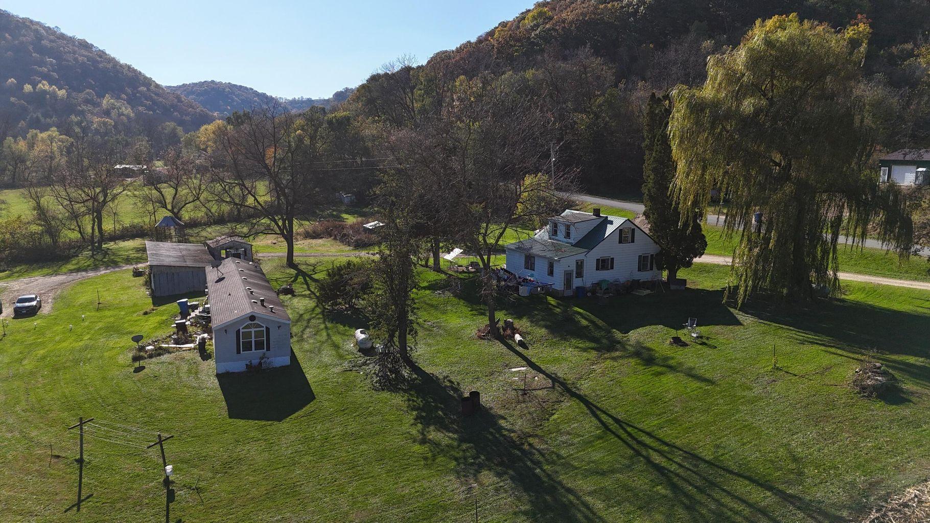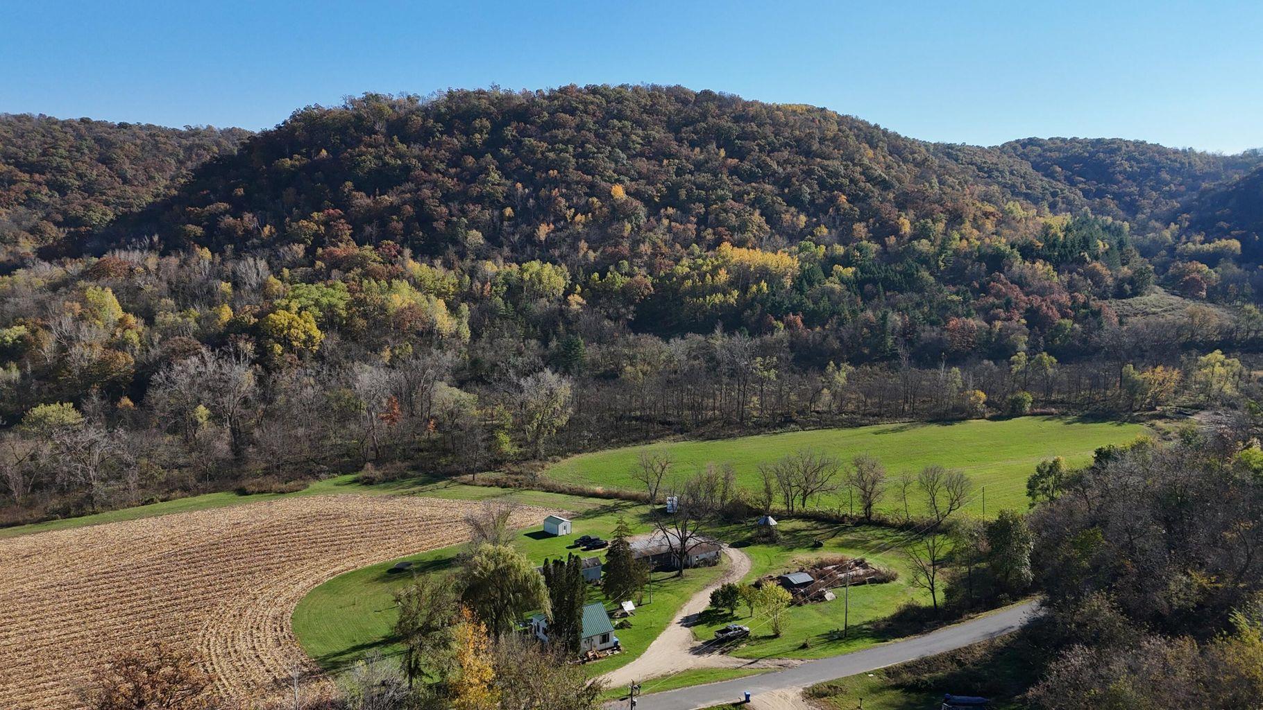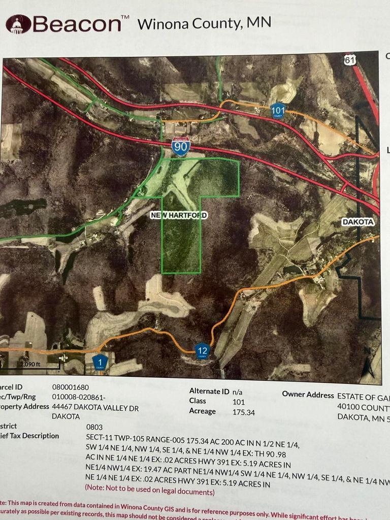 175.34 acres located in Winona County on the edge of Dakota. This property offers a little bit of everything. Hunting, recreational, tillable and pasture all wrapped into one with a creek meandering through it. 3 bedroom farm house and trailer are both rented out month to month. Approximately 28 acres of tillable land is rented out also. Several open grassy acres would be ideal for horses or cattle. Record state buck was shot on the adjoining property a couple of years ago!