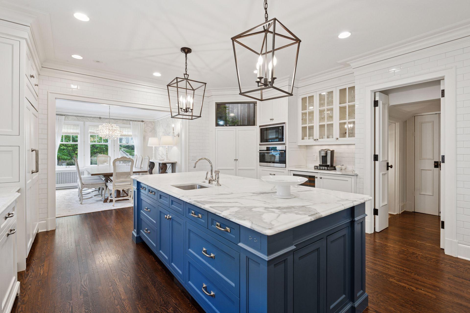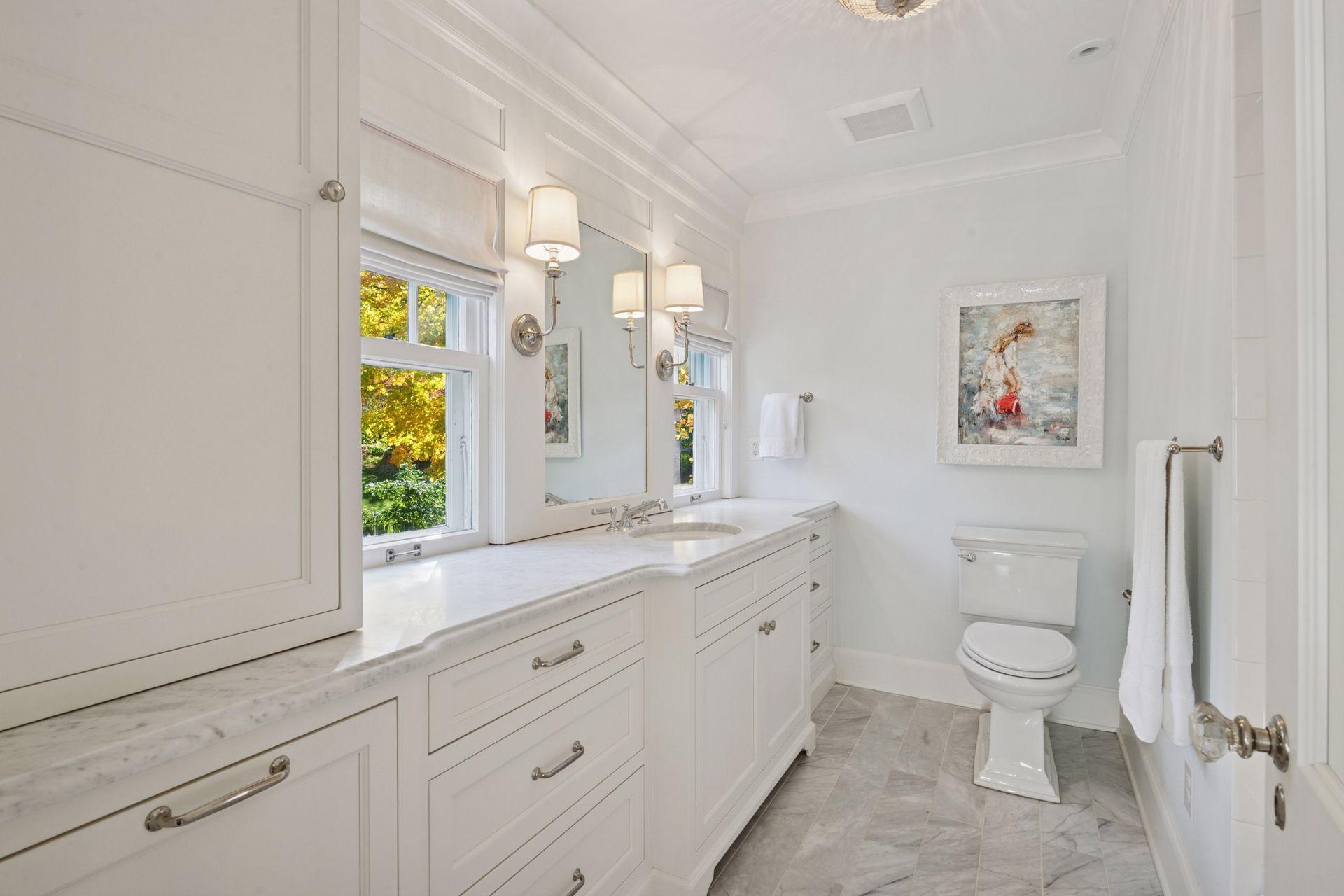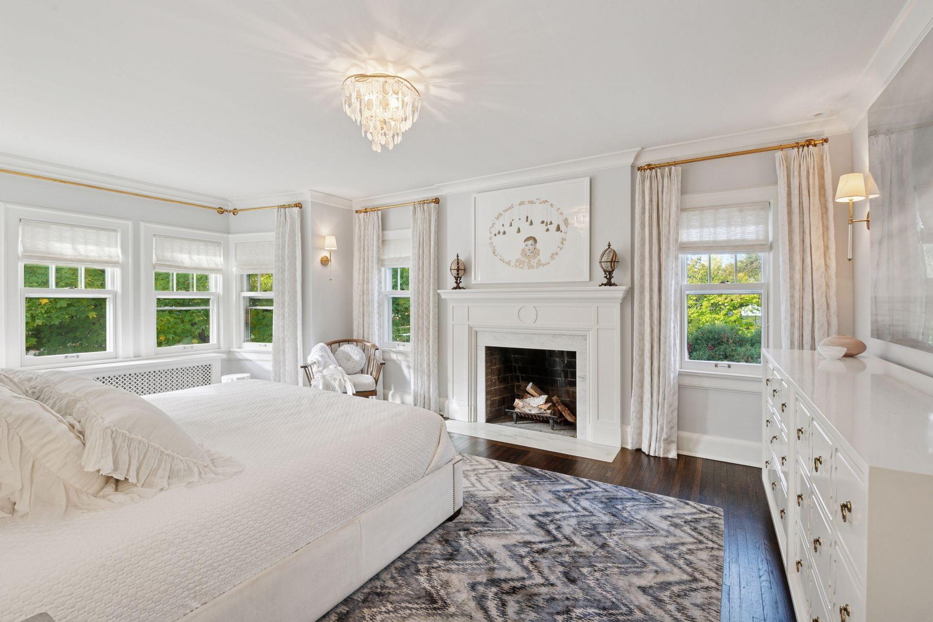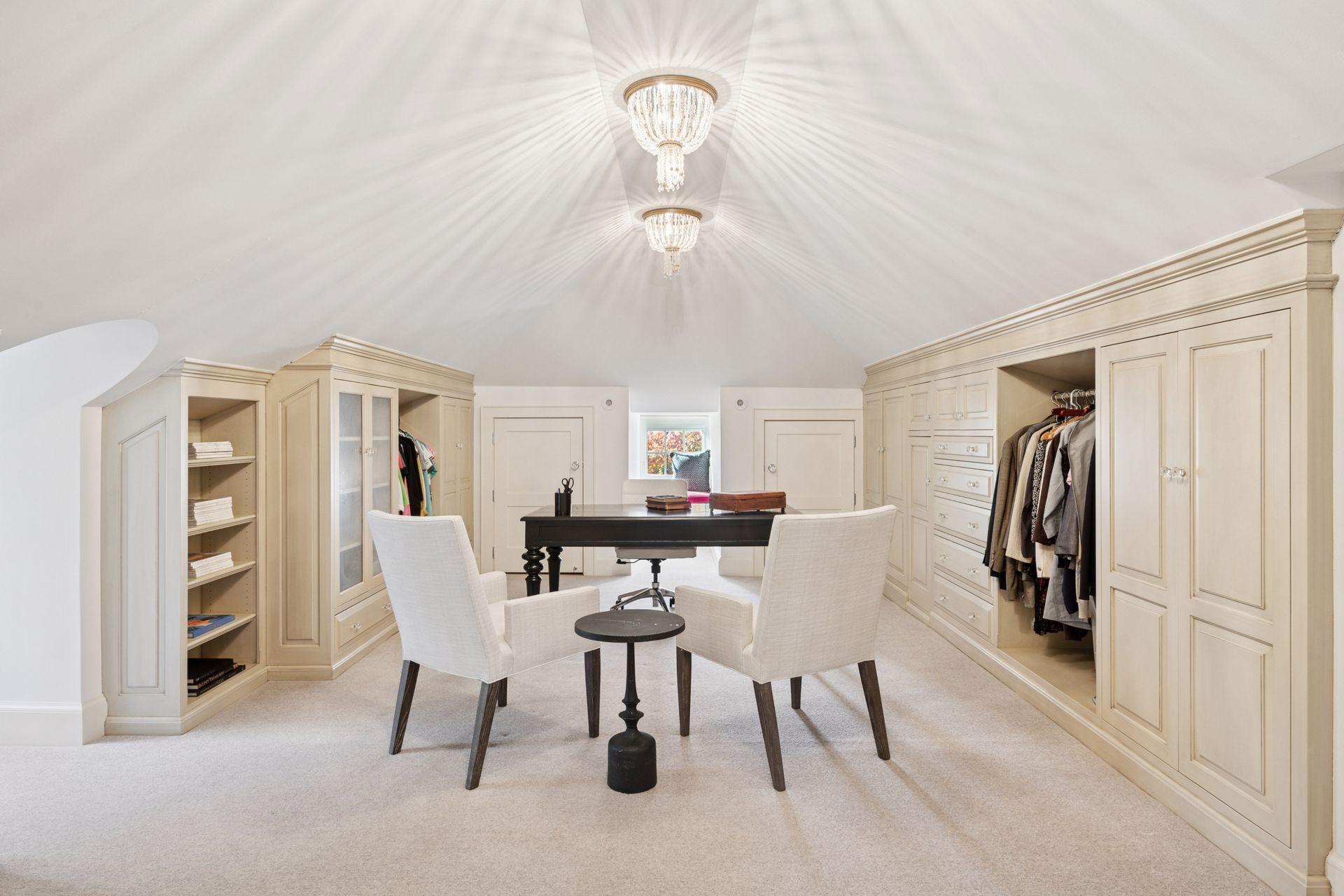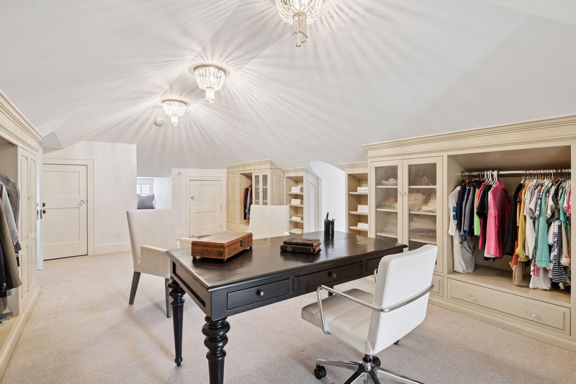 Upstairs, the primary suite includes a wood-burning fireplace, walk-in closet, and renovated bath with heated floors, a soaker tub, and walk-in shower. Two additional bedroom suites each feature walk-in closets and full bathrooms with marble finishes, built-ins, and designer lighting. The convenience of an upper-level laundry and the quiet retreat of a third-floor office with an unusual amount of built-in storage complete the home’s private spaces.