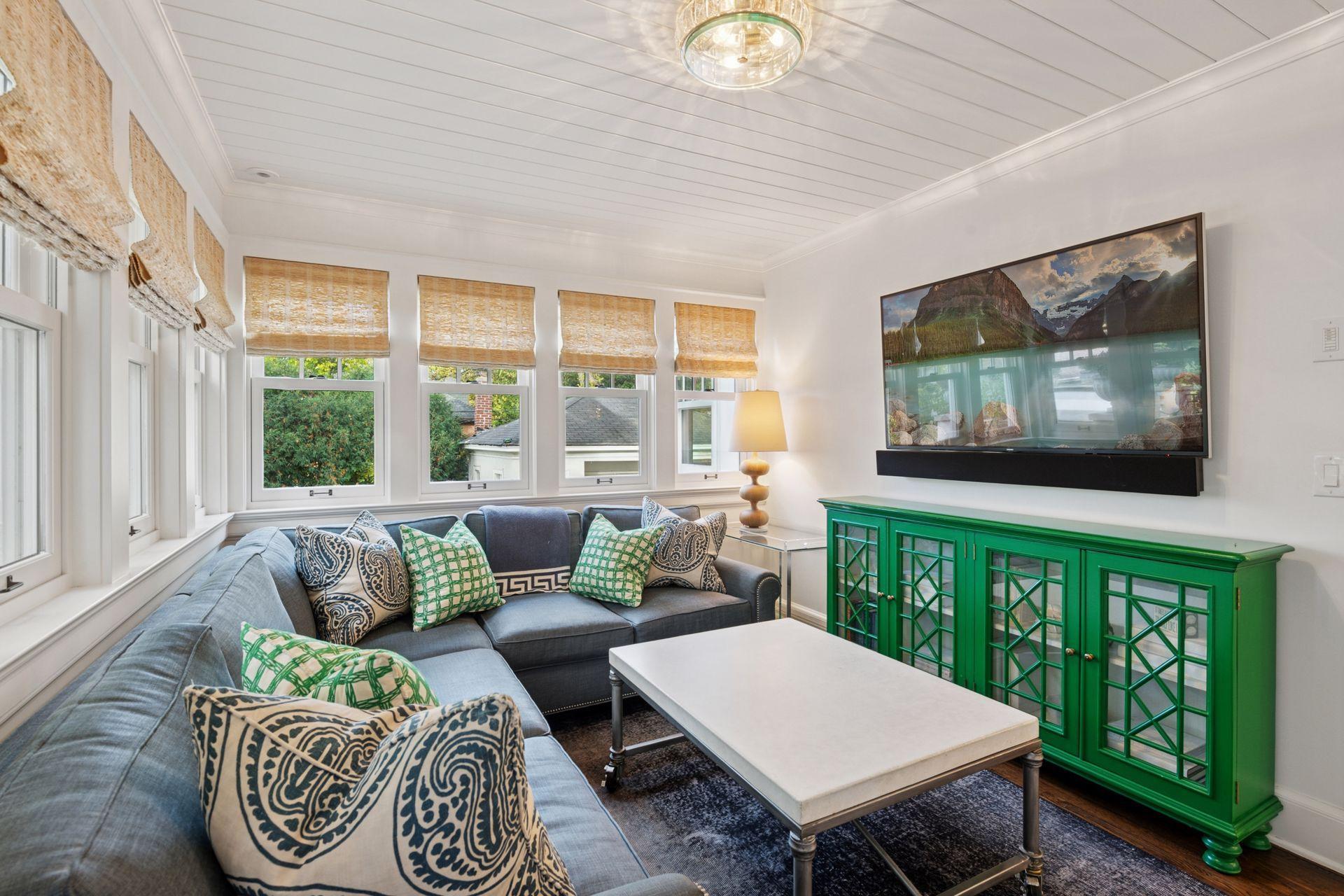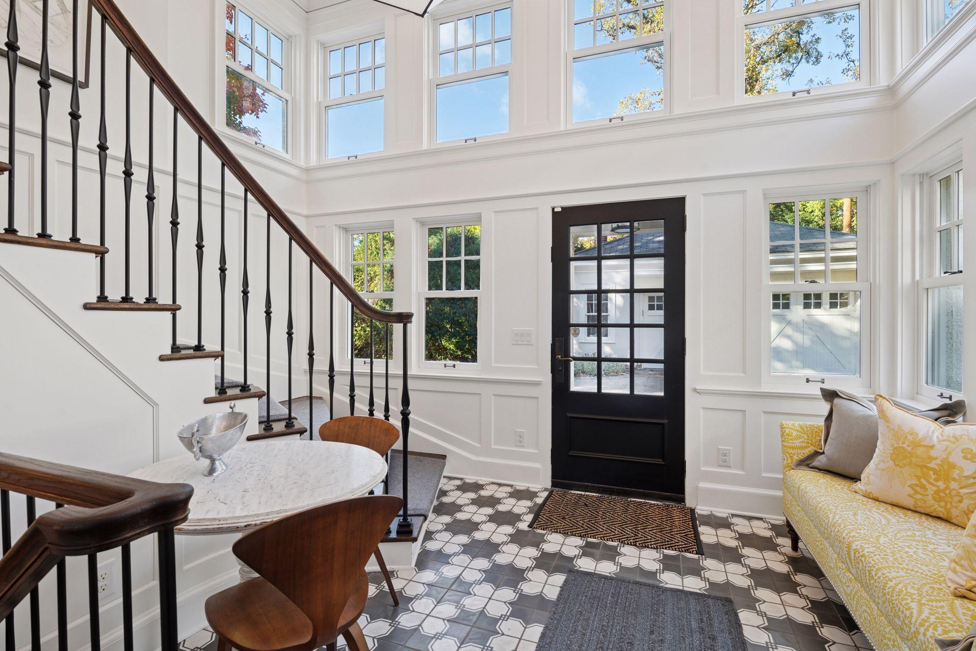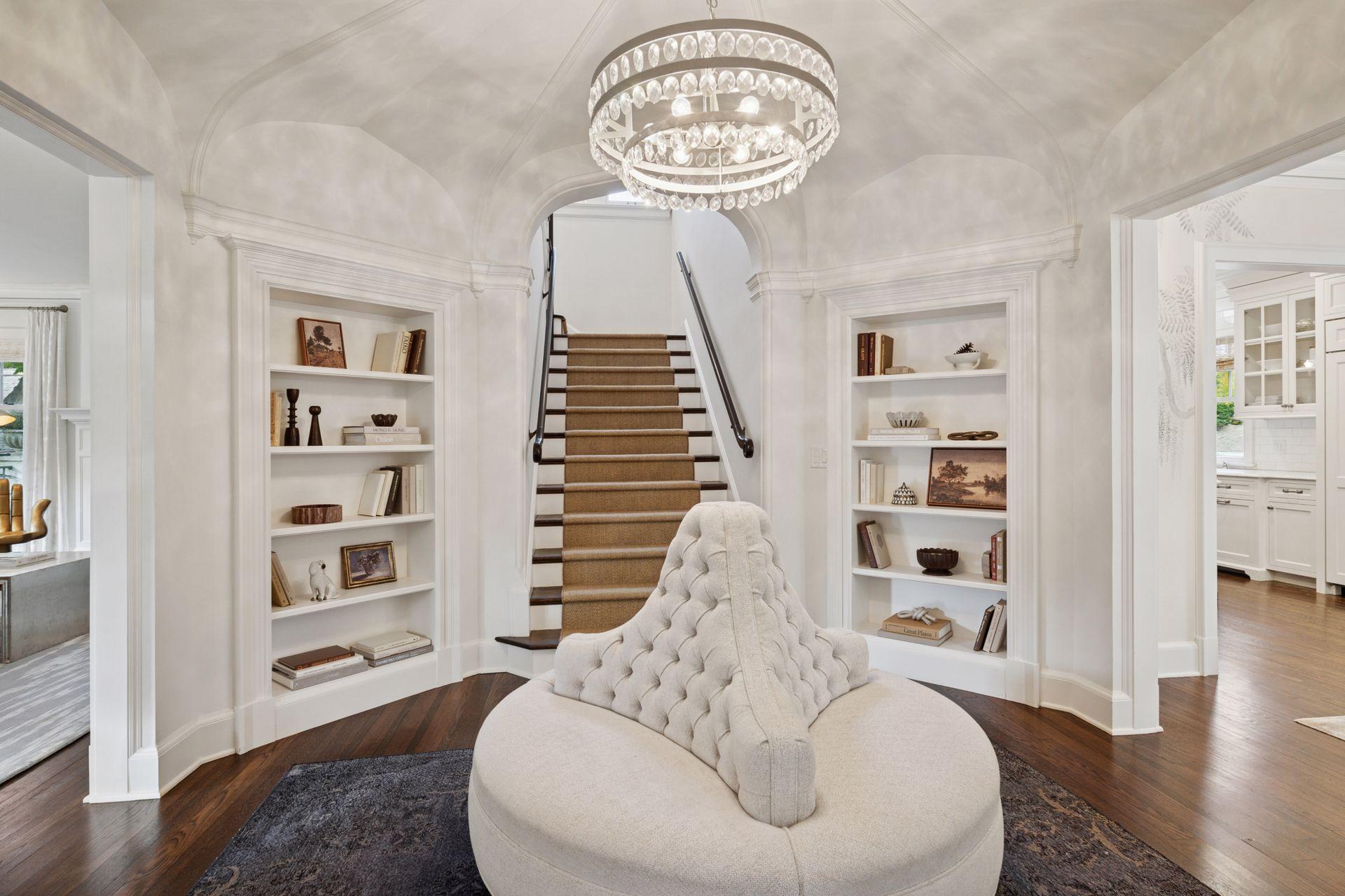 A gracious octagonal foyer welcomes you into a living room wrapped in windows and anchored by a wood-burning fireplace. A custom rotating bookcase conceals the television, a signature detail that underscores the level of intention found throughout the home. The dining room, fitted with a wall of built-ins, leads to a generous kitchen designed for serious cooking and easy gatherings. Wolf and Sub-Zero appliances, a steam oven, abundant storage, and a large island with heated marble make the space as comfortable as it is beautiful. A sunroom extends the main level out toward a canopy of mature trees, while the breezeway addition introduces a curved staircase and striking wall of windows.
