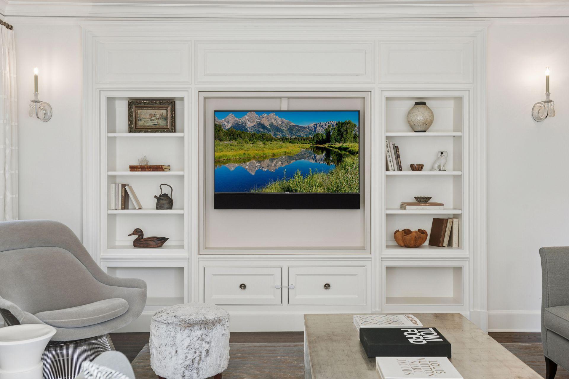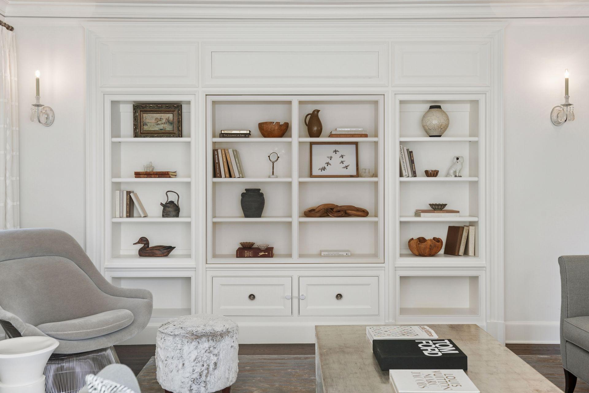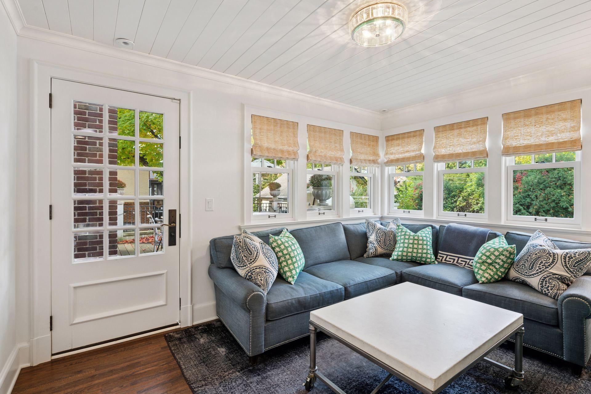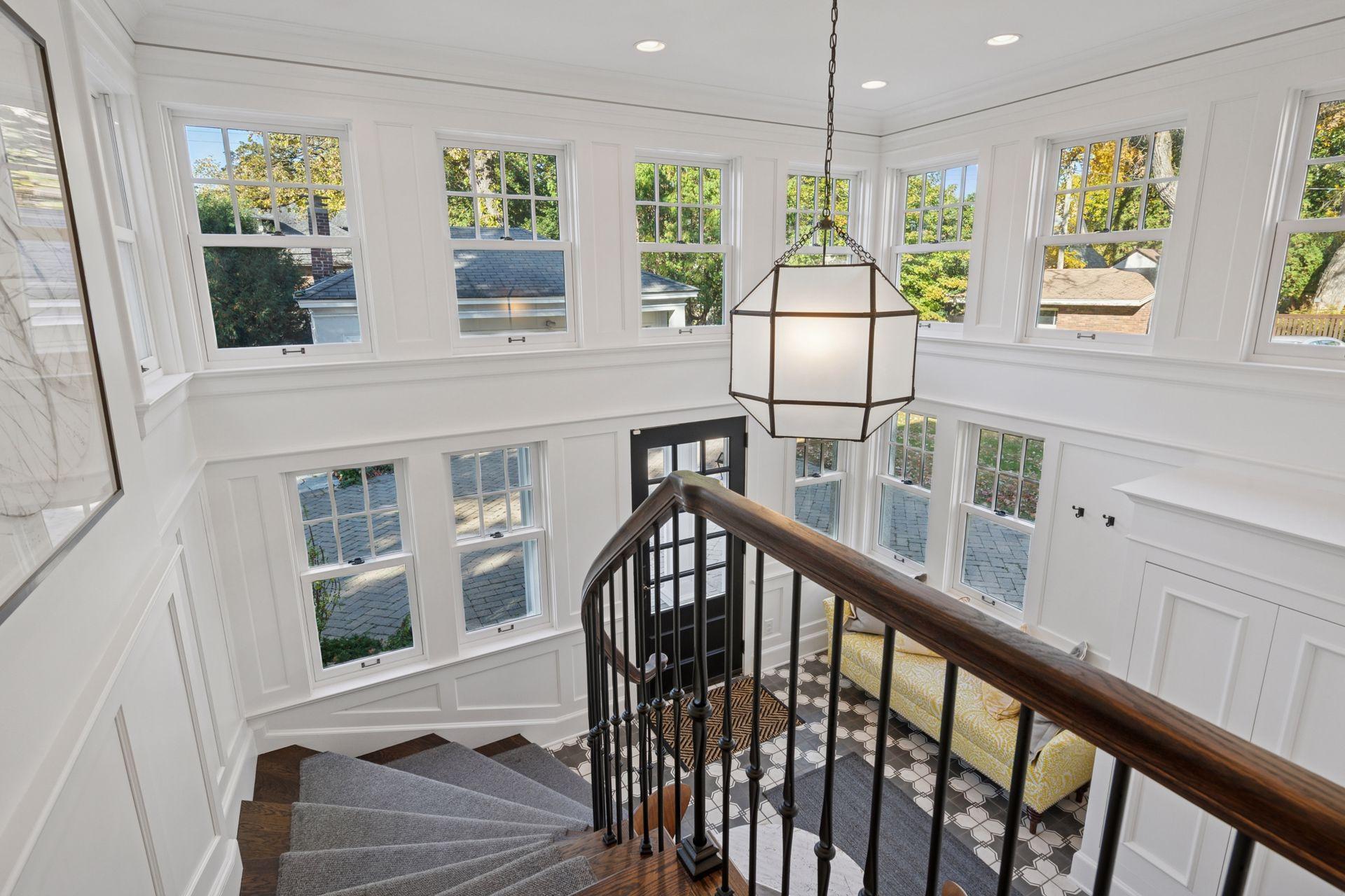 A gracious octagonal foyer welcomes you into a living room wrapped in windows and anchored by a wood-burning fireplace. A custom rotating bookcase conceals the television, a signature detail that underscores the level of intention found throughout the home. The dining room, fitted with a wall of built-ins, leads to a generous kitchen designed for serious cooking and easy gatherings. Wolf and Sub-Zero appliances, a steam oven, abundant storage, and a large island with heated marble make the space as comfortable as it is beautiful. A sunroom extends the main level out toward a canopy of mature trees, while the breezeway addition introduces a curved staircase and striking wall of windows.