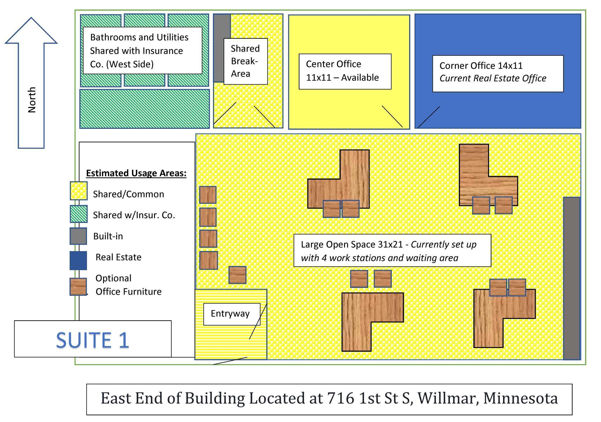 Prime First Street Location directly across from McDonalds. Building is split with Insurance on west end. East end is partially occupied and only using a small portion of the space. There is extra work space to share, or can negotiate the whole side if desired. Businesses are NOT CLOSING, but willing to relocate or operate off-site if new tenant requires entire space. Most recent building improvements have been roof, siding, windows, concrete sidewalk with two wheelchair ramps, and resurfacing the parking lot. Suite 1 Details: East Side of building with up to 1000 square feet OR 650 square feet when sharing space with real estate and travel businesses, or to occupy solo. Large windows with shades included. Built-in cabinets on east end of largest room which is approximately 650 square feet and has 4 work stations along with chairs in a waiting area. The corner office is 154 square feet (14x11). Center office is approximately 121 square feet (11x11). Shared Breakroom is approximately 85 square feet with counter and small sink. Two Bathrooms in hallway are available to share with the Insurance side. Note: Furniture is available for tenants to use if desired.