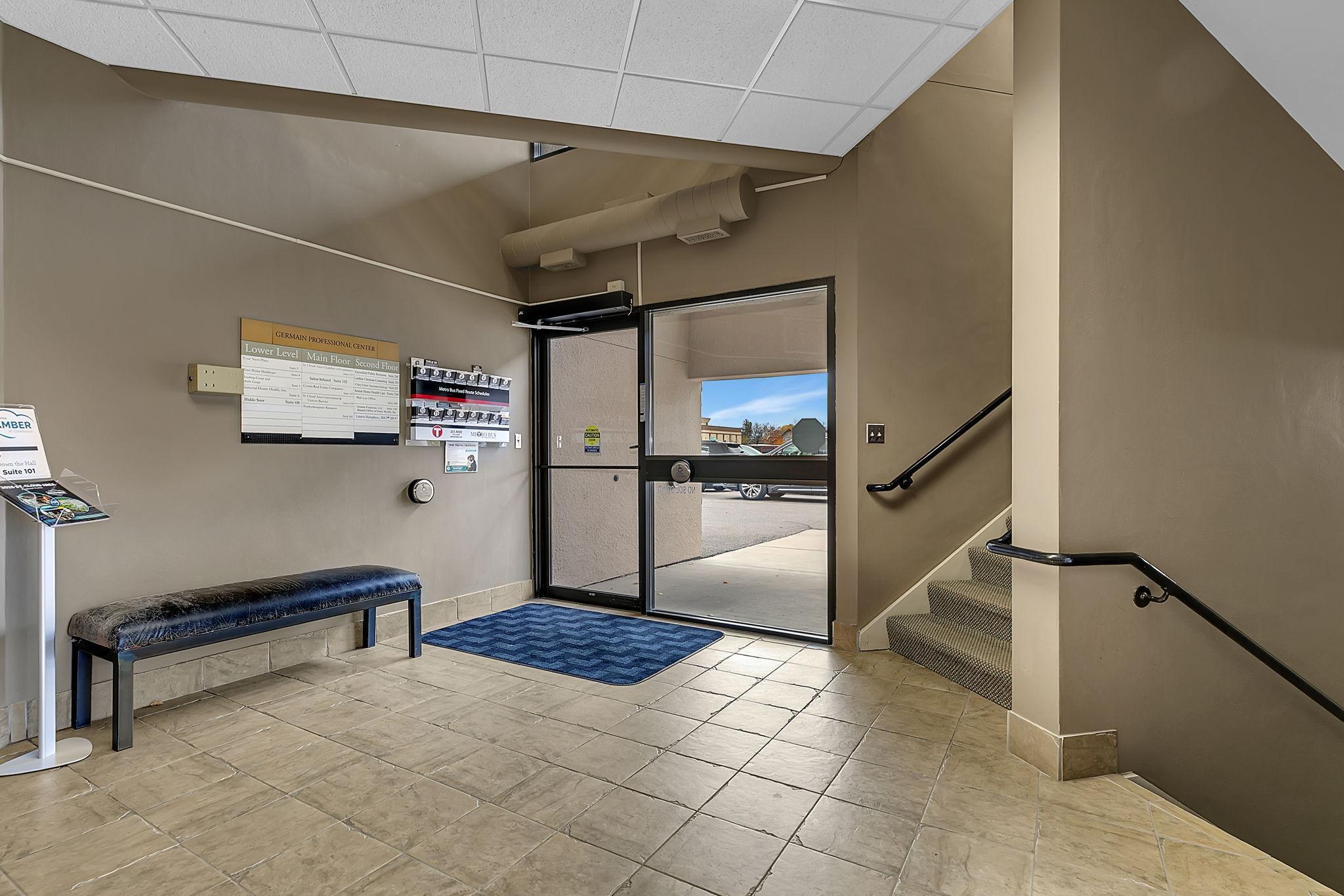 Professional office space available for lease located Downtown St. Cloud on W St Germain St. 4 suites available for lease. 1988 SF on main level facing W St Germain St (Suite 103 - $14.00/SF, $8.31/SF CAM), 660 SF on 2nd level (Suite 201 - $9.75/SF, $8.31/SF CAM), 1518 SF on 2nd floor ($9.75/SF, $8.31/SF CAM), & 2378 SF on lower level (Suite 5 - $7.00/SF, $8.31/SF CAM). Professional and well maintained building. Tenants include St Cloud Area Chamber of Commerce & St Cloud Area Convention & Visitors Bureau, Crown Properties, Granite Financial. Private parking lot provides plenty of free parking. Windows throughout the building and suites provide natural light.