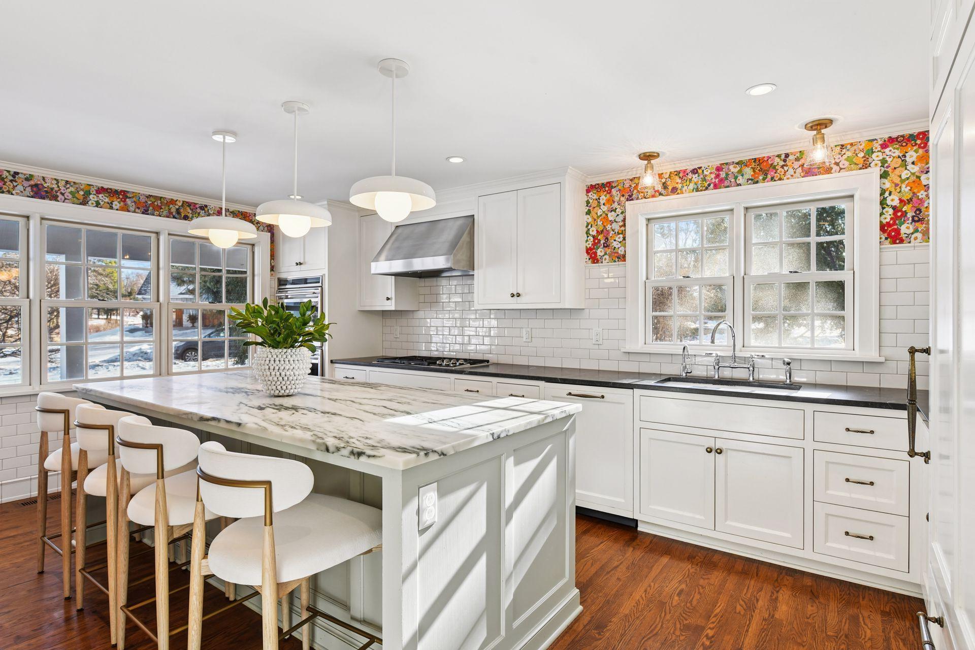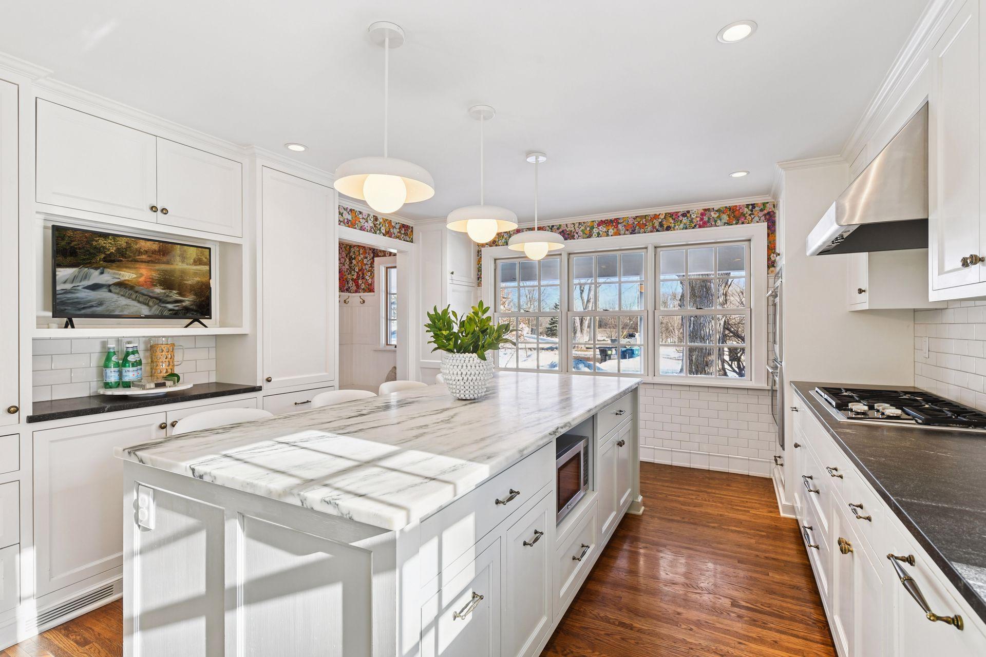 Charming, updated home in Hilldale on a large nearly 0.6-acre lot. The sun-drenched main level includes a newer center-island kitchen with high end appliances, formal living and dining rooms in an open plan, a grand office and a four-season porch. Impeccably decorated with stunning wall coverings, the home is in terrific condition. The upper level includes a primary suite with a five-fixture bath, a massive walk-in closet, three additional bedrooms and laundry. The second bedroom is the original primary suite. Nice lower level with a family room, 3/4 bath, and great storage. The three-car garage is heated. This home is ideally situated on a private & spacious half acre lot just minutes from Interlachen Country Club.