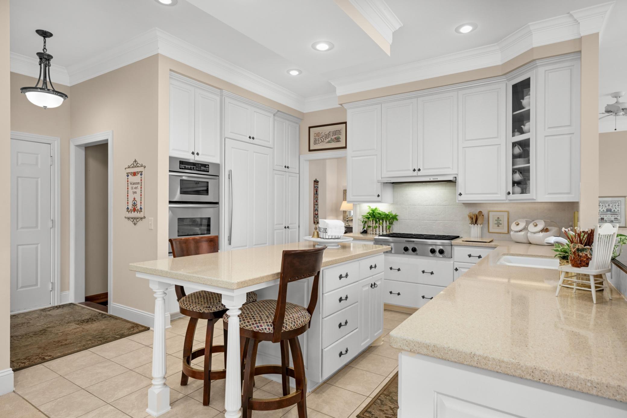 Enjoy premier lakeside living on one of Spring Lake’s best south-facing lots, offering 90 feet of flat, beautifully maintained shoreline. This well-constructed 4-bed, 4-bath home features a main-floor primary suite and a Jr. suite, expansive lakeside windows on both levels, creating bright, elegant spaces throughout. Designed for entertaining, it offers two gas fireplaces, multiple gathering areas, and a walkout lower level with a wet bar and easy access to the yard and shoreline. The chef’s kitchen includes custom cabinetry, a center island, double ovens, a gas cooktop with hood, and recently updated panel-front appliances.