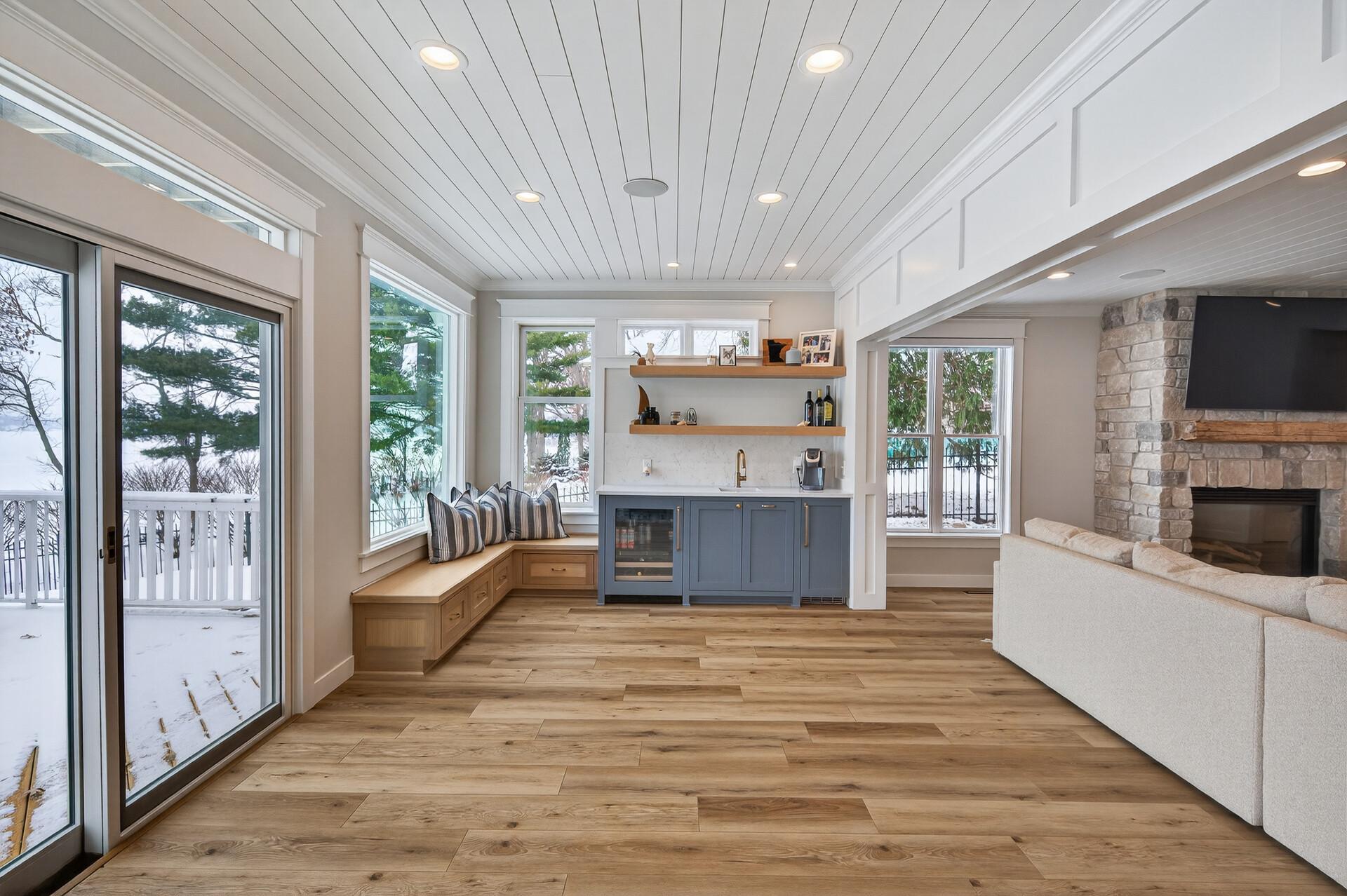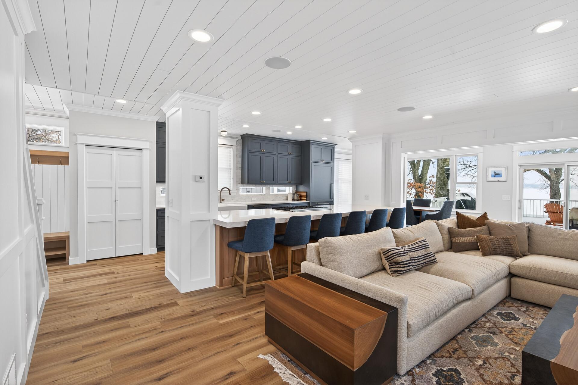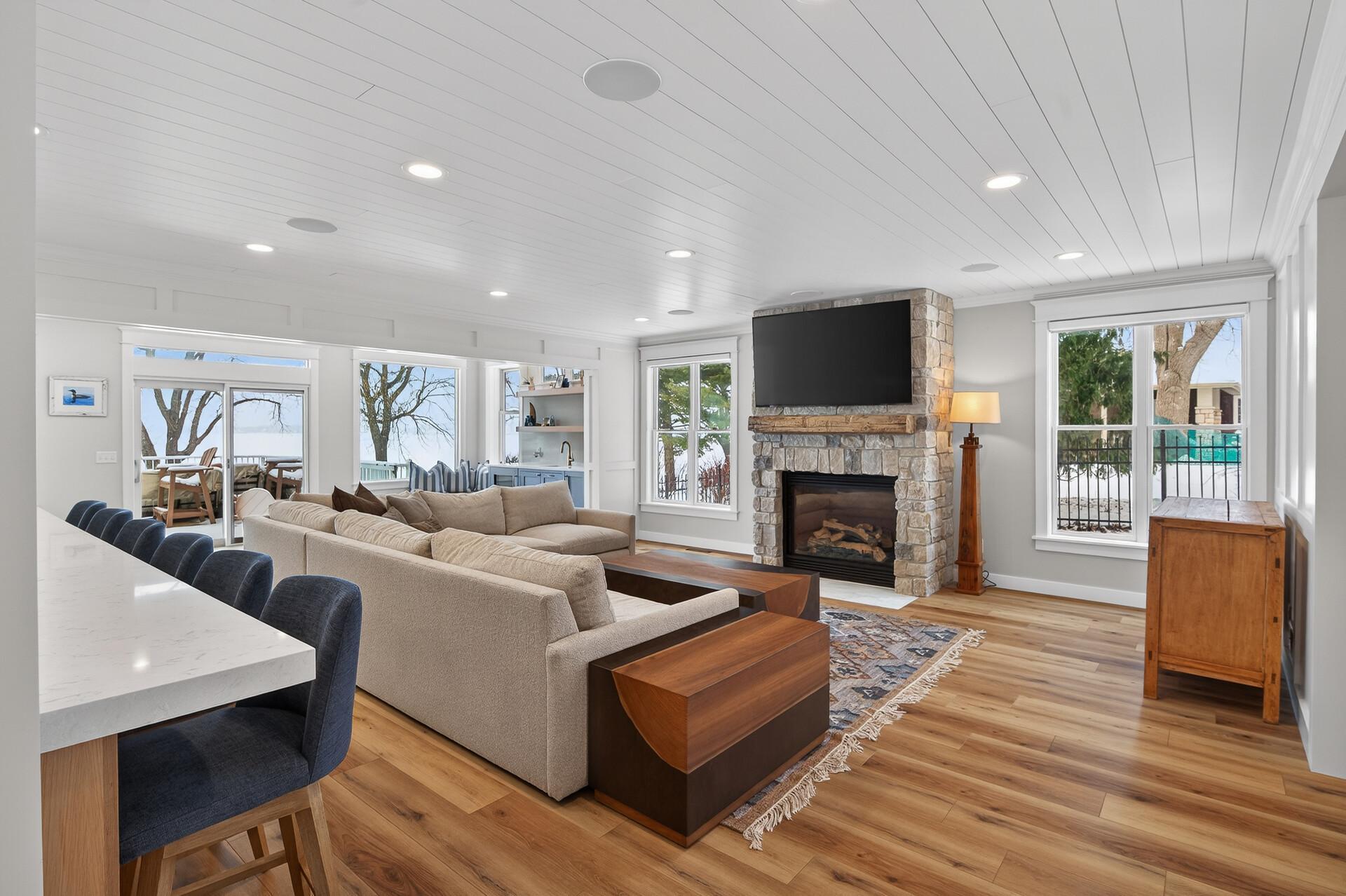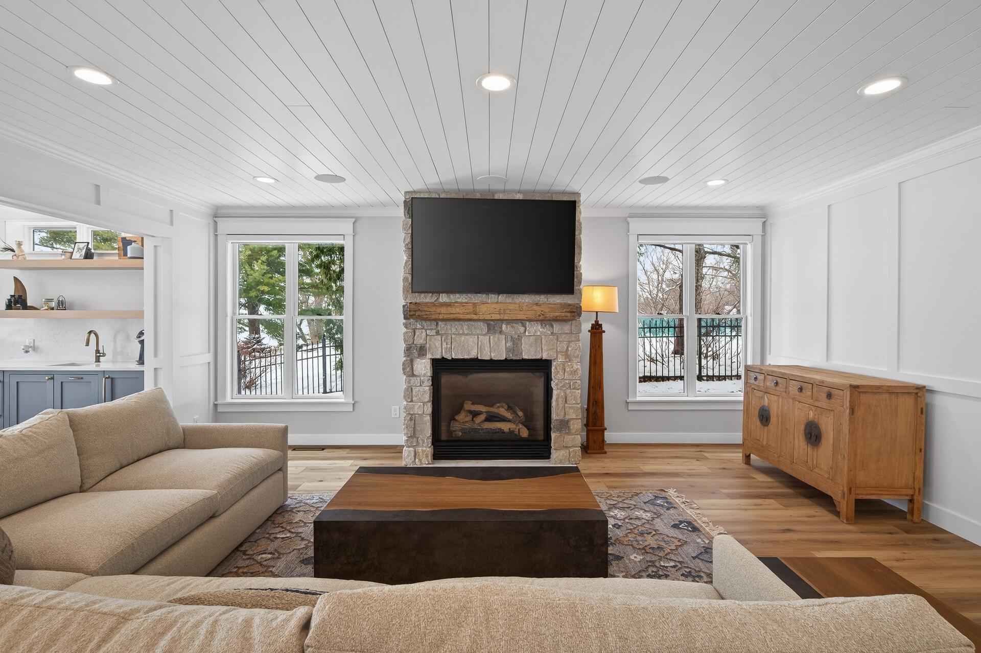 Experience lakeshore living on Park Avenue – one of the most desirable stretches of shoreline on White Bear Lake, featuring ideal water depth and a sandy shoreline for swimming and lake fun. Enjoy the west-facing exposure with stunning sunsets year-round. This fully remodeled home blends modern design with effortless lake living. The main level offers a bright, open-concept layout anchored by a large center island, flowing into a family room with gas fireplace, dining area, and stylish wet bar – perfect for entertaining. A main-floor bedroom and bath, convenient laundry, and a spacious entryway with a built-in bench and hooks for everyday living. Step outside to an expansive composite deck and an additional screen-in lakeside porch, creating the perfect spot to relax. Below the porch, a boathouse provides storage for all your lake toys, making it easy to enjoy the lake lifestyle. The updates continue in the upper level and feature three bedrooms, including a private owner’s suite with a custom walk-in closet, and direct deck access overlooking the backyard and lake. A heated and air-conditioned three-car garage completes the property, offering ample space for vehicles and gear. Every detail of this home has been thoughtfully updated, offering a true turnkey lakeshore experience.