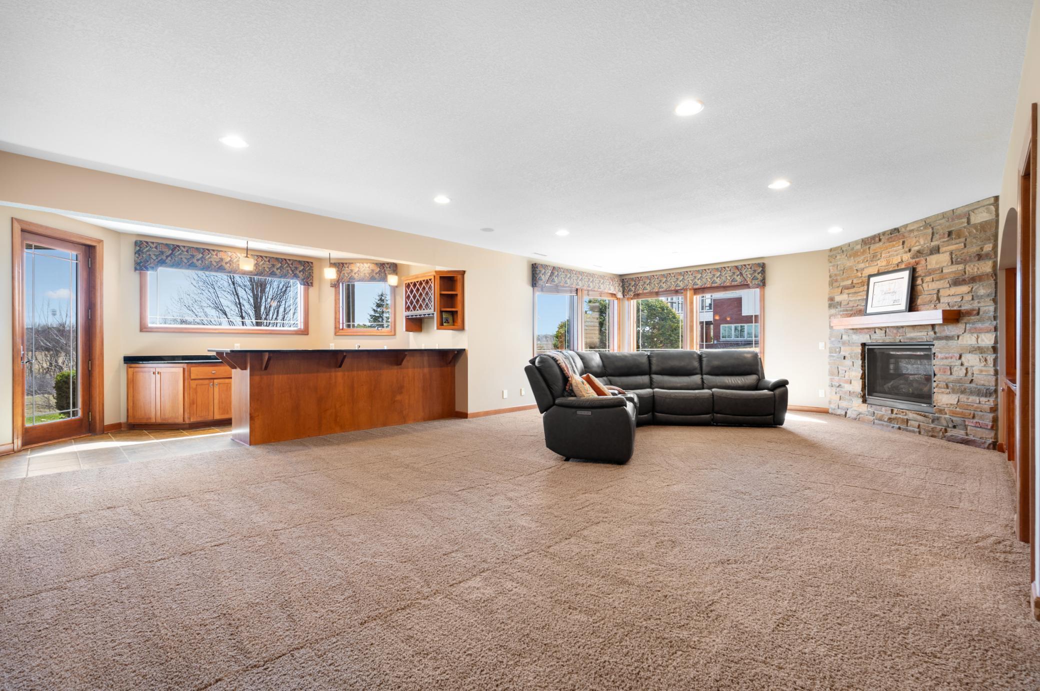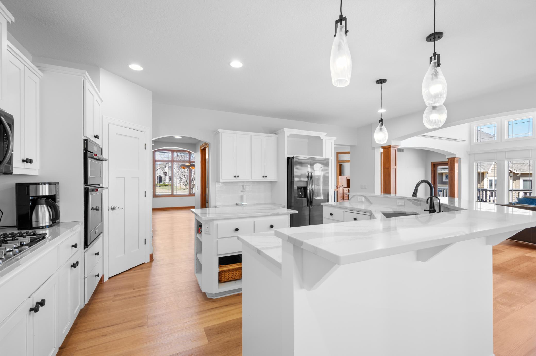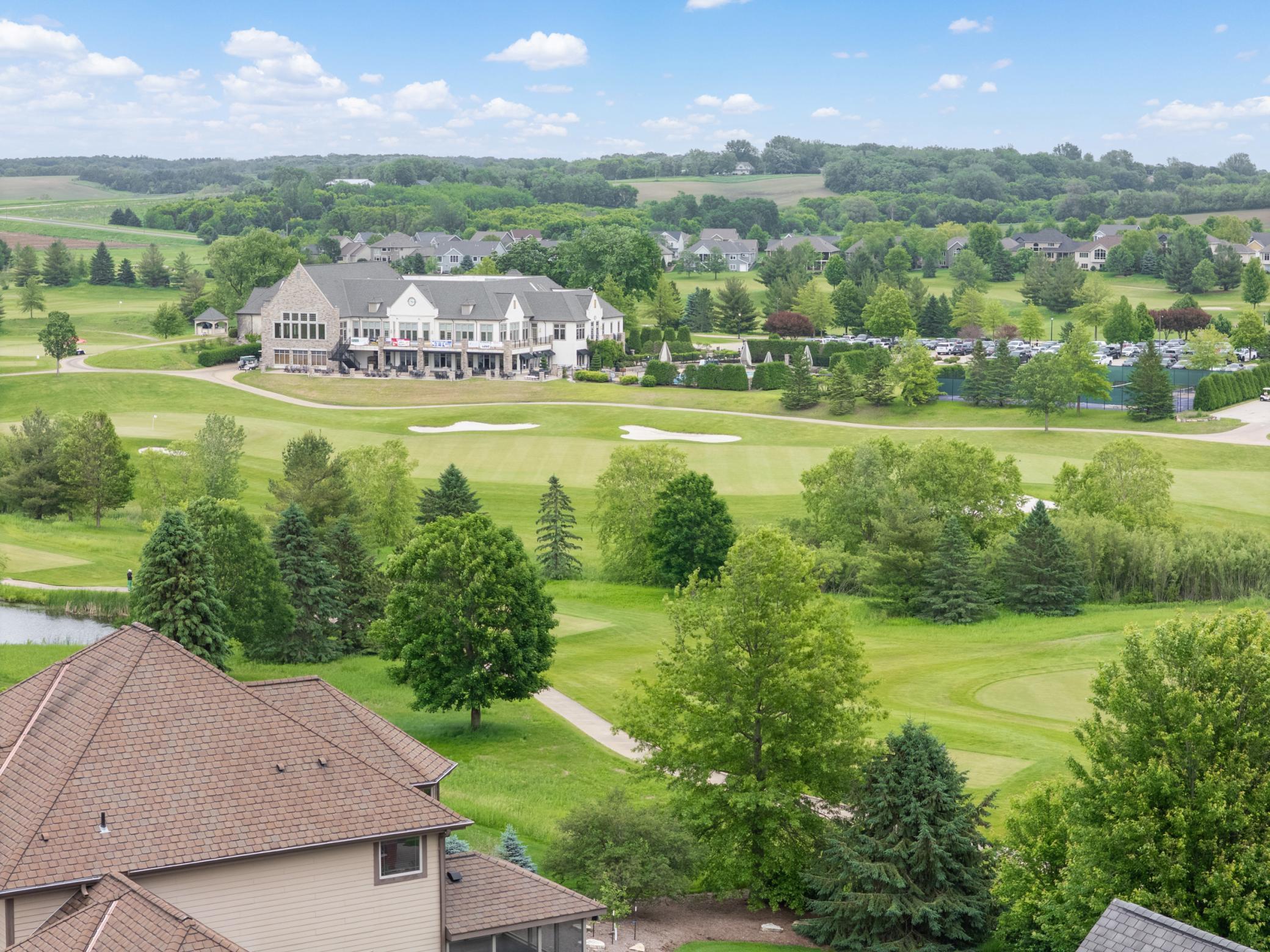 This exquisite 2-story walkout home sits on a large lot in the highly coveted Somerby Golf Community and the Epperstone Enclave cul-de-sac, directly on Hole 16 Fairway, offering breathtaking panoramic views of the golf course, clubhouse, ponds, and nature Audubon. With over 5500 Sq Ft of finished living space, this home features 4 bedrooms (with a 5th possible), 4 bathrooms, a 3-car garage with an EV charger, and an additional 3-car pre-stressed space below, perfect for storage, golf cart, or a workshop. The home is designed to impress, with luxurious outdoor spaces including a large half-circle maintenance-free deck, a covered 3-season deck, and a spacious concrete patio that provide the perfect setting to enjoy the stunning views. As you enter, you'll be greeted by all new LVP flooring throughout the main level. The large entryway leads to an expansive great room with large windows that showcase the spectacular golf course views and natural light. The updated kitchen is a chef's dream with white painted cabinets, quartz (Cambria) countertops, and stainless steel appliances. The main floor also features a large office with two custom desks, both formal and informal dining areas, and a spacious laundry room conveniently located off the mudroom. The upper level is home to a luxurious 850 Sq Ft master bedroom retreat, complete with a large walk-in closet featuring custom shelving and a spa-like bathroom suite. The master bath offers dual vanities with new quartz countertops, a 2-person jetted tub, and a walk-in 50 Sq Ft steam shower with remote start. This level also includes a second bedroom with its own walk-in closet and private full bathroom. The lower level provides additional living space, with two more bedrooms, a 3/4 bathroom with tiled shower, and a large family room featuring a stone-surround gas fireplace and a wet bar. There's also a private wine room ideal for a small hangout space, and a temperature/humidity controlled wine room perfect for wine enthusiasts. Step outside onto your expansive patio to enjoy beautiful evenings overlooking the golf course including the vast landscaping complete with 2 apple trees. This home offers an incredible blend of luxury, space, and location. An absolute must see!