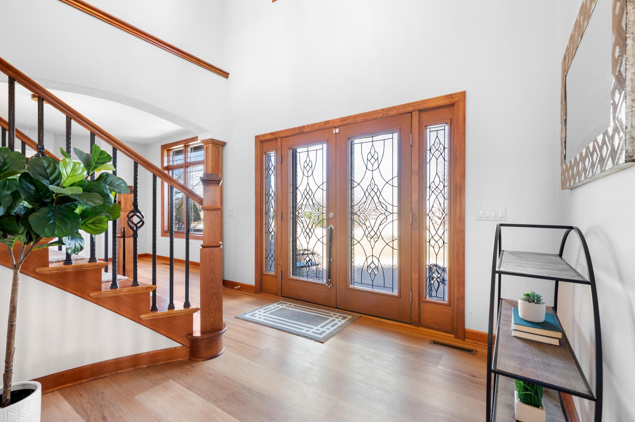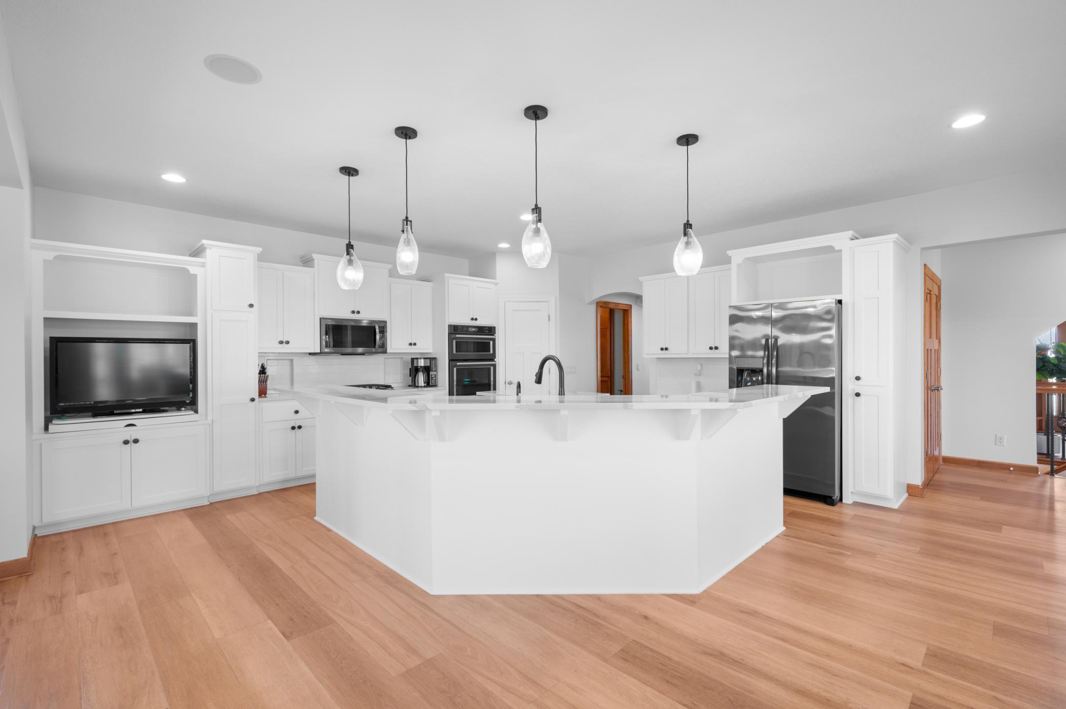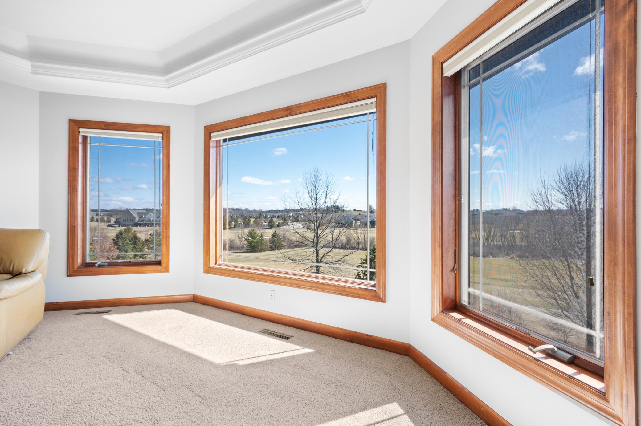This exquisite 2-story walkout home sits on a large lot in the highly coveted Somerby Golf Community and the Epperstone Enclave cul-de-sac, directly on Hole 16 Fairway, offering breathtaking panoramic views of the golf course, clubhouse, ponds, and nature Audubon. With over 5500 Sq Ft of finished living space, this home features 4 bedrooms (with a 5th possible), 4 bathrooms, a 3-car garage with an EV charger, and an additional 3-car pre-stressed space below, perfect for storage, golf cart, or a workshop. The home is designed to impress, with luxurious outdoor spaces including a large half-circle maintenance-free deck, a covered 3-season deck, and a spacious concrete patio that provide the perfect setting to enjoy the stunning views. As you enter, you'll be greeted by all new LVP flooring throughout the main level. The large entryway leads to an expansive great room with large windows that showcase the spectacular golf course views and natural light. The updated kitchen is a chef's dream with white painted cabinets, quartz (Cambria) countertops, and stainless steel appliances. The main floor also features a large office with two custom desks, both formal and informal dining areas, and a spacious laundry room conveniently located off the mudroom. The upper level is home to a luxurious 850 Sq Ft master bedroom retreat, complete with a large walk-in closet featuring custom shelving and a spa-like bathroom suite. The master bath offers dual vanities with new quartz countertops, a 2-person jetted tub, and a walk-in 50 Sq Ft steam shower with remote start. This level also includes a second bedroom with its own walk-in closet and private full bathroom. The lower level provides additional living space, with two more bedrooms, a 3/4 bathroom with tiled shower, and a large family room featuring a stone-surround gas fireplace and a wet bar. There's also a private wine room ideal for a small hangout space, and a temperature/humidity controlled wine room perfect for wine enthusiasts. Step outside onto your expansive patio to enjoy beautiful evenings overlooking the golf course including the vast landscaping complete with 2 apple trees. This home offers an incredible blend of luxury, space, and location. An absolute must see!