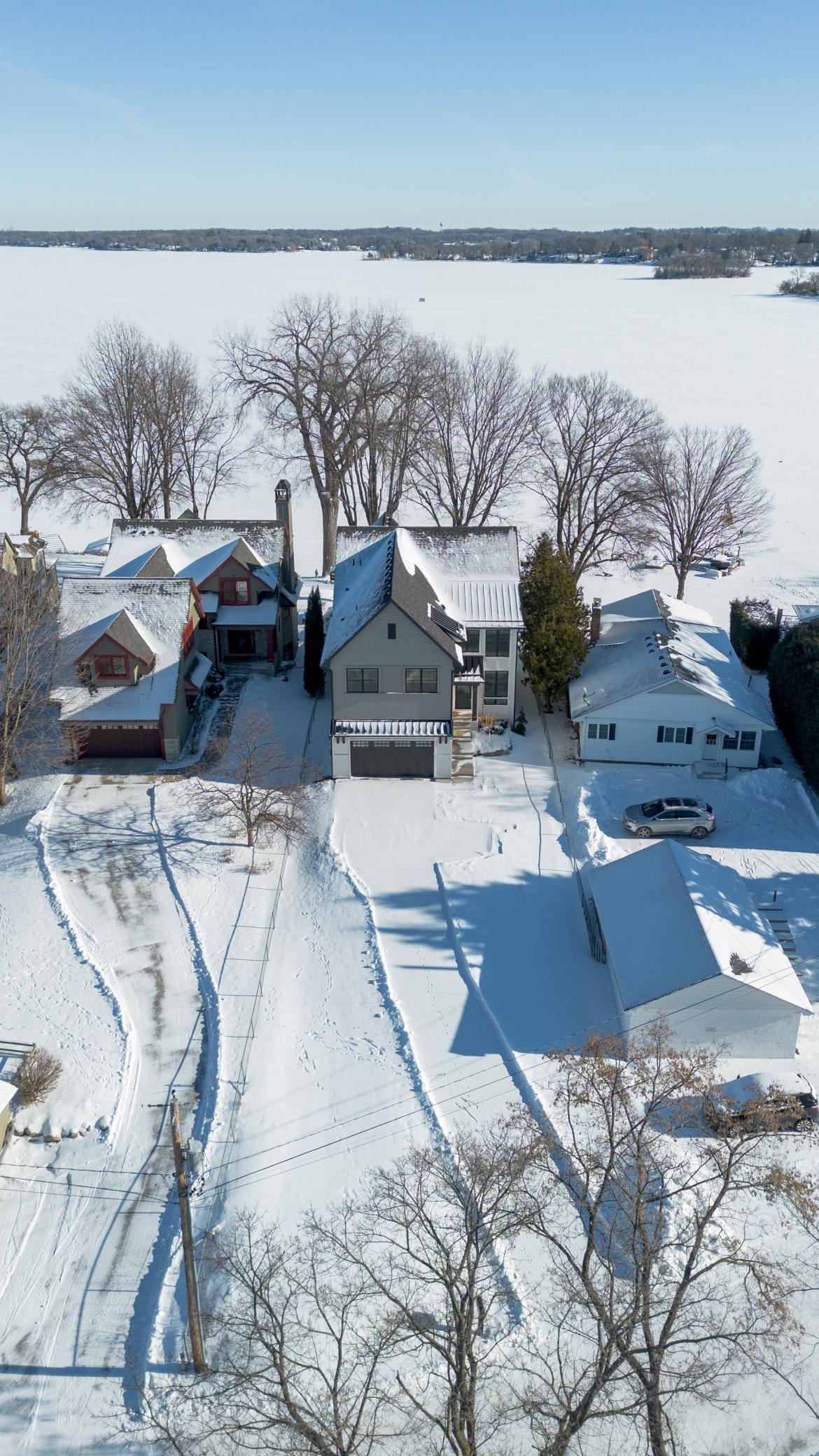 Like-new construction on Lake Minnetonka, only better! This exceptional 2021 custom-built luxury home is set on sought after Gideon Bay with 51 feet of sandy, level shoreline, a private beach, and panoramic lake views. Situated on an extra deep lot just minutes from downtown Excelsior, this property offers the rare combination of privacy, walkability, and premier lakeside living. Designated for both everyday living and entertaining, the home features a chef's kitchen with a 10-foot island, Thermador 8-burner gas/induction range, and a fully equipped back prep kitchen. The stunning primary suite captures sweeping lake views and includes a spa-like bath and oversized walk-in closet. Four bedrooms are located on the upper level, plus a private guest suite above the garage with its own entrance, kitchenette, and full bath, ideal for visitors, au pair, or multigenerational living. The walkout lower level is an entertainer's dream with a wine room, theater, exercise room, family room, guest bedroom, and a full bar with ice-maker and pass-through window to the patio bar, perfect for summer gatherings. The heated, lift-ready garage accommodates two vehicle lifts and is wired for supplemental heat. Enjoy front-row views of Excelsior's fireworks, quick access to Lake Minnetonka by boat, and proximity to restaurants, trails, and boutique shopping by land. This turn-key waterfront retreat is ideal for year-round living or as a premier summer lake home.
