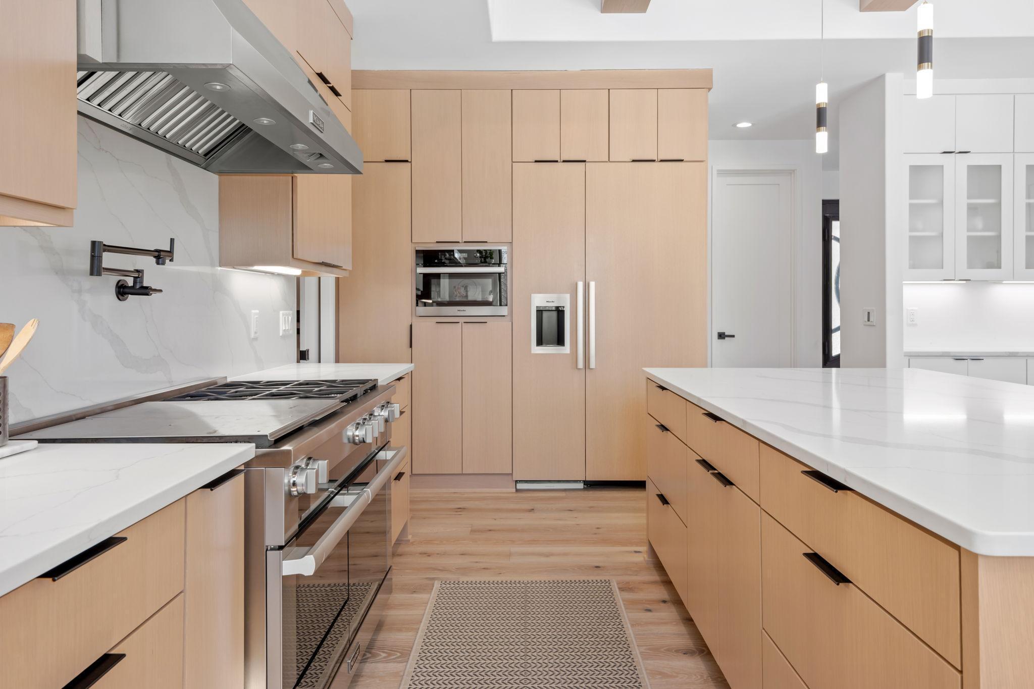 The gourmet kitchen is a chef’s dream with high-end stainless steel appliances, quartz countertops, a large center island, and a walk-in pantry.