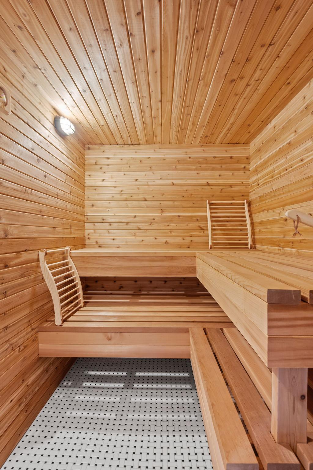 The finished basement includes a family/media room with a fireplace, exercise room, guest bedroom, wet bar, and sauna.
