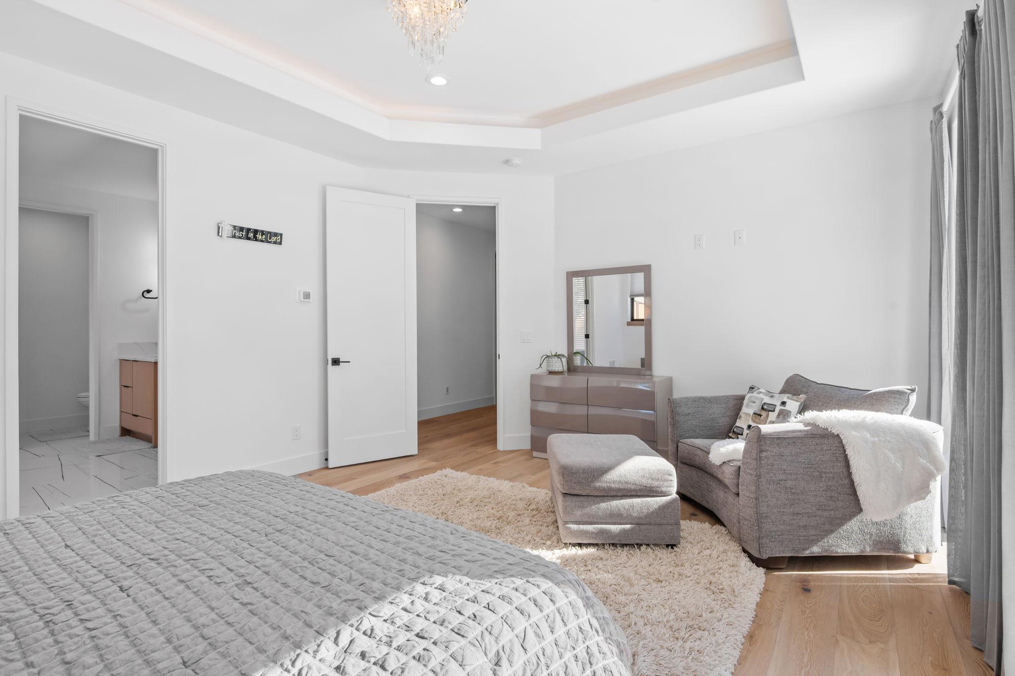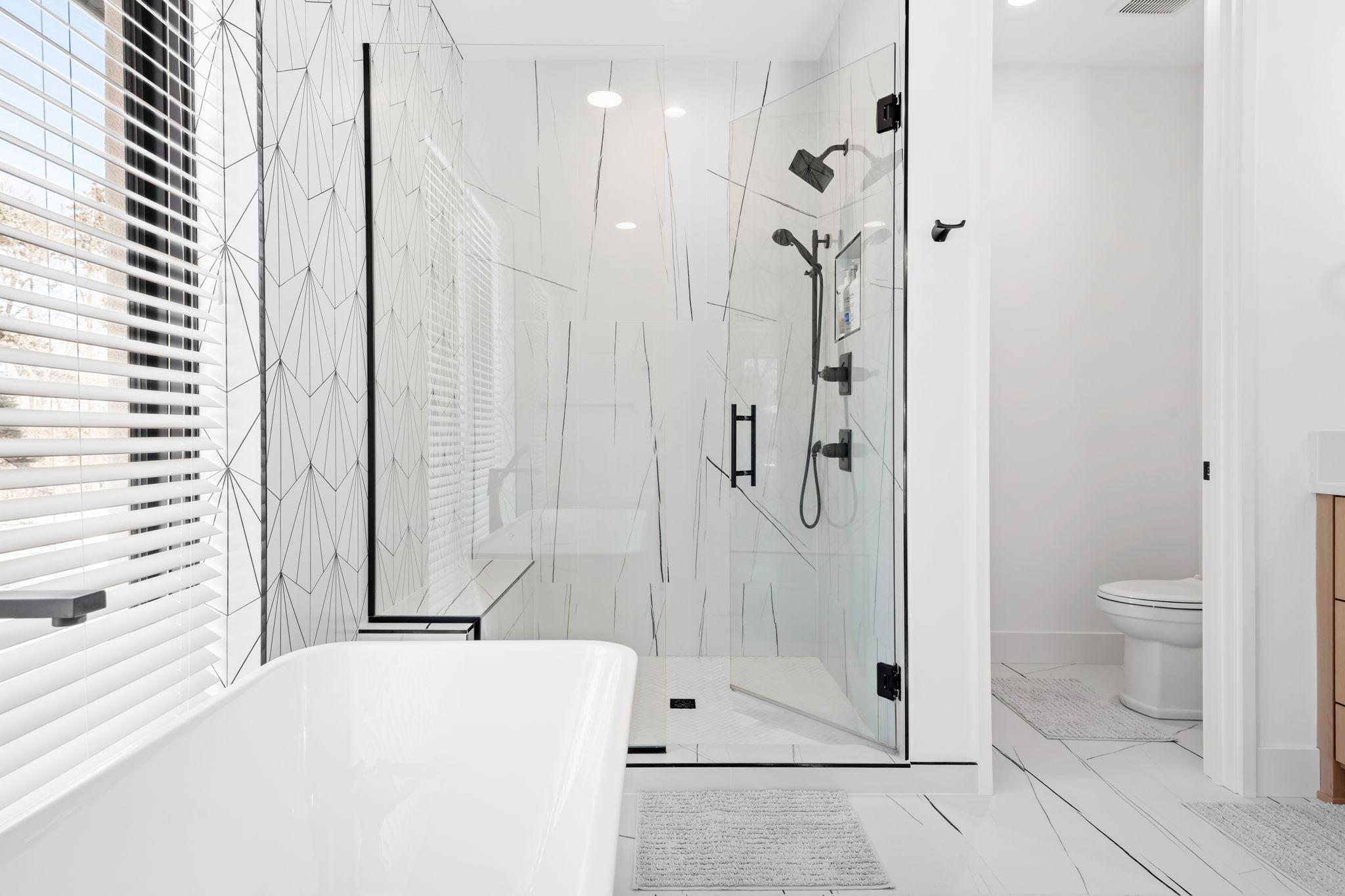 The primary suite offers a vaulted ceiling, walk-in closet, and a spa-like ensuite bath with a freestanding soaking tub, oversized walk-in shower, and double vanity.