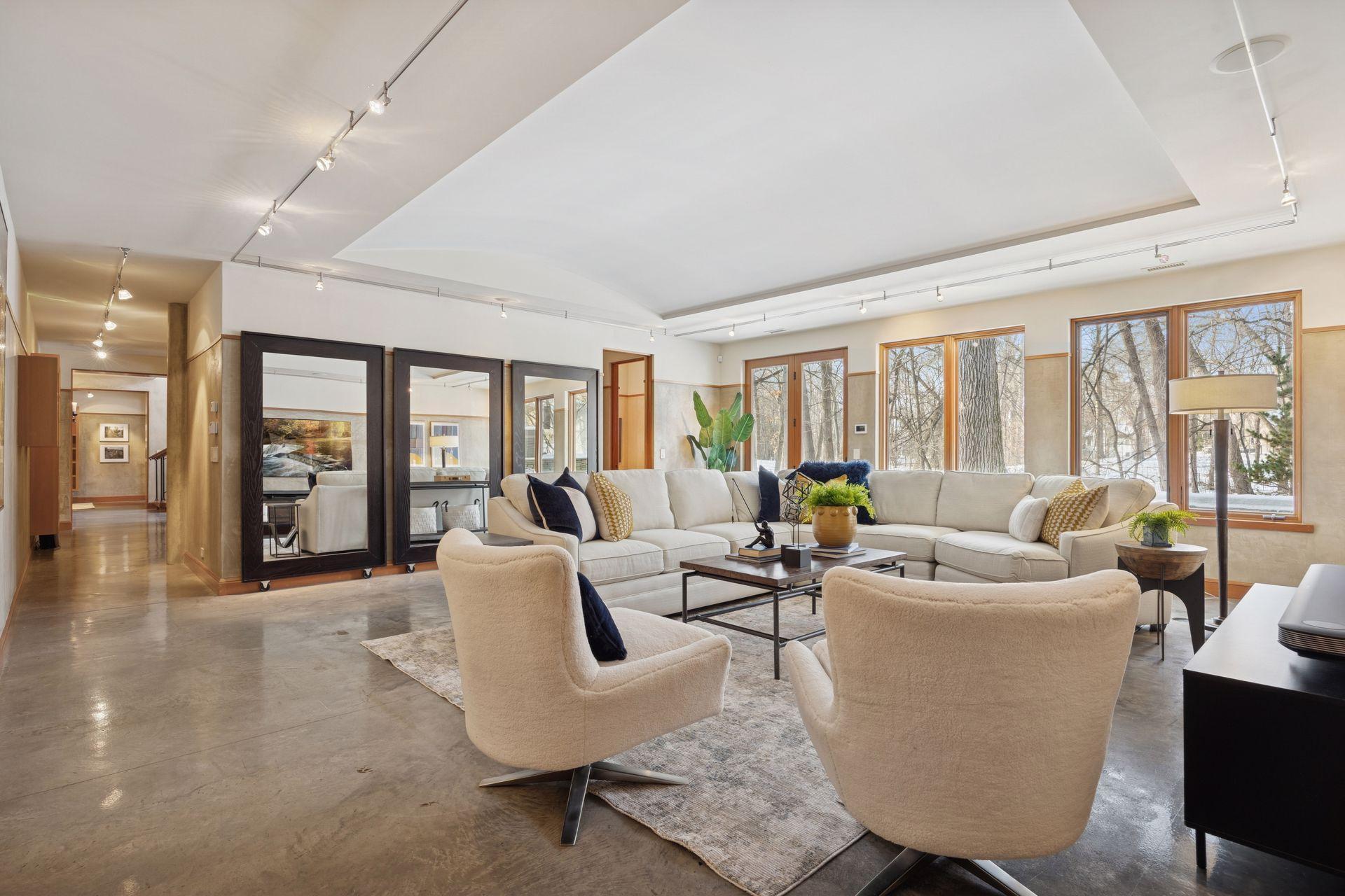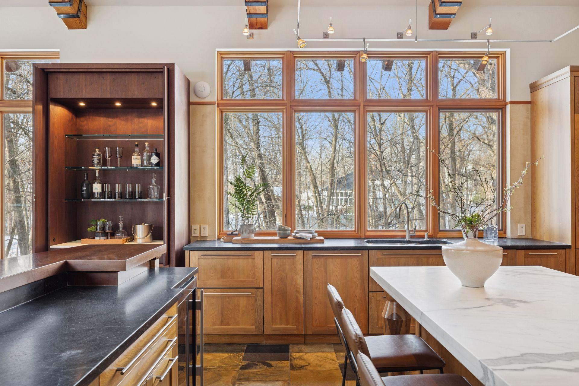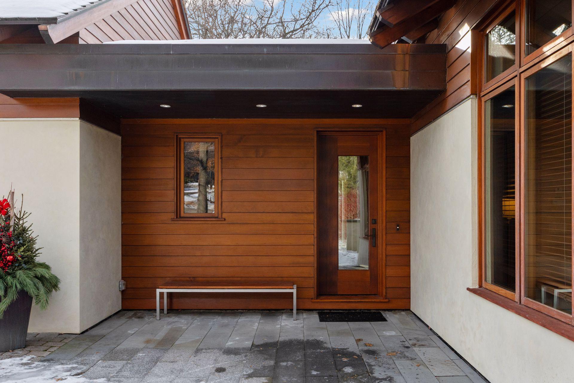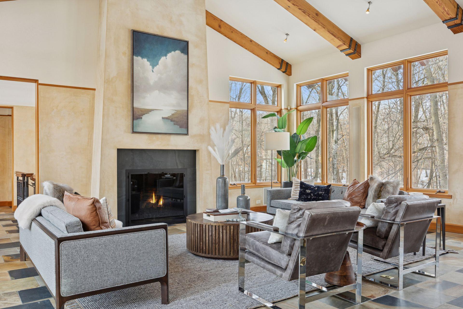 Custom Streeter Design/Build on a completely private 1.2 acre site of woods, manicured paths and courtyards in coveted Cottagewood. Where mountain resort meets sleek modern architecture, enjoy a masterful combination of elements; wood, stone, metals, warmth and natural light. A rare combination of grand yet intimate spaces for large and small gatherings boasts 15’ vaulted ceilings with beams reclaimed from a Northern Minnesota bridge. From the living and dining rooms, 30 feet of glass doors walk out to the bluestone courtyard with in-ground pool, bath, woodburning fireplace, and lounge. Just outside the courtyard, a screened gazebo for perfect for relaxing and nature views. A chef’s dream kitchen includes SubZero refrigerators and beverage drawers, 48” Wolf range and double wall ovens, Asko dishwashers, miles of soapstone, marbles, customized cabinetry, walk-in butler’s pantry, and dual islands. The sumptuous owner’s quarters overlooks acreage and a custom designed waterfall. Amenities include a fireplace, gorgeous private bath, and walk-in closet with wall of built-ins and laundry hookup. An executive office and handsome family room complete the main level. Three generously sized secondary bedrooms in the walkout level feature an ensuite with steam shower plus Jack and Jill bath, a study/hangout, recreation room, and wine cellar. Superb mechanicals include in-floor heat throughout; new cedar shake roof. The oversized, triple heated garage has two walls of storage closets, floor drains and a wash sink. Have it all in this unmatched location a short walk to the lake. Enjoy Minnetonka schools, downtown Excelsior shops and restaurants. One of a kind gem!