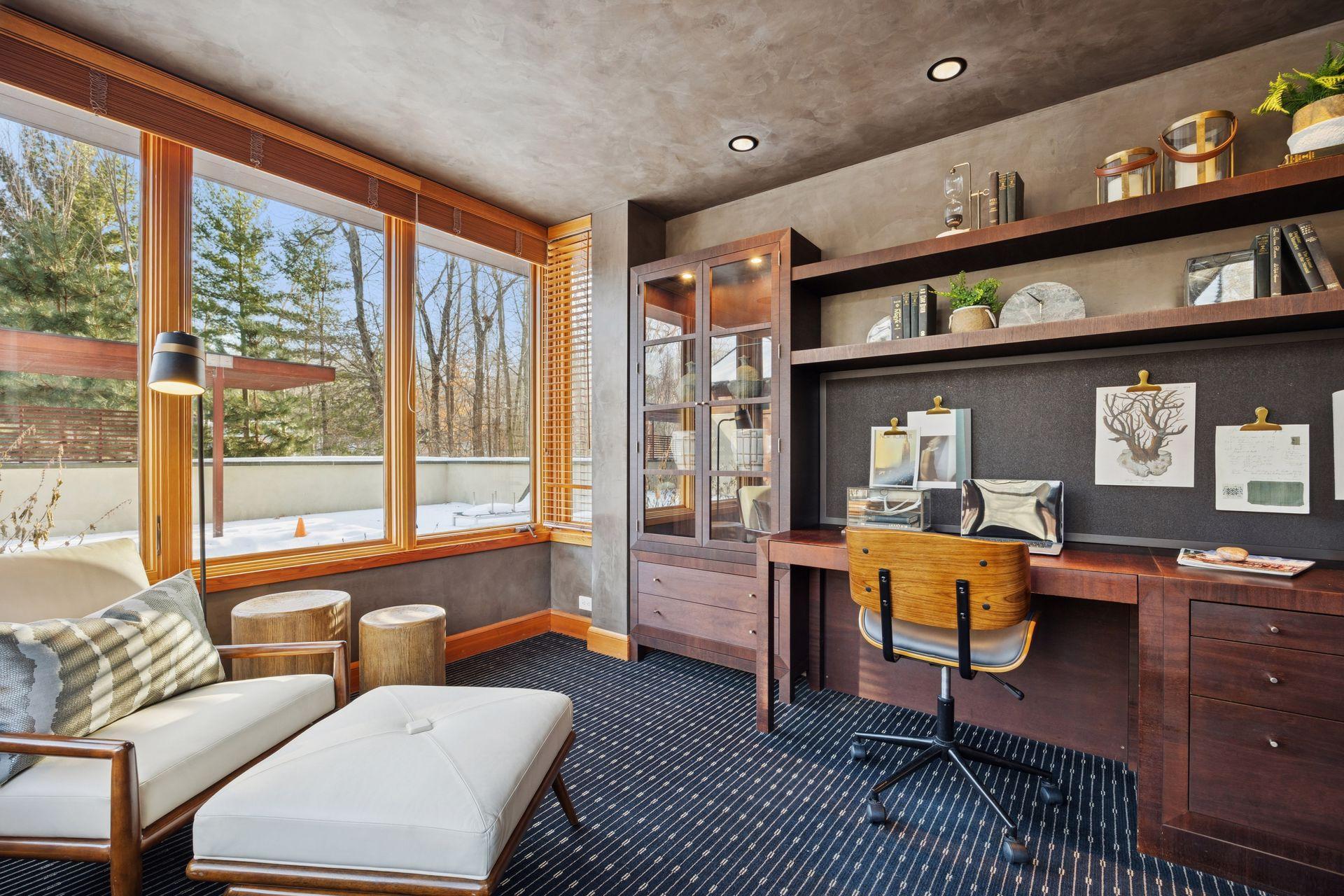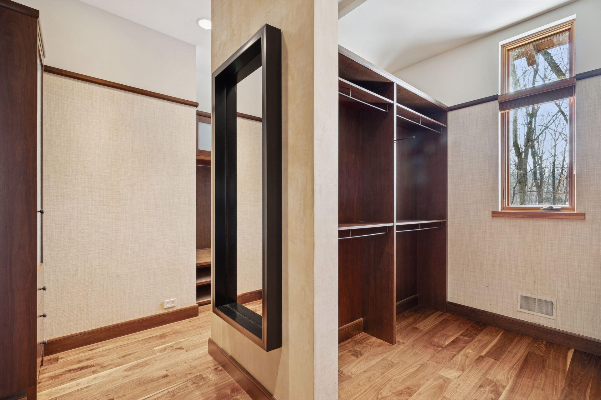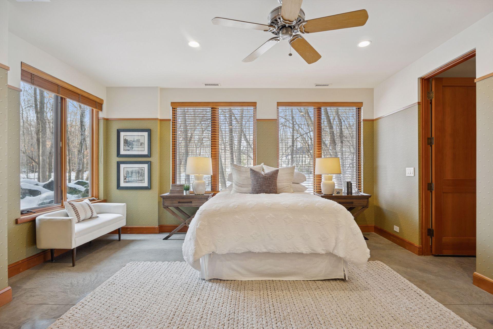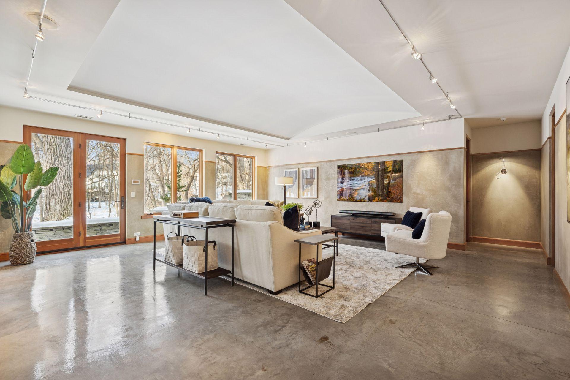 Custom Streeter Design/Build on a completely private 1.2 acre site of woods, manicured paths and courtyards in coveted Cottagewood. Where mountain resort meets sleek modern architecture, enjoy a masterful combination of elements; wood, stone, metals, warmth and natural light. A rare combination of grand yet intimate spaces for large and small gatherings boasts 15’ vaulted ceilings with beams reclaimed from a Northern Minnesota bridge. From the living and dining rooms, 30 feet of glass doors walk out to the bluestone courtyard with in-ground pool, bath, woodburning fireplace, and lounge. Just outside the courtyard, a screened gazebo for perfect for relaxing and nature views. A chef’s dream kitchen includes SubZero refrigerators and beverage drawers, 48” Wolf range and double wall ovens, Asko dishwashers, miles of soapstone, marbles, customized cabinetry, walk-in butler’s pantry, and dual islands. The sumptuous owner’s quarters overlooks acreage and a custom designed waterfall. Amenities include a fireplace, gorgeous private bath, and walk-in closet with wall of built-ins and laundry hookup. An executive office and handsome family room complete the main level. Three generously sized secondary bedrooms in the walkout level feature an ensuite with steam shower plus Jack and Jill bath, a study/hangout, recreation room, and wine cellar. Superb mechanicals include in-floor heat throughout; new cedar shake roof. The oversized, triple heated garage has two walls of storage closets, floor drains and a wash sink. Have it all in this unmatched location a short walk to the lake. Enjoy Minnetonka schools, downtown Excelsior shops and restaurants. One of a kind gem!