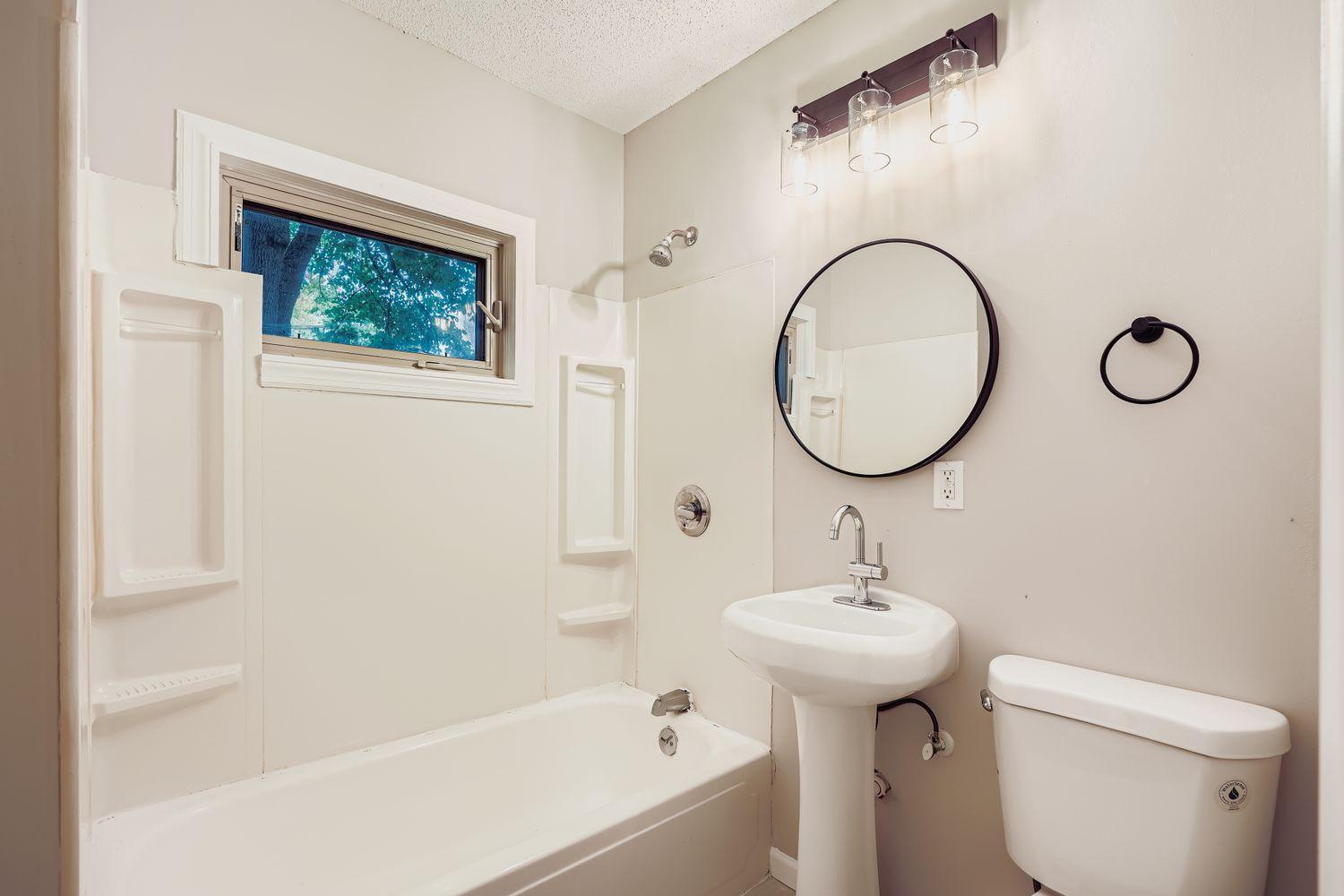 bathroom with a beautifully tiled shower. The kitchen offers a charming window over the sink — perfect