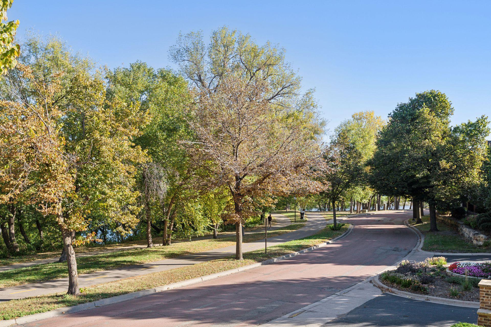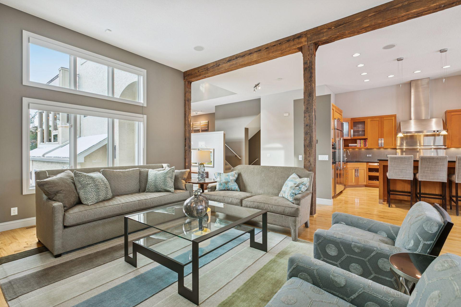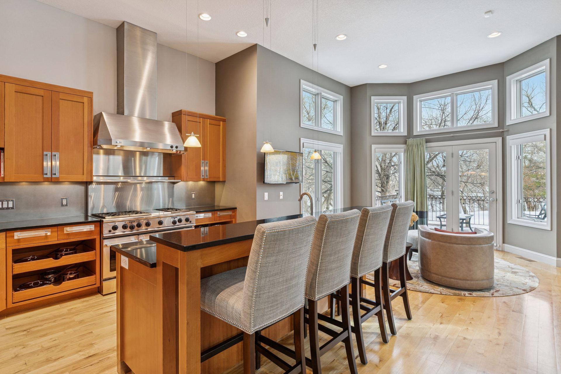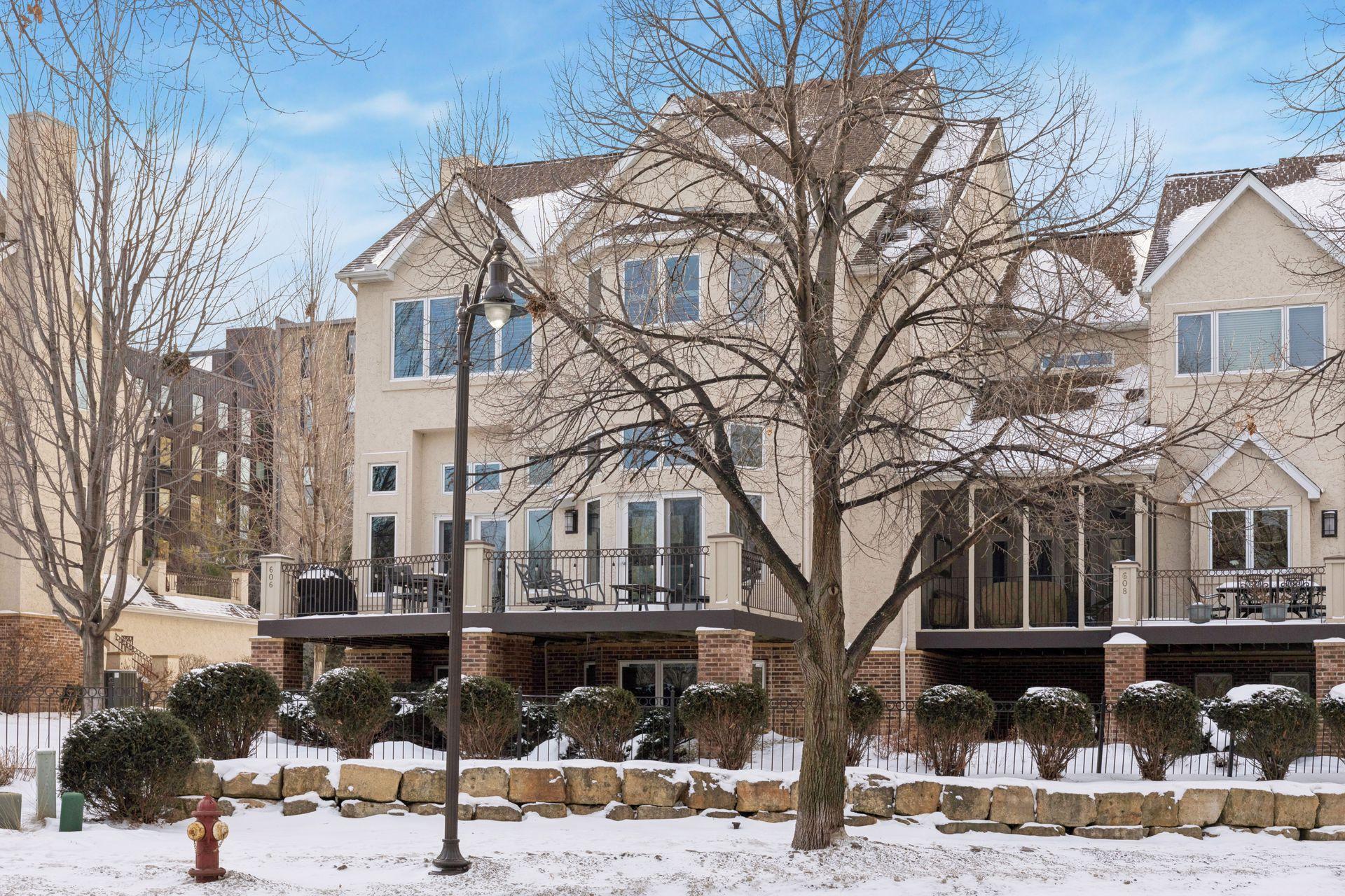 Welcome to The Landings, a rare riverfront townhome community along the banks of the Mississippi River in downtown Minneapolis. Lovingly cared for and thoughtfully updated, this architecturally distinctive residence offers over 4,000 square feet of beautifully maintained living space with panoramic views of the West River Parkway and Mississippi River. The spacious open, light-filled main floor is both welcoming and thoughtfully designed. Reclaimed timber beams from the historic Warehouse District anchor the living and dining spaces, complemented by hardwood floors, contemporary lighting, and a stone- trimmed gas fireplace. A large deck with gas grill hookup opens to sweeping riverfront views and ever-changing scenery, creating seamless indoor-outdoor living. The gourmet kitchen features custom Douglas fir cabinetry with extensive storage and display spaces complemented by granite countertops, large center island, double sinks, and GE Monogram six-burner range with double oven. Perched above is a cozy family room with attached cedar paneled three season porch featuring views of the historic North Loop. Upstairs the sprawling owners suite is thoughtfully positioned to capture uninterrupted views of the parkway from both the bedroom and spa-like en suite bathroom with soaking tub. A spacious sitting area and well-organized walk-in closet complete this restful retreat. The upper level is completed by a light-filled home office featuring its own private deck. The lower level includes plenty of amenities including a guest bedroom, exercise room, laundry with folding counter, and abundant storage. Nestled away on the quiet curves of West River Parkway in the vibrant North Loop, this home is easy walking distance to some of the most exciting restaurants, shopping, and entertainment in the city, and is equally accessible to the Mississippi Riverfront, biking and running trails, and city parks. This home is perfect for the discerning purchaser who knows they need not compromise between space and location, comfort or quality. Please see supplements for extensive updates and maintenance records.
