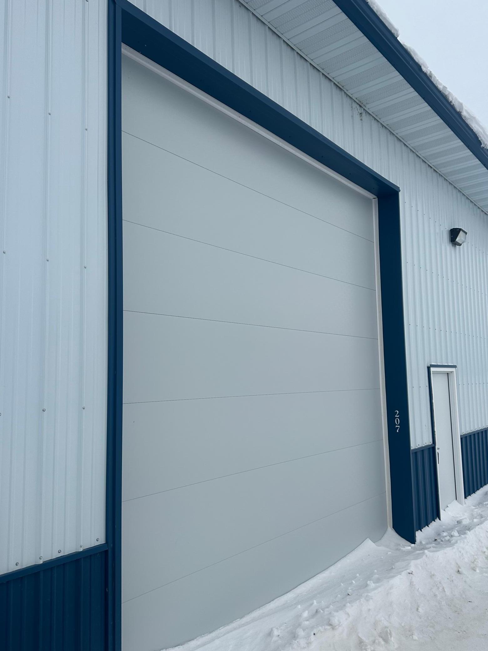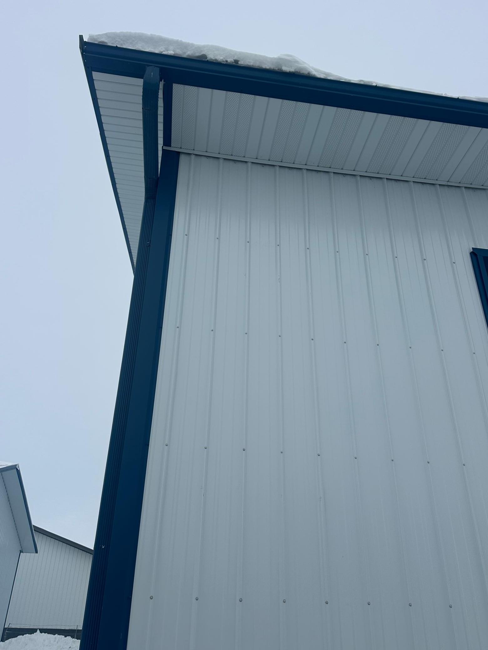 Exterior finishes include Classic Rib 26-gauge steel in Dark Blue and Brite White, all backed by a 40-year paint warranty. Each unit includes 14' x 16' insulated overhead doors (Midland 2" Energy Saver Series) with torsion springs, PVC weather stripping, radius track and inside slide locks. Gutters and downspouts on both sides help maintain proper drainage.