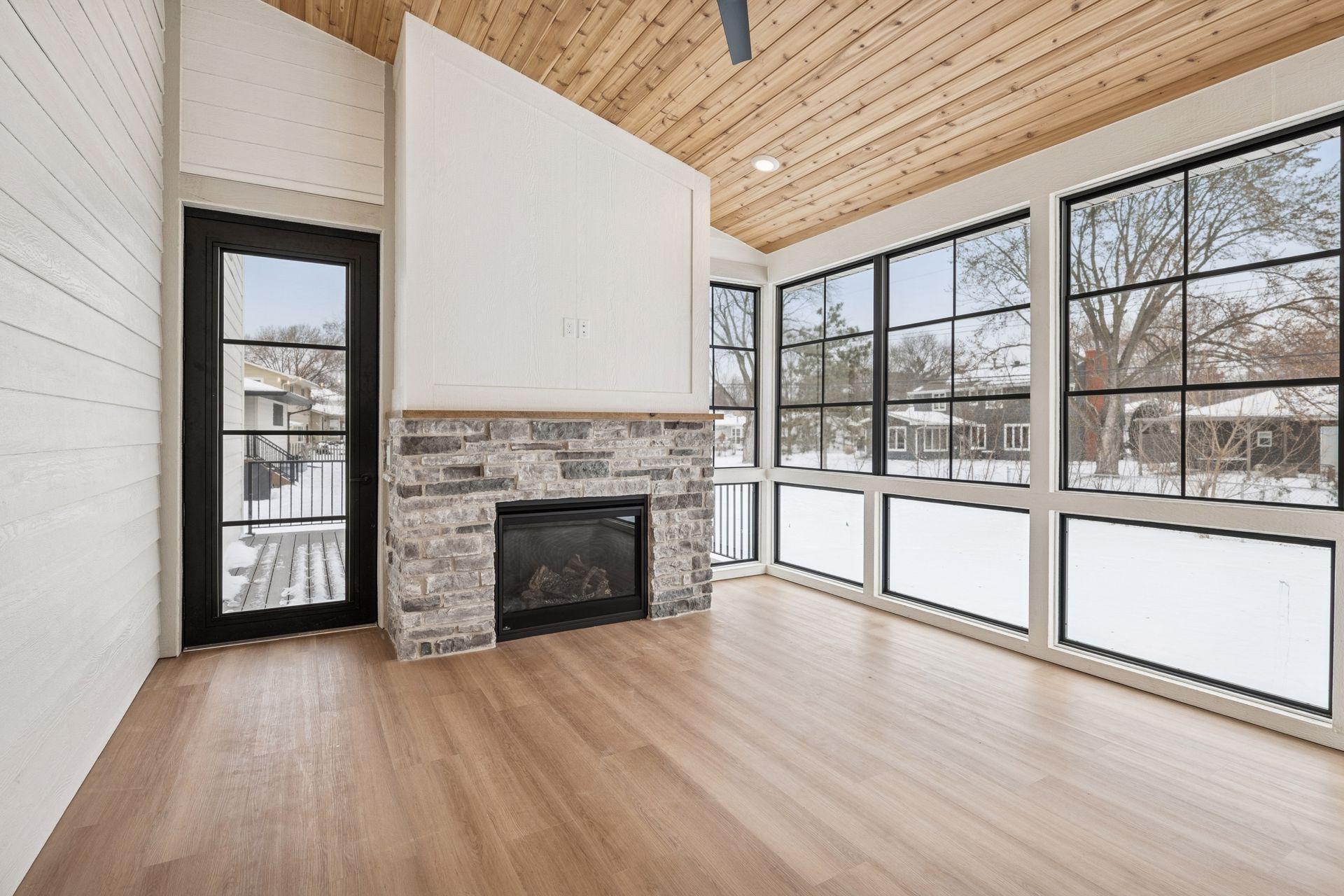 The main level features an open-concept kitchen and great room, formal dining with butler’s pantry, private office with custom built-ins, and a stunning 3-season porch with fireplace overlooking the backyard. Upstairs, find four spacious bedrooms including a vaulted primary suite with spa-like bath and walk-in closet. Two bedrooms share a Jack & Jill bath, while the fourth has its own bath. Convenient upper-level laundry.