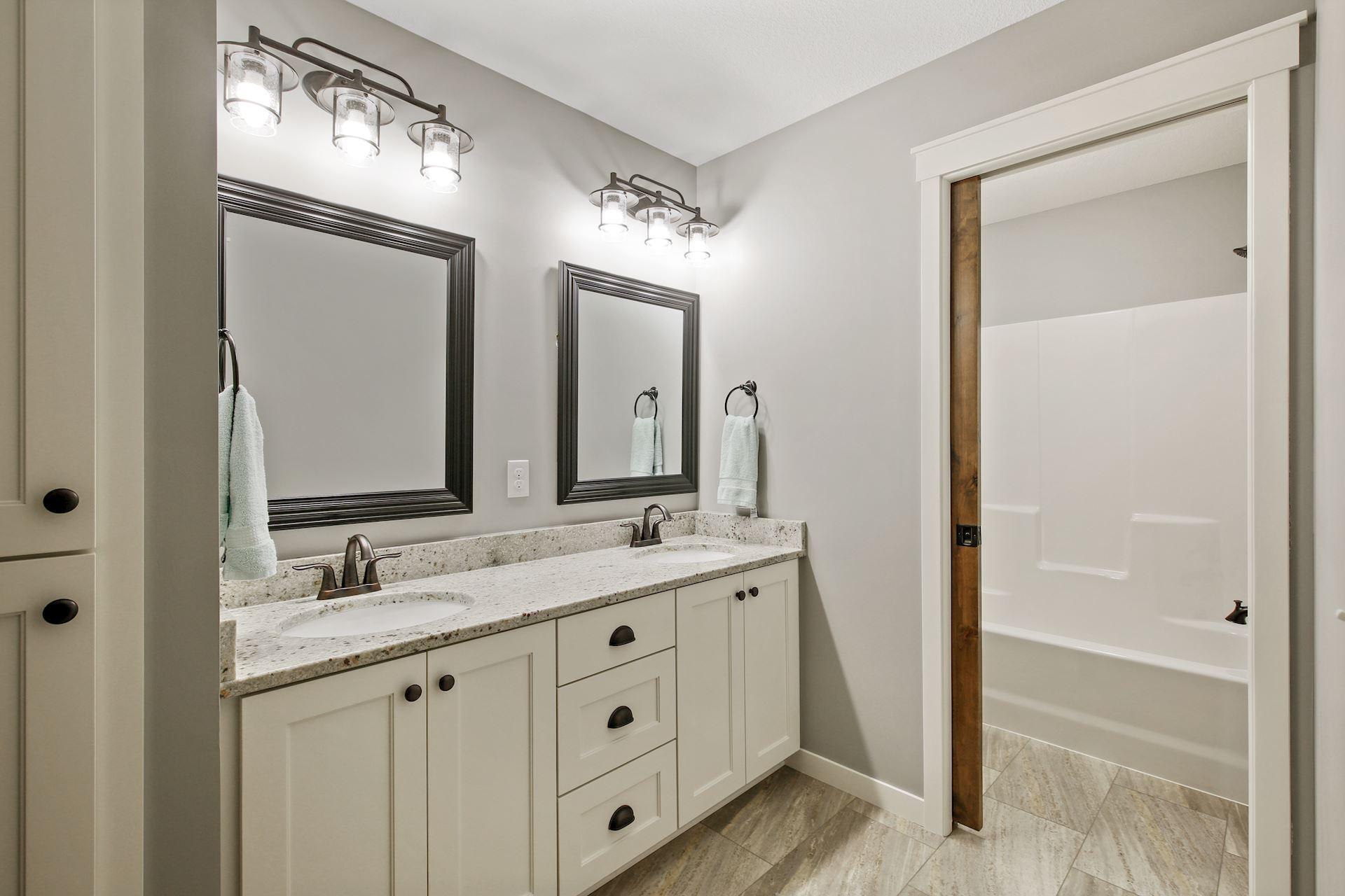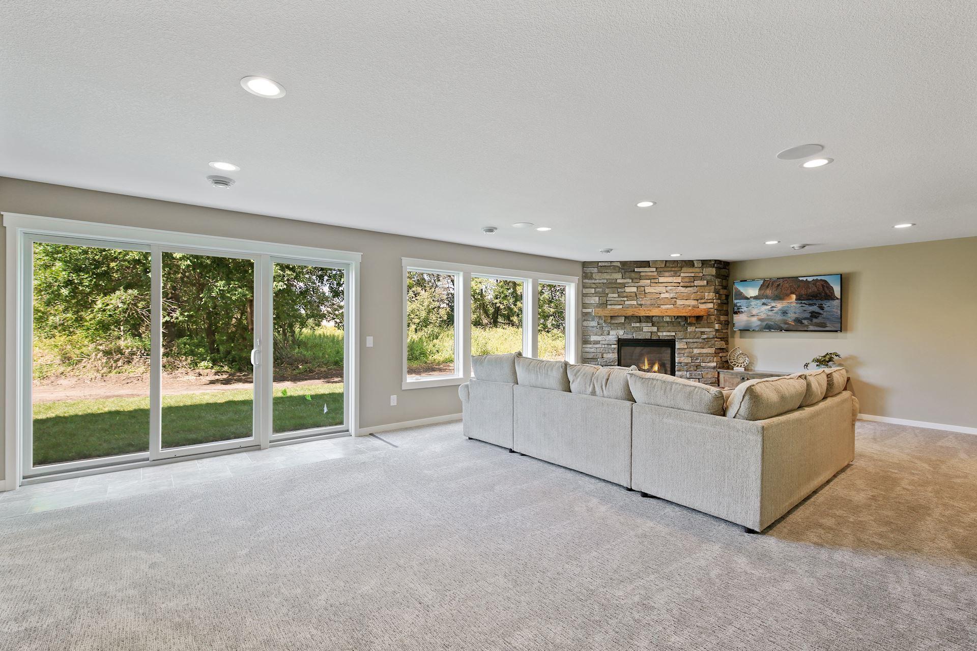 The open concept main level features a generous primary suite, a second bedroom with a walk-in closet, and a gourmet kitchen that flows into a vaulted great room. A striking stone fireplace and custom built-ins add warmth and character, while the adjacent dining area leads out to a fully covered, maintenance-free deck, ideal for enjoying Minnesota’s changing seasons in comfort.