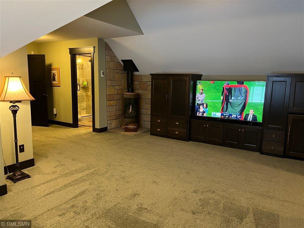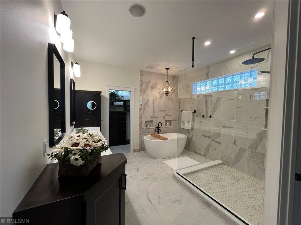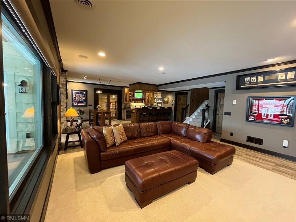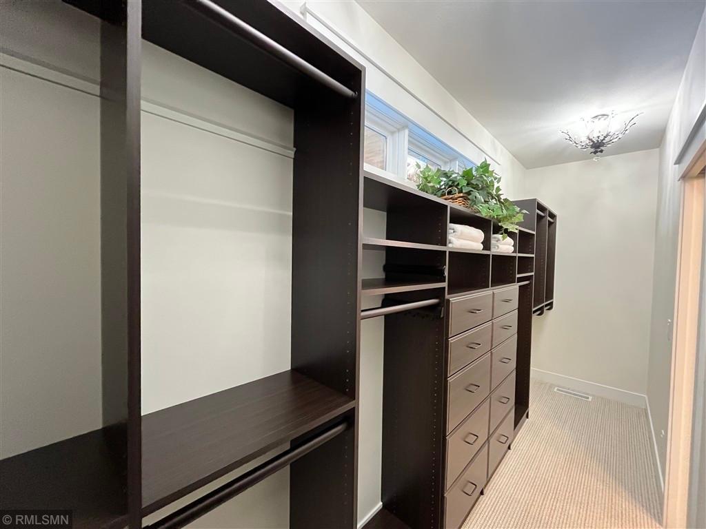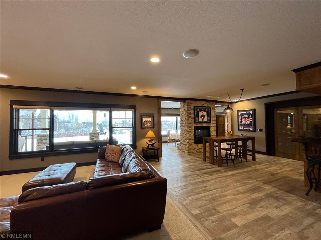 Exquisite custom home in the highly sought-after St. Croix’s Sanctuary neighborhood in Lake Elmo. With approximately 6000 sf of finished space, this refined luxury walkout rambler residence has been meticulously maintained. It features 5 bedrooms, 5 bathrooms, 3 fireplaces, office/den, bonus room, exercise room, and 4-season porch. Potentially up to 8-car garage with 4-car heated garage on the street level currently and an additional 4-car heated garage-equivalent spancrete space below; I-beam rough-in already for future garage door (the space is currently used as a workshop and exercise gym). The home is situated on a 0.8-acre elevated site, complete with extensive landscaping. The south-facing vintage point offers commanding view for all-season bird watching (in the backyard pond) as well as endless views of the valleys in the surrounding Lake Elmo and Stillwater vicinities. Whether it is hosting family, cheering on a ball game, or simply sipping morning coffee and/or watching the hot air balloons floating by in the autumn afternoon - this is the perfect place to enjoy everyday life in style. The interior of the house strikes the ideal balance between quasi-rustic charm and modern comfort: gleaming hickory hardwood floor, stunning knotty alder coffered boxed ceiling, bold stone accent walls, cozy radiant floor system covering 4600 sf (entire basement and both upper and lower garages), detailed custom tilework, woodwork, crown molding, and cabinet, culinary chef’s kitchen with high-end stainless steel appliances, built-in speakers, hardwired ethernet and coax cable lines in every room, spa-like primary bath, dedicated exercise room / flex room, sumptuous 700+ sf of guest bedroom suite, splendid sun-filled 4-season porch with vaulted T&G pine ceiling, and many more. All these blends seamlessly to the master-designed outdoor space, combining with extensive boulder walls, two patios, a custom-designed grilling gazebo, lush green grass, manicured shrubs, mature trees – this is outdoor living at the finest. For those who want to venture out, the development has its own trails and is also within walking and/or biking distance to Gateway Trail and Brown’s Creek Trail. The home is centrally-located in northeast Lake Elmo with easy access to freeway, shopping, golf courses (five within 5 square miles), and historic downtown Stillwater.
