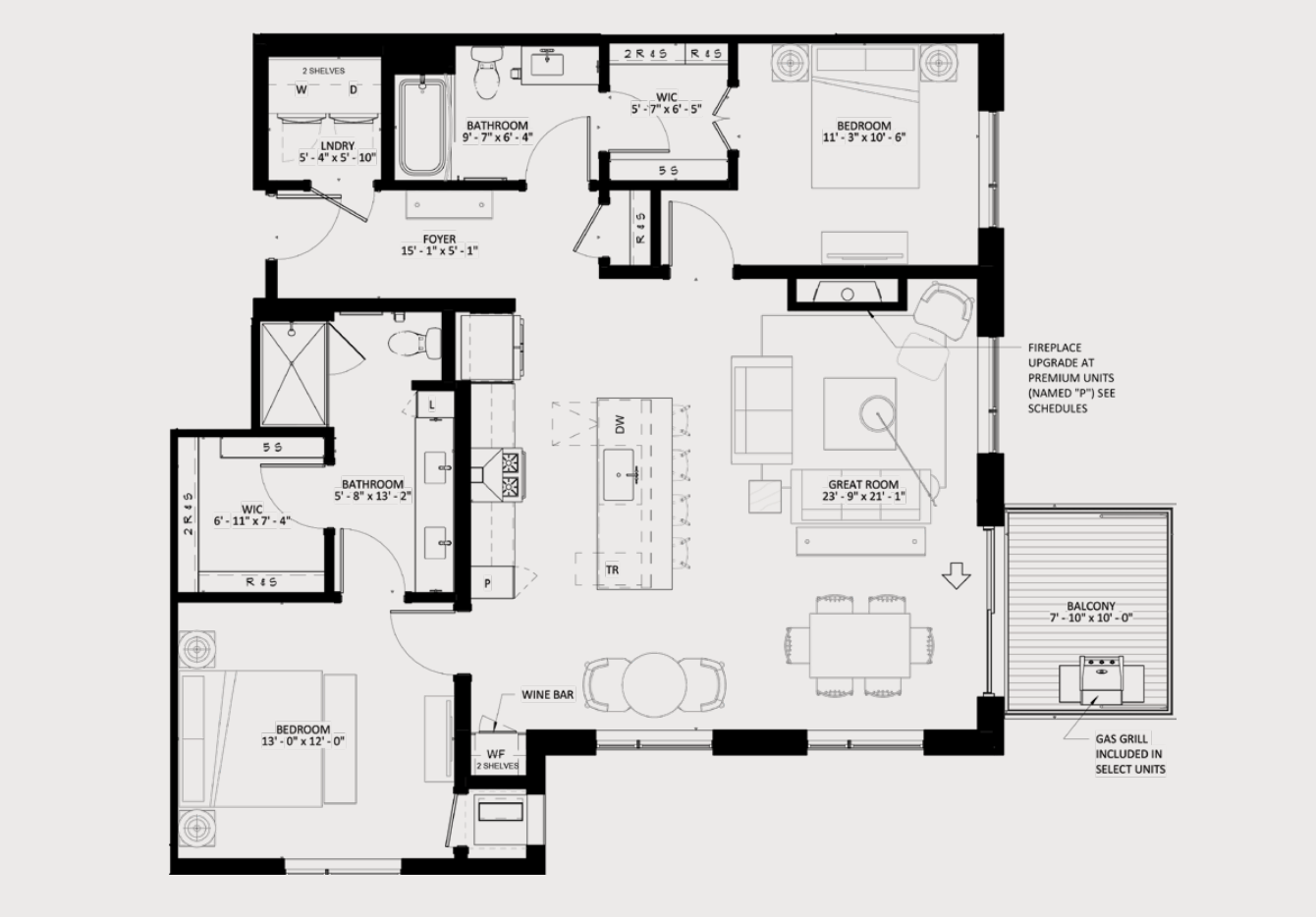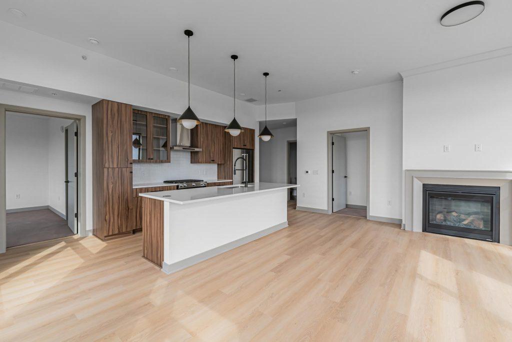 Welcome to The Winn! This expansive 2-bedroom, 2-bath residence spans 1,394 square feet and features an exclusive corner layout with generous living space. The Douglas floorplan includes a dedicated dining area with modern chandelier, gourmet kitchen with designer hood and island, and a walk-in laundry room with folding counter. Select homes offer a private balcony with gas grill and a modern gas fireplace.