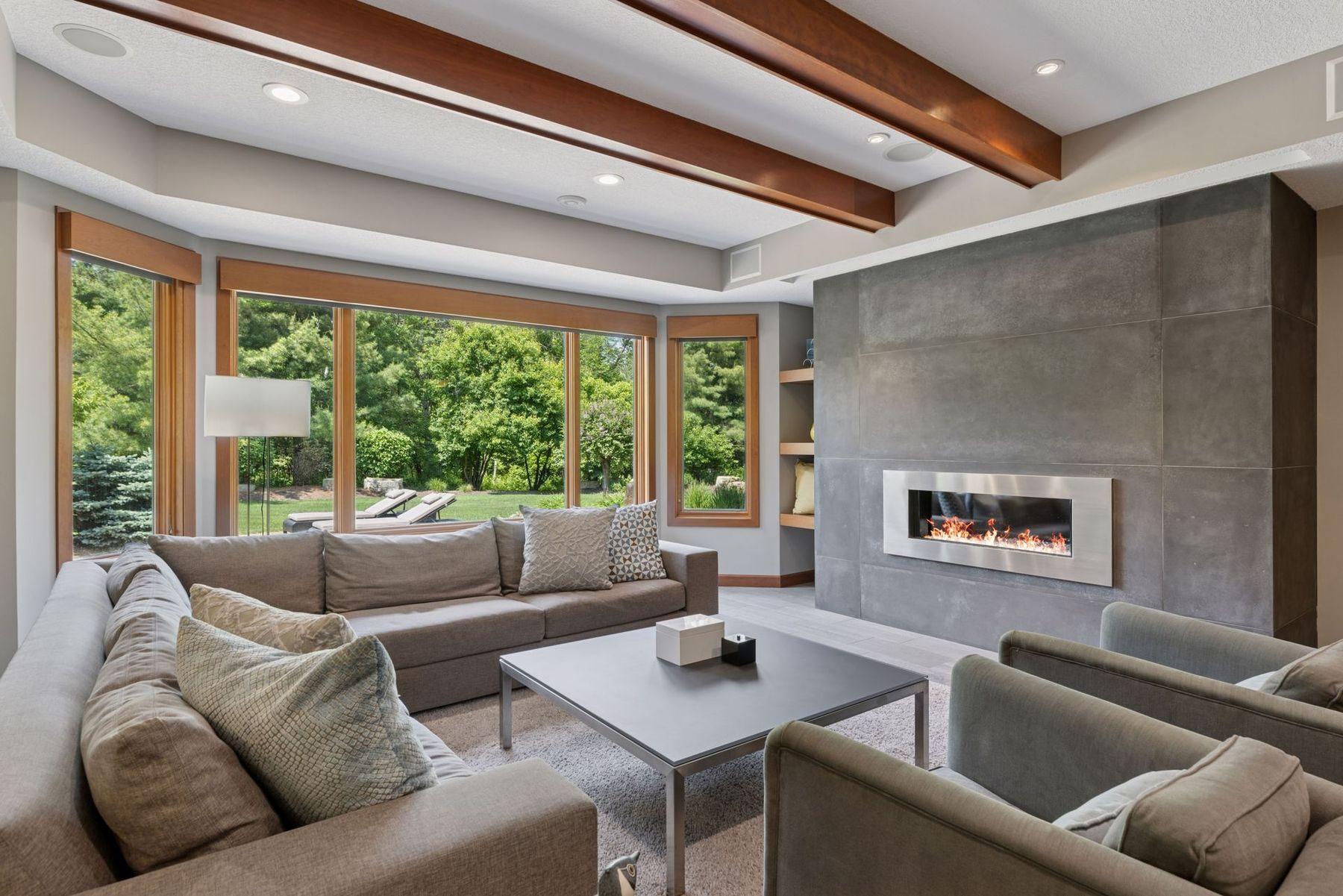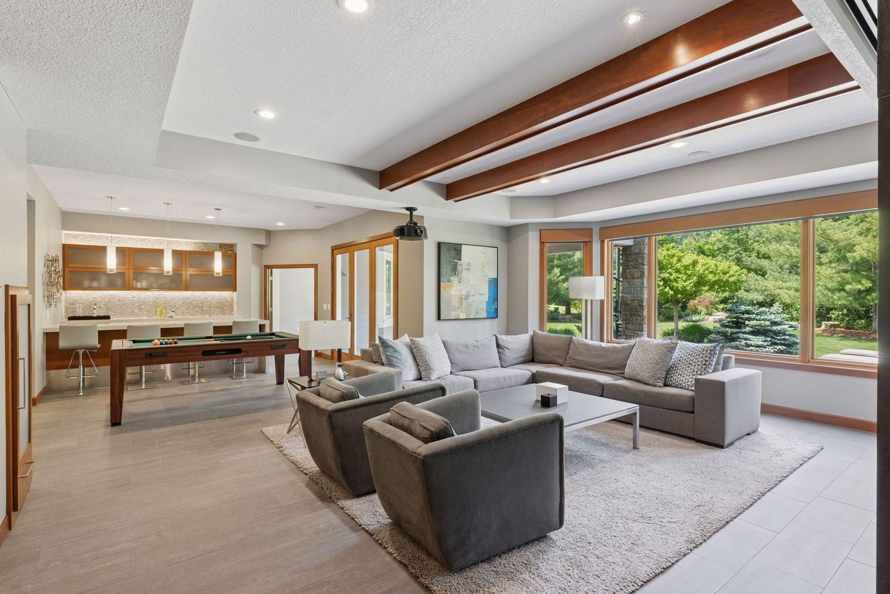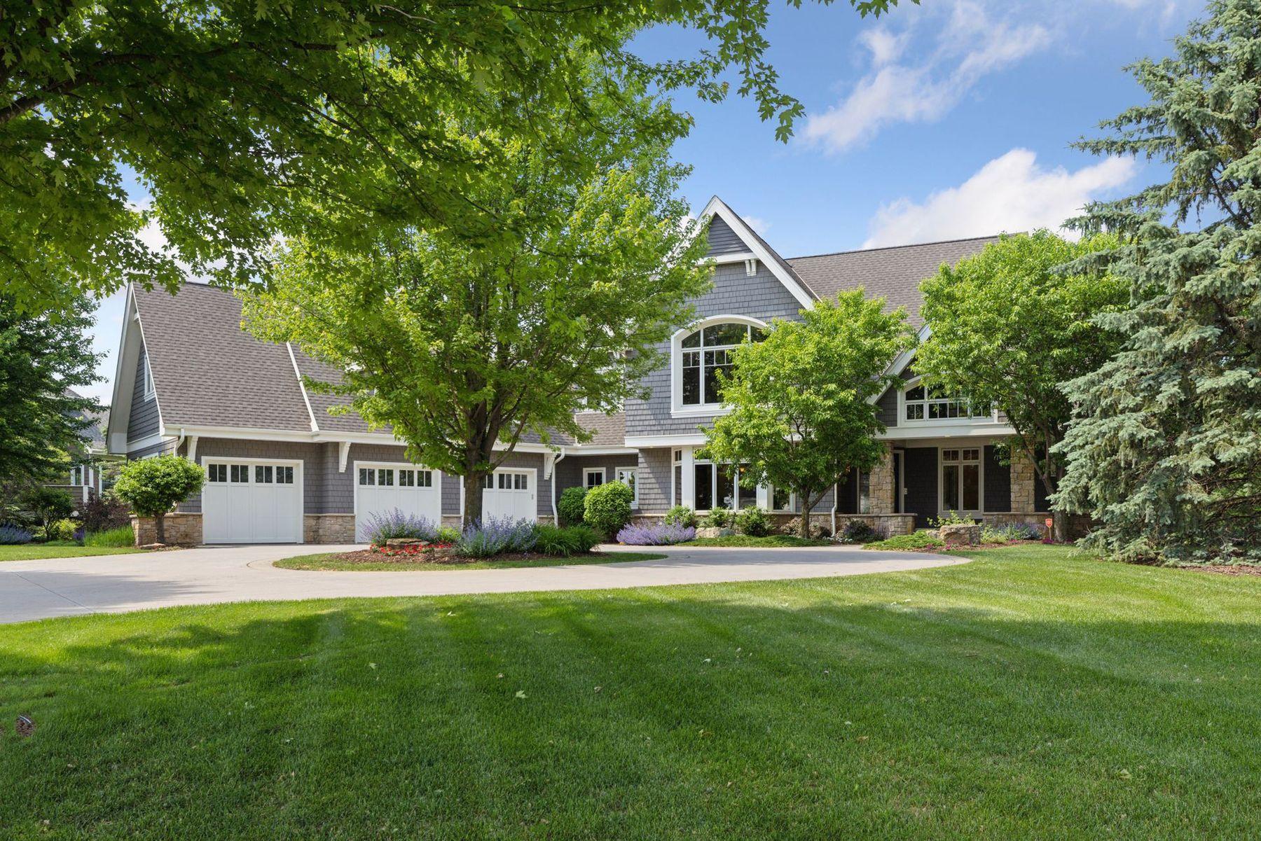 Exquisite custom craftsmanship by Anderson Sorenson sets the tone for this breathtaking estate, where timeless elegance meets modern sophistication. Nestled on a manicured lot with stunning curb appeal, the home is framed by a circular driveway and showcases a prominent peninsula surrounded by lush, professionally designed landscaping. Step inside to a bright and spacious floor plan bathed in natural light, where wide-open rooms reveal serene, treetop views from nearly every angle, and rich cherry millwork and premium finishes lend a warm, refined ambiance throughout. The showstopping great room is crowned by a dramatic two-story, barrel vault ceiling with coffered beams and oversized windows, anchored by a monumental, floor-to-ceiling fireplace made of real stone. For entertaining, host in grand style in the massive formal dining room or gather in the gourmet kitchen, where a two-tier center island provides extra seating, and beautiful cherry cabinetry is accompanied by top-tier appliances. Plus, an informal dining nook is cozy and comfortable with its wall-mounted gas fireplace and more of those priceless views through walls of windows. The main-level Owner’s suite offers luxurious tranquility with its spa-like en suite and a walk-through, walk-in closet complete with a custom organization system; and you’ll be sure to appreciate a functional mudroom off the oversized, three-car garage, which provides laundry, a walk-in closet, and extensive cabinetry and counter space to organize the day’s mess. Upstairs, an open catwalk lends expansive views of the entire home and leads to an enormous office, impressive family room with a gas fireplace flanked by built-ins and access to a balcony deck, two bedrooms with walk-in closets, and a full bath. And if you’re looking for more options to entertain, the lower level is a dream come true with its theater system, incredible stamped concrete gas fireplace, full wet bar with a modern design and bonus game and exercise areas, not to mention two additional bedrooms and baths, perfect for guests. The walkout then leads to a generous patio and maintenance-free deck above in one of the most breathtaking and private backyards you’ve ever seen…and with plenty of room for a pool! Located near Lake Elmo Park Reserve with quick access to I-94 and Woodbury amenities, this home offers unmatched privacy, beauty, and convenience.